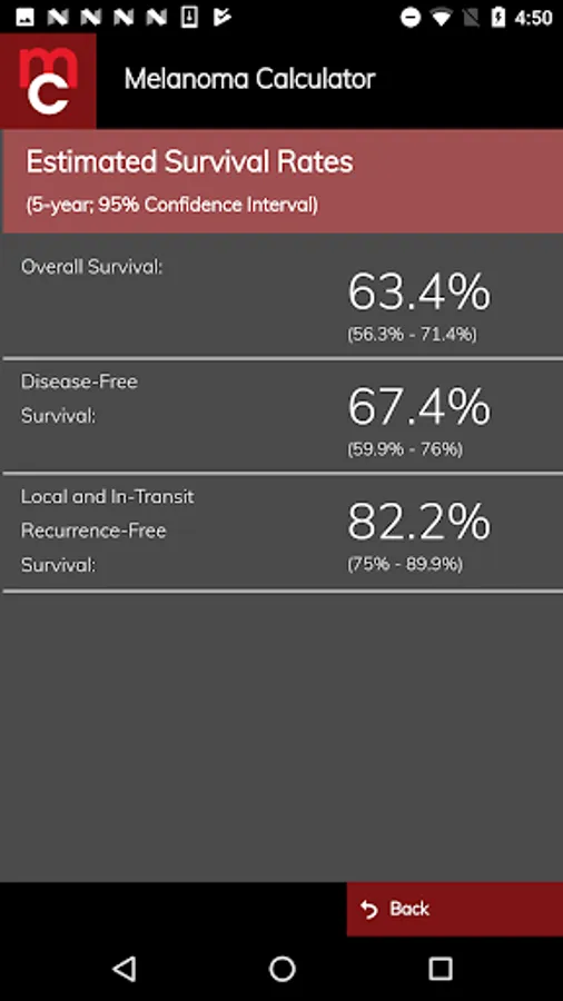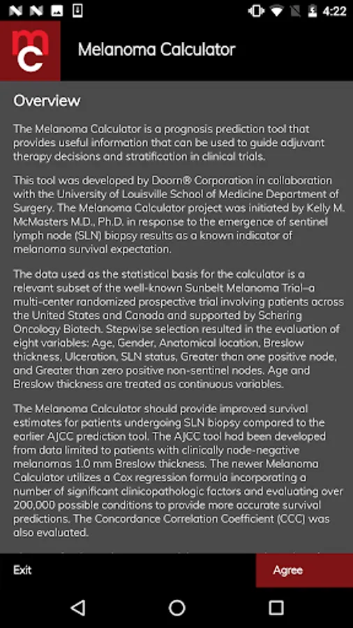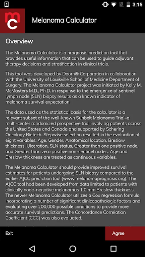The Melanoma Calculator is an improved prognosis prediction tool designed for use by medical professionals in the calculation of survival expectation for melanoma patients staged by sentinel lymph node biopsy. Based on the studies described in the publication referenced below, it is more accurate than previously used prediction tools. It is based on research that accounts for a broader range of variables and that is designed to account for a far greater number of possible conditions. The Melanoma Calculator was authored by Doorn Corporation in collaboration with the University of Louisville School of Medicine Department of Surgery, and Kelly M. McMasters, M.D., Ph.D. a nationally recognized authority in the diagnosis and treatment of melanoma.