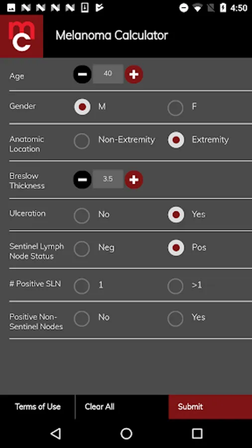 IMPORTANT NOTICE: Melanoma Calculator should not be used by anyone who is not a medical professional for the purpose of diagnosing or treating melanoma. Only a medical professional can diagnose or treat melanoma.
