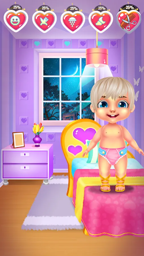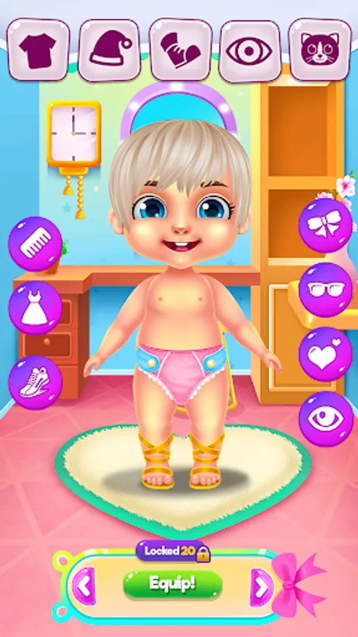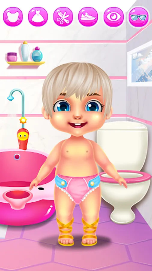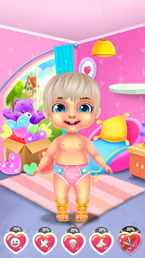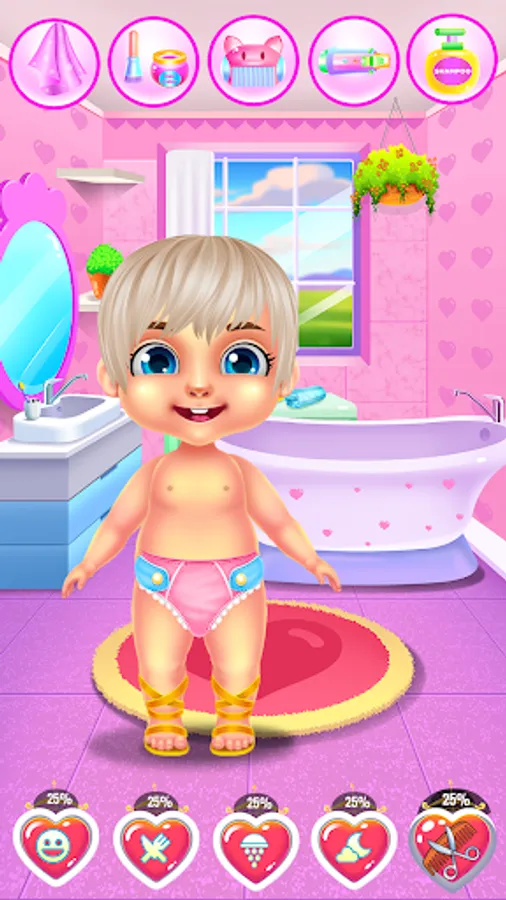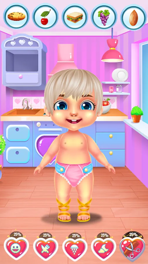 It's time for a love adventure with this amazing baby game where you get to spend some moments with the Baby Cupidon. Help this heart hunter to complete his daily chores while you're both having a great time together. The first thing you need to do is to take him a bath. Fill the bathtub and let the baby boy get in so you can wash him properly. Use the sponge to wash him and don't forget to use suitable products for his hair, face, and the rest of the body. Once he is fresh and clean you have to continue the care process. The next step is the feeding process and you will have to prepare something delicious for your Cupidon baby boy. Cook together something yummy from the book with his favorite recipes and get the food ready to be served on the table. Complete his meal with some tasty treats. Now that his needs are fulfilled and you can go into the playroom where multiple games await. You can even help him do a workout. Follow the instructions for the exercises and enjoy the playtime. Take your boy into the dressing room and pick the outfit you think will fit him the most. Combine clothing items and different colors to get the desired look. You can even add pretty accessories like sunglasses, a crown, and maybe some crazy stickers. His outfit is completed and you should continue the fun with the candy game that comes incorporated in here. The main rule is to mix and match the fruits and candies that look the same to win. All that left is to put Cupidon to sleep so he could regain his energy after such a joyful day.