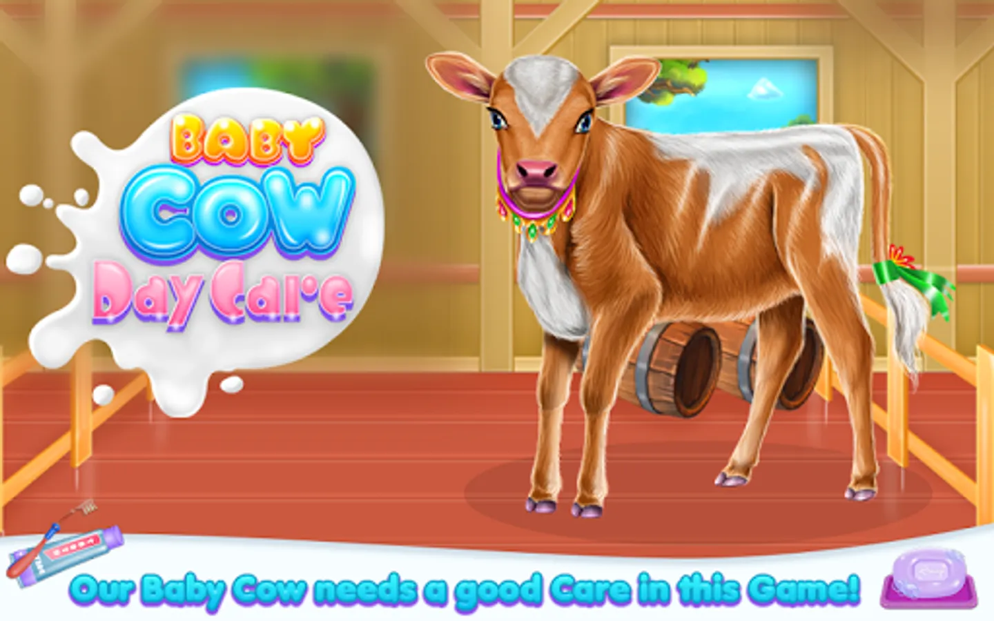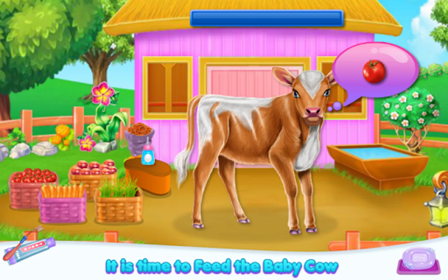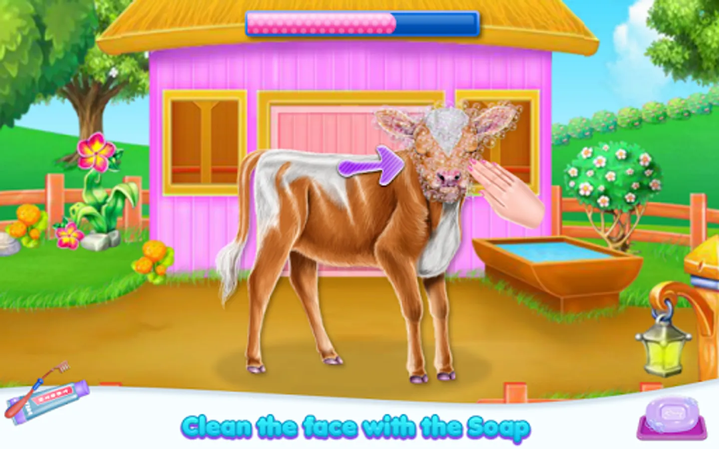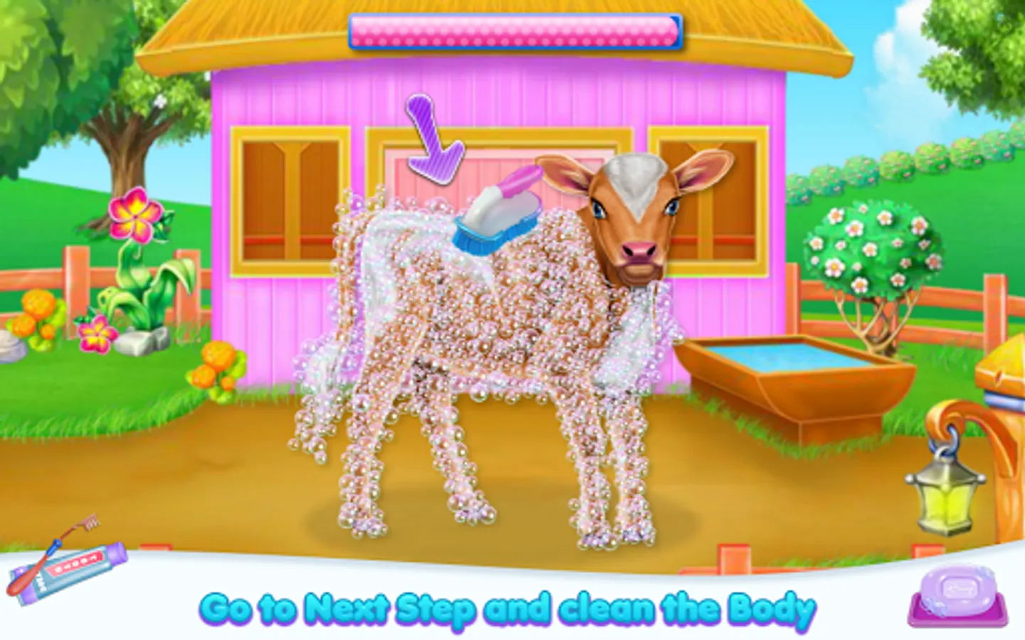 Welcome into the animal world and come to explore the diversity of a cow's caring taker. Clean, design and feed as for a real person. So this is how your job as a cow owner begin. As you've seen the fur is not looking amazing and you are about to clean it and make sure the little cow is happy with the new one. Start with the part where you wash her teeth and make sure they are stronger and ready for the eating part. Now you have to remove that layer of dirt that spread all over her skin, then make sure you apply some shampoo to clean the dust gather on it. Rub until the fur is going to have a brighter color and then wash the bubbles to see the results. Keep it up and try to go to the next step which includes the part where you prepare and offer food. Follow the instructions to give the right food in the suitable order. The cow is asking for it in a bubble image and what you spot you have to bring, so in this way, the baby will have his tummy fulfilled and will be for sure happy. Once the caring phase is over you will have to deal with the dressing up. Use your creativity and add pretty accessories to complete this cow look.