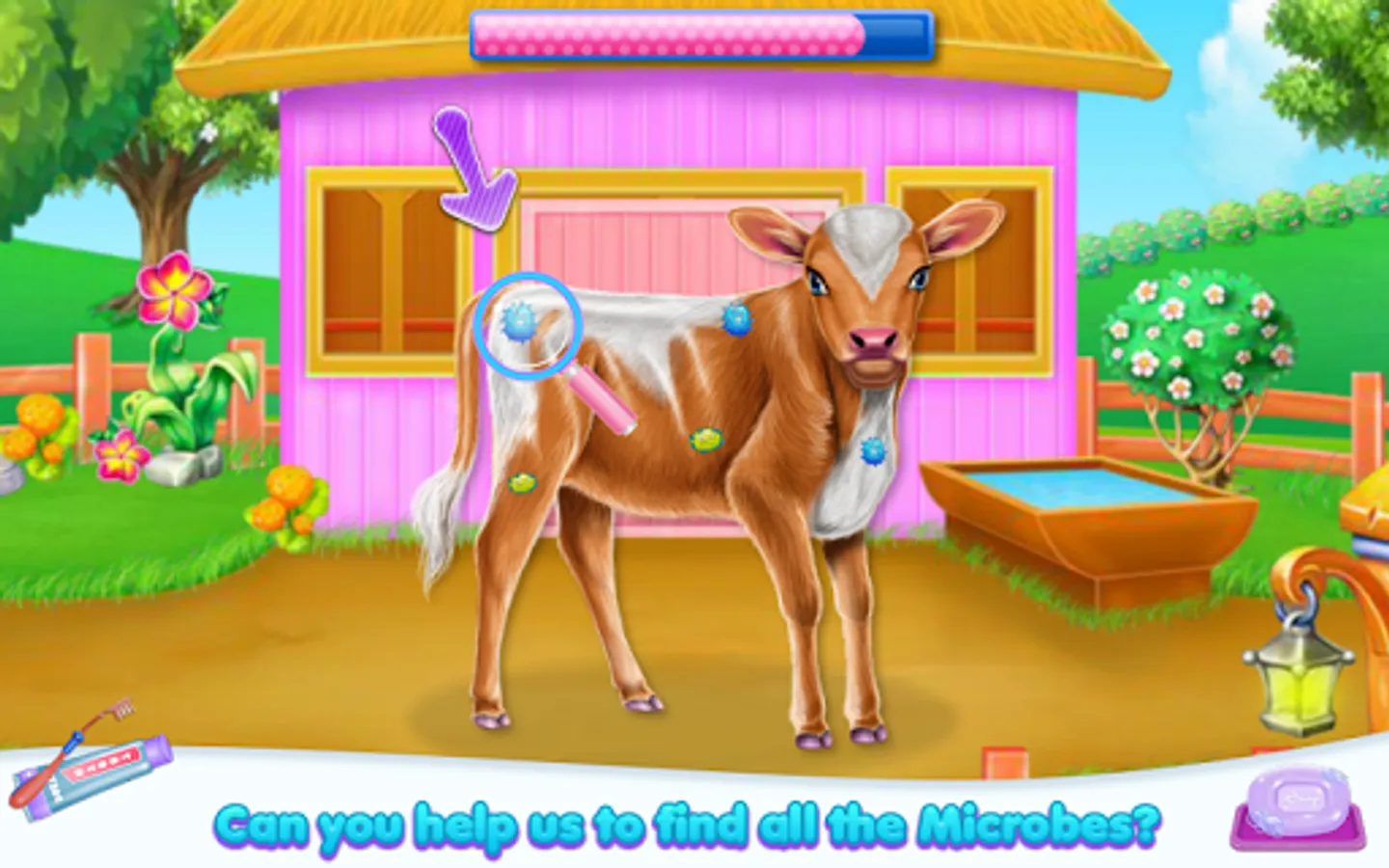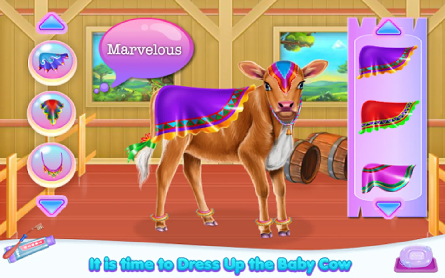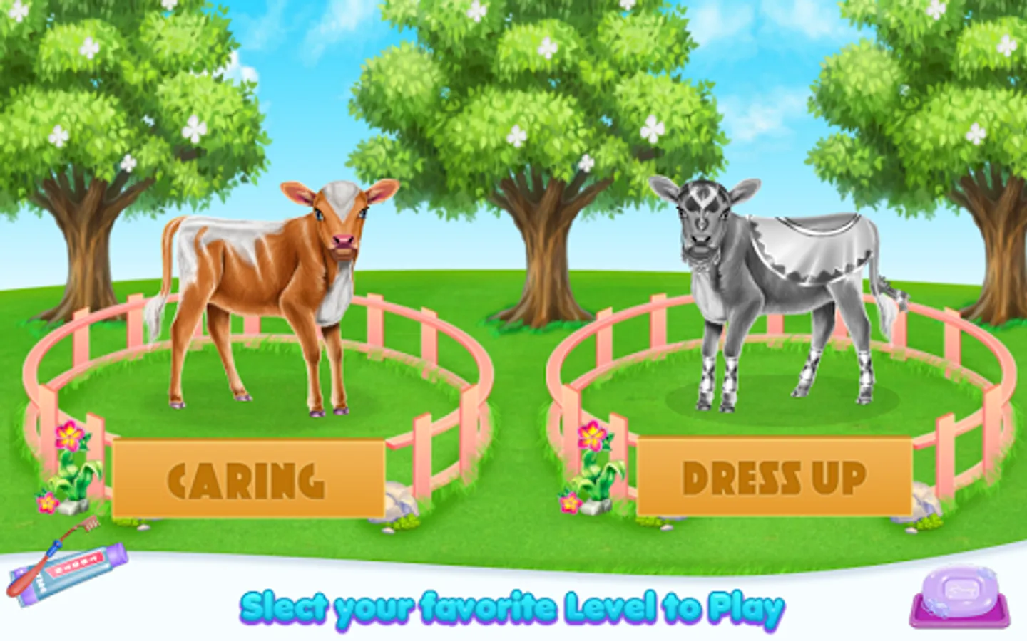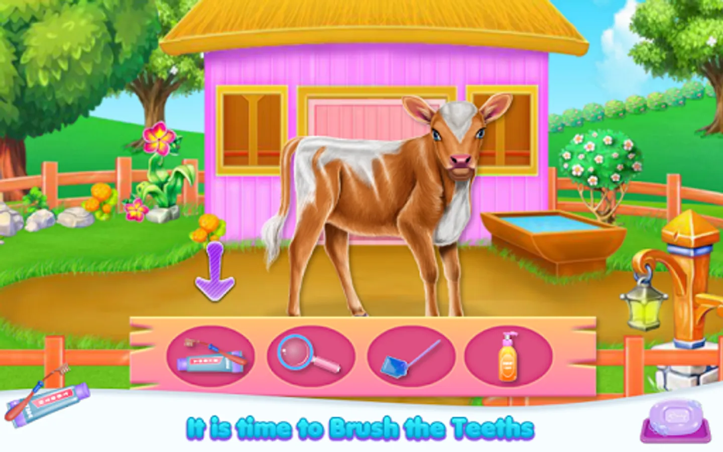 Welcome into the animal world and come to explore the diversity of a cow's caring taker. Clean, design and feed as for a real person. So this is how your job as a cow owner begin. As you've seen the fur is not looking amazing and you are about to clean it and make sure the little cow is happy with the new one. Start with the part where you wash her teeth and make sure they are stronger and ready for the eating part. Now you have to remove that layer of dirt that spread all over her skin, then make sure you apply some shampoo to clean the dust gather on it. Rub until the fur is going to have a brighter color and then wash the bubbles to see the results. Keep it up and try to go to the next step which includes the part where you prepare and offer food. Follow the instructions to give the right food in the suitable order. The cow is asking for it in a bubble image and what you spot you have to bring, so in this way, the baby will have his tummy fulfilled and will be for sure happy. Once the caring phase is over you will have to deal with the dressing up. Use your creativity and add pretty accessories to complete this cow look.