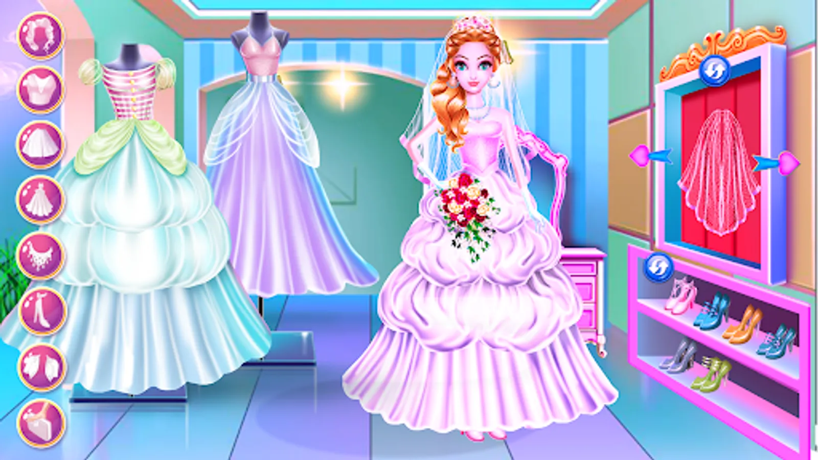 Just imagine how it would be to have an important moment in your life that is illustrated in an event you have to attend, then increase the necessity of a unique look you might need for that kind of event. Well, this girl dress up game is about to intensify those emotions for you in order to empathize with this girl you have to help out with her outfit. Gather your forces and create something stunning. Play with colors to get that desired look and stand out in this wedding game. It's her big day and you are her only hope, make her dream come true and try to please everyone with your choices. Go to the spa and pamper her hair a little bit because she needs all the relaxing time she can get. Accomplish the task you are assigned to take care of in the spa domain and do your best to create an amazing difference in her look and also you’ll get her own attire she’ll be proud of. Get a nice haircut to fit your outfit and don't forget to add some accessories to personalize the final aspect.