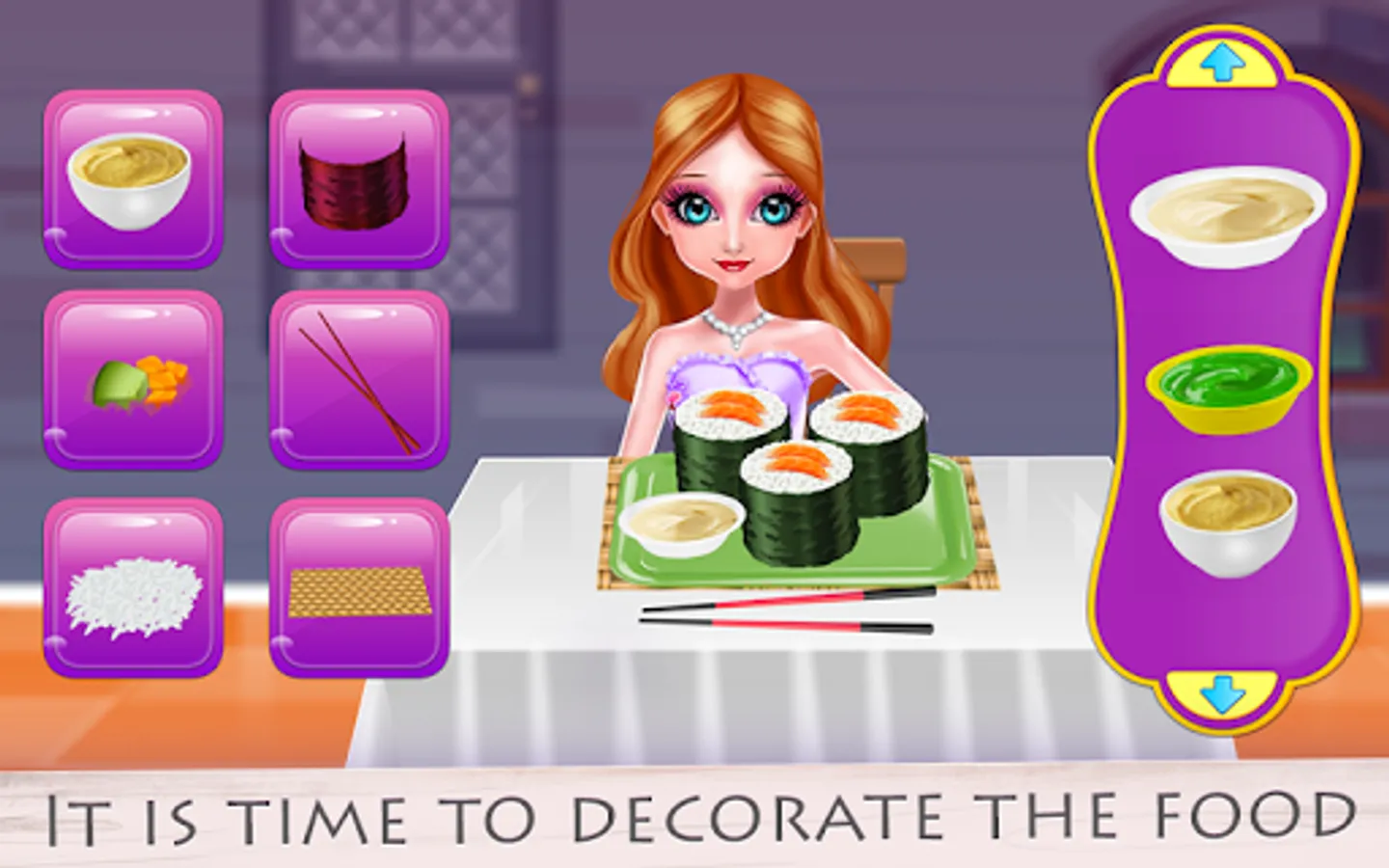 Be captured by one of these cooking games where you get to know how a delicious dish is made and what ingredients you should use for it. This time you have the chance to get into Japan's book of recipes. Your plate will have the famous sushi rolls that are a traditional meal and contain mostly seafood. Not only that you get to make from scratch this meal, but you will also go through the steps that must be accomplished in order to cook and serve this type of food. Begin this culinary journey with the most important step: providing the required ingredients. Go to the supermarket and check the list so you will buy all that it takes to make sushi. Pay at the cashier and return to the kitchen where you will perform some cleaning activities in order to be able to cook in there. Collect the garbage and throw it in the bin, the dishes must be emptied from leftovers and washed. The walls have stains that should be removed by one of the bought cleaning product. Remove the spider web and clean the countertop. In the next phase you will be cutting the needed ingredients to be ready for the rolls. Assemble of them by the recipe and place it in a special microwave. Get the sushi out when the time is up and continue with the serving part. Before you can do anything you must decorate your delicious plate to make it look more appetizing. Add colors, put on some yummy details and try to offer a tasty experience.