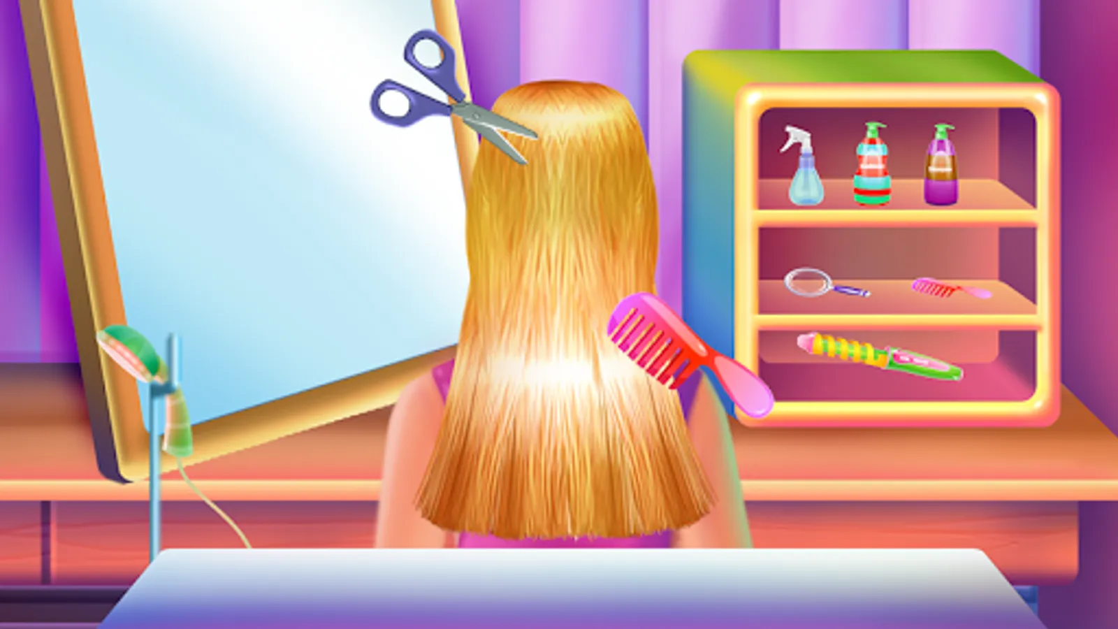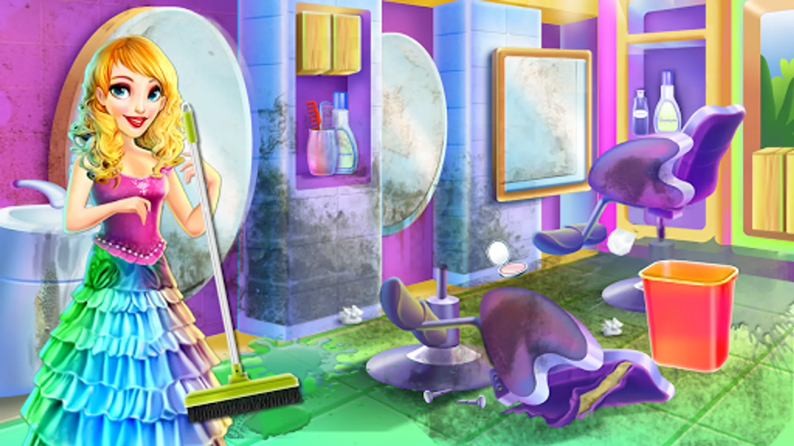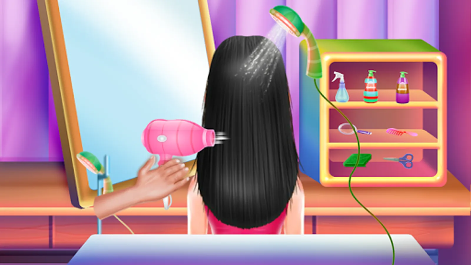 Now is easy to be chic even at home with this makeover game because you will learn step by step how to do your own stylish headdress with simple tasks. Dive in with spectacular colors and choose as many hairstyles as you like to accomplish. Whatever you choose make sure you follow the given steps and the instructions. The first thing you need to do is to prepare the working space. You will be cleaning the home salon and you will ensure a proper environment. Make sparkling floors, repair the broken things, have the walls restored and move into the hairstyling part. Now let's go to make some crazy looks. Spray the hair to be smooth and untangled then you could cut the parts that don't belong there. Wash the hair and apply some moisturizer. You might want to change the hair color too and to do that you will use a special colorant. The texture will be changed too. Use the professional devices to obtain the wished style, either is curly, straight or waved. When you wash the hair you will apply the special shampoo and rub it until the foam covers it all. Clean it, and then dry it with the towel and also the dryer to make sure all is done. Use the given pattern for the type of hairstyle and try as many as you like by playing the game one more time. The last step includes a fashion challenge. Here you just have to dress her up while you finish the entire aspect with those sparkling accessories.