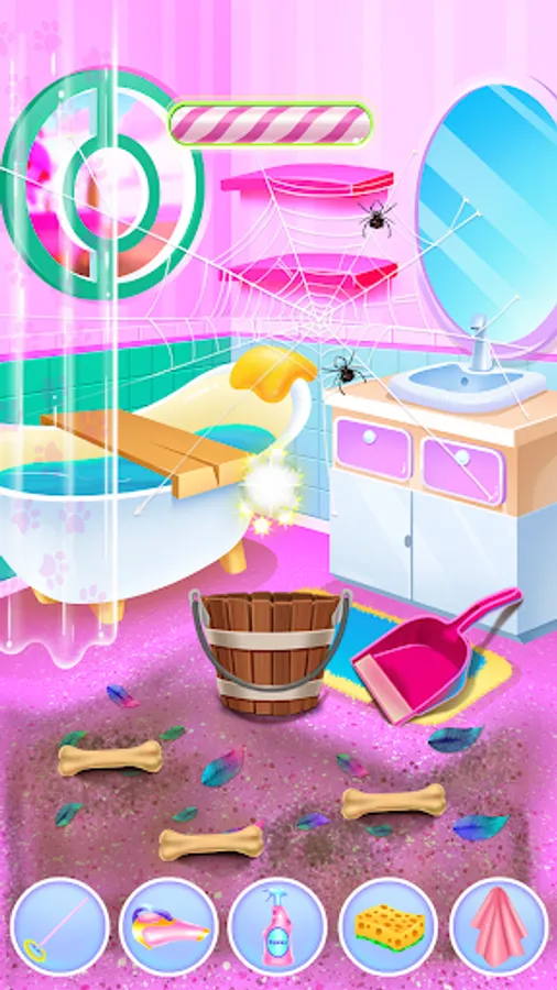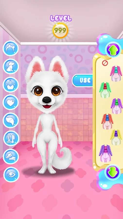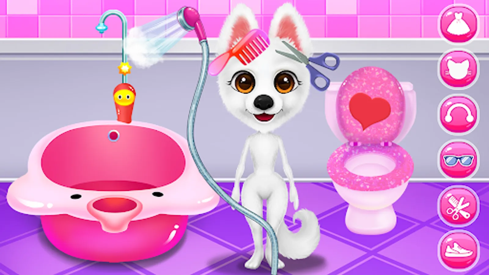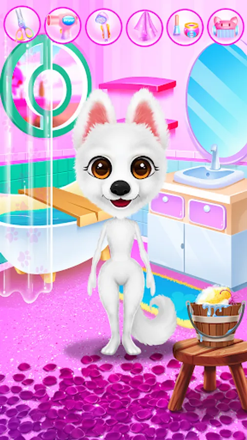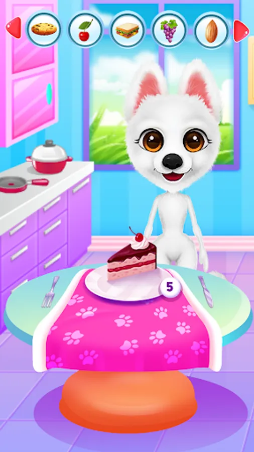 Have a wonderful time with Simba, the puppy, and learn what it takes to make him happy. Your journey in the candy world will begin once you click the play button. This animal game comes with multiple levels in which you will look after your puppy. Complete each given task and make sure you keep your pet entertained. The first step will be to help him feel fresh and clean. Take Simba to the bathroom where a relaxing spa session will get him all washed up. Have a bubble bath and make sure you wash him properly in order to be a good looking puppy. His paws need a makeover and you will have instructions that will show you how to care for them. Remove the thorns and use a treatment for his leg. Once Simba is feeling better you must clean the bathroom. Because he was so excited about the bath he made so much mess in there and now you should help him take care of it. Wash the floors, remove the stains and make sure you get rid of that dirt. After all this work, your pet is hungry and must eat. Prepare something yummy for him and serve his favorite food. Now that you've completed these tasks you will be able to move into the fashion level. In there you will create beautiful looks with amazing accessories. You can even choose the hairstyle and the shoes. Put on a headband and match it with a cute top, also you will get to pick a face sticker to complete your look. His fur is also customizable. Find the perfect outfit and continue the fun in the game section. Mix and match the candies and get a great score. Keep playing and have a great time with Simba in his Candy World.