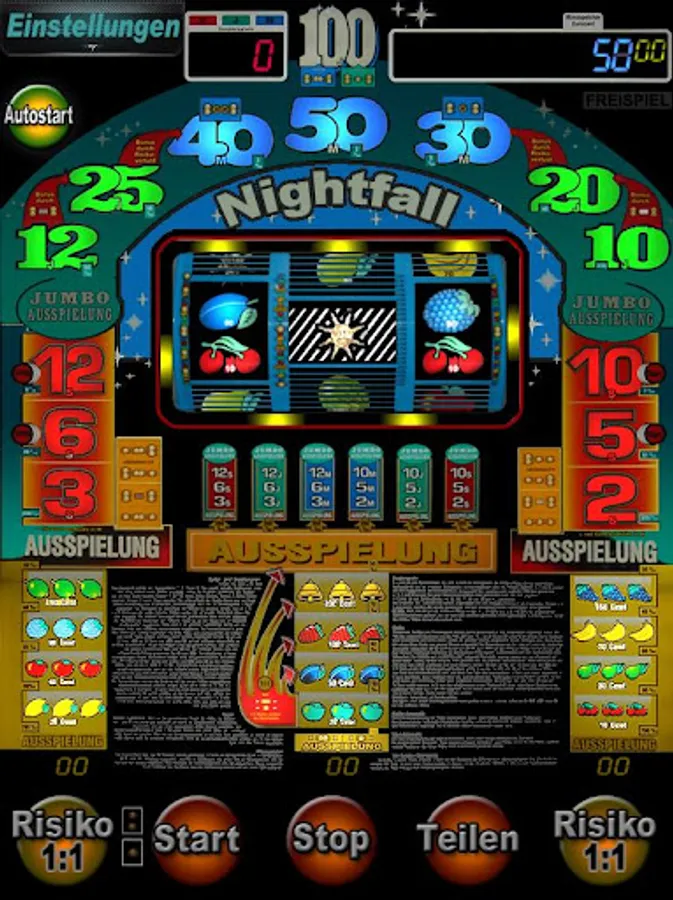 The "Nightfall" is a German game system. The three types of special games, red, green and blue make the risk thrilling. There are various lotteries, wherein the is in the middle of the interesting. The bonus arrows at the top to help better to risk to the maximum. The lower bonus game is a step increase in risk of loss.