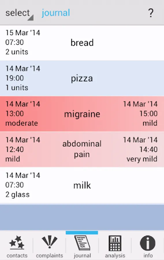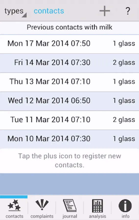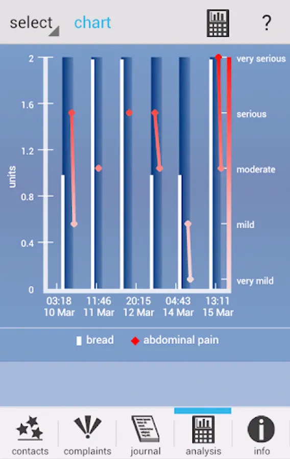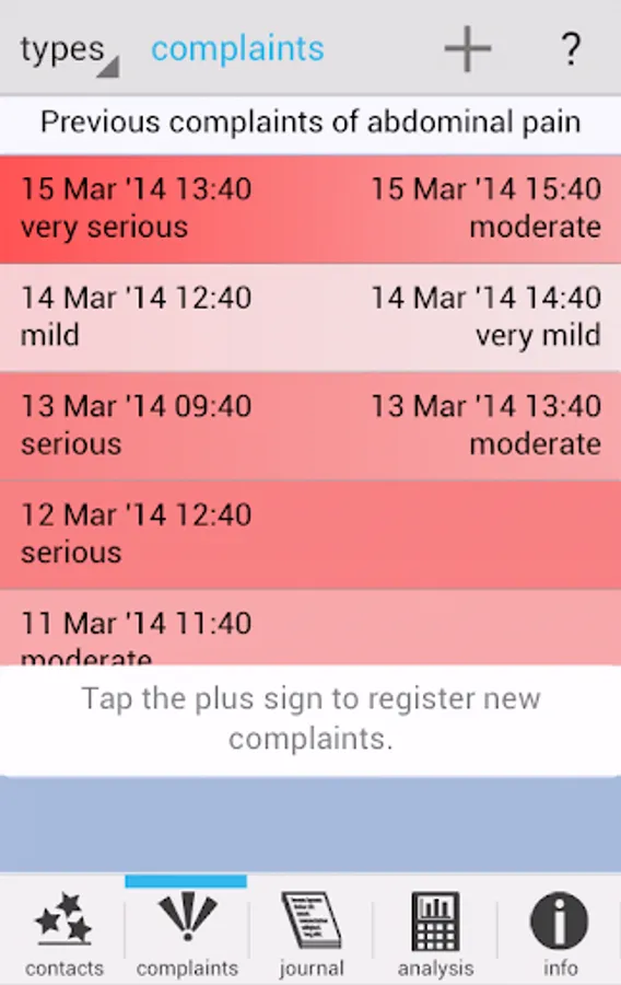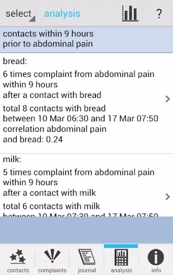 - In-depth analysis: in addition to time of complaints and contacts, you also enter the amount or intensity of contacts and the intensity or severity of complaints, and Allergy Analyzer shows the correlation between types of contacts and complaint types (if at least five combinations are found of contacts and complaints), giving you an understanding of how the severity of complaints correlate with the amount or extent of contacts.