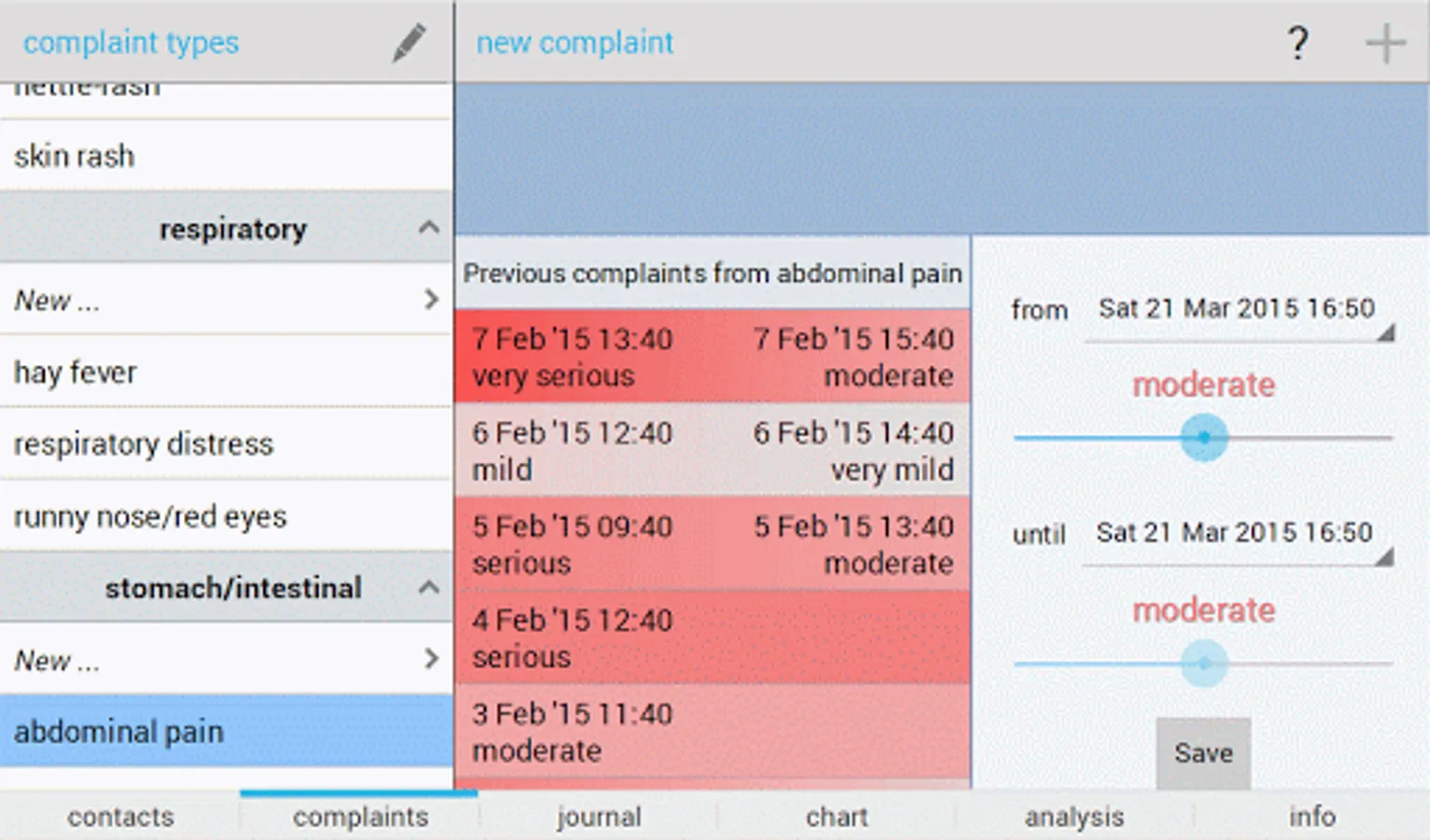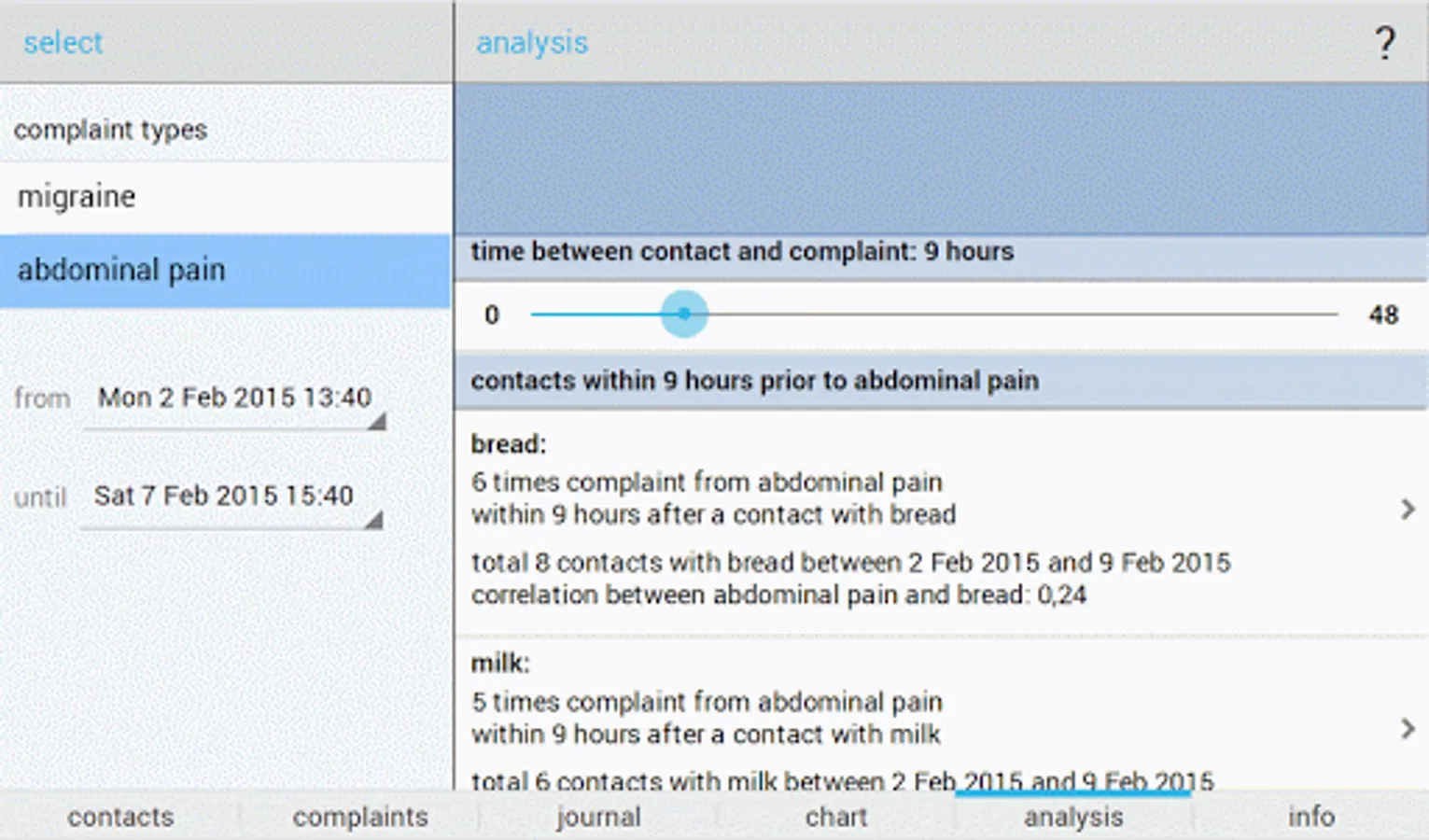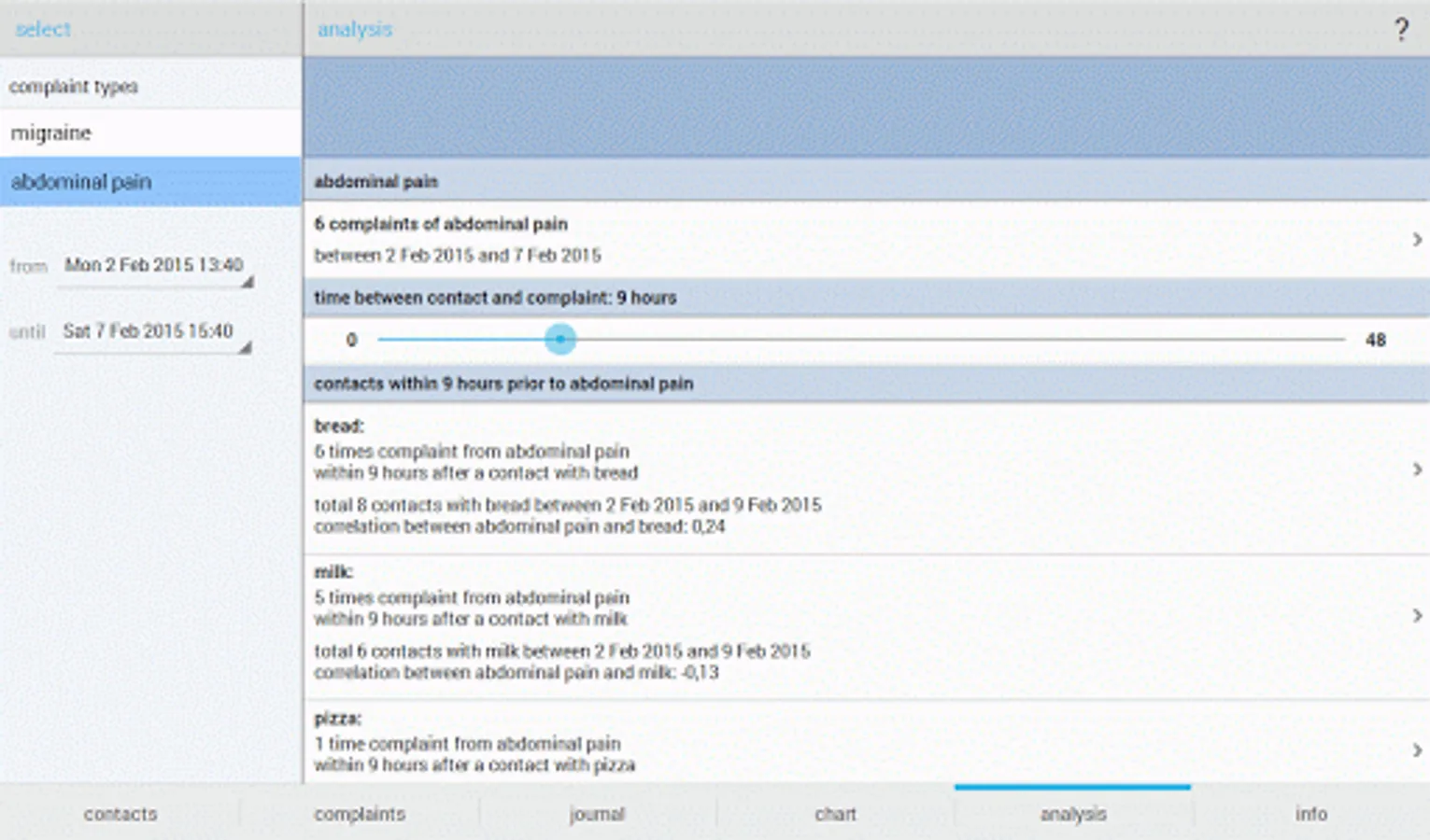 - In-depth analysis: in addition to time of complaints and contacts, you also enter the amount or intensity of contacts and the intensity or severity of complaints, and Allergy Analyzer shows the correlation between types of contacts and complaint types (if at least five combinations are found of contacts and complaints), giving you an understanding of how the severity of complaints correlate with the amount or extent of contacts.