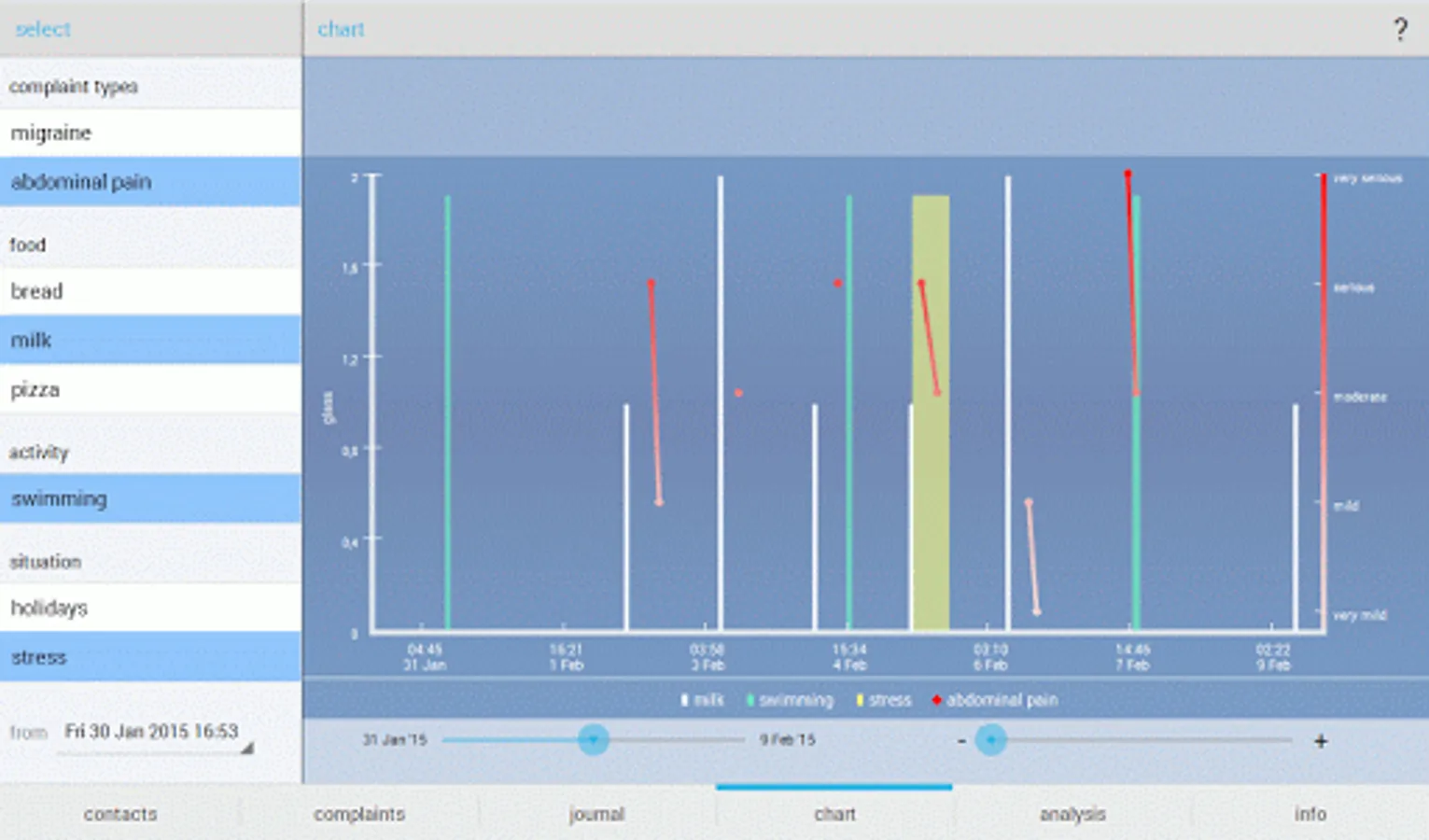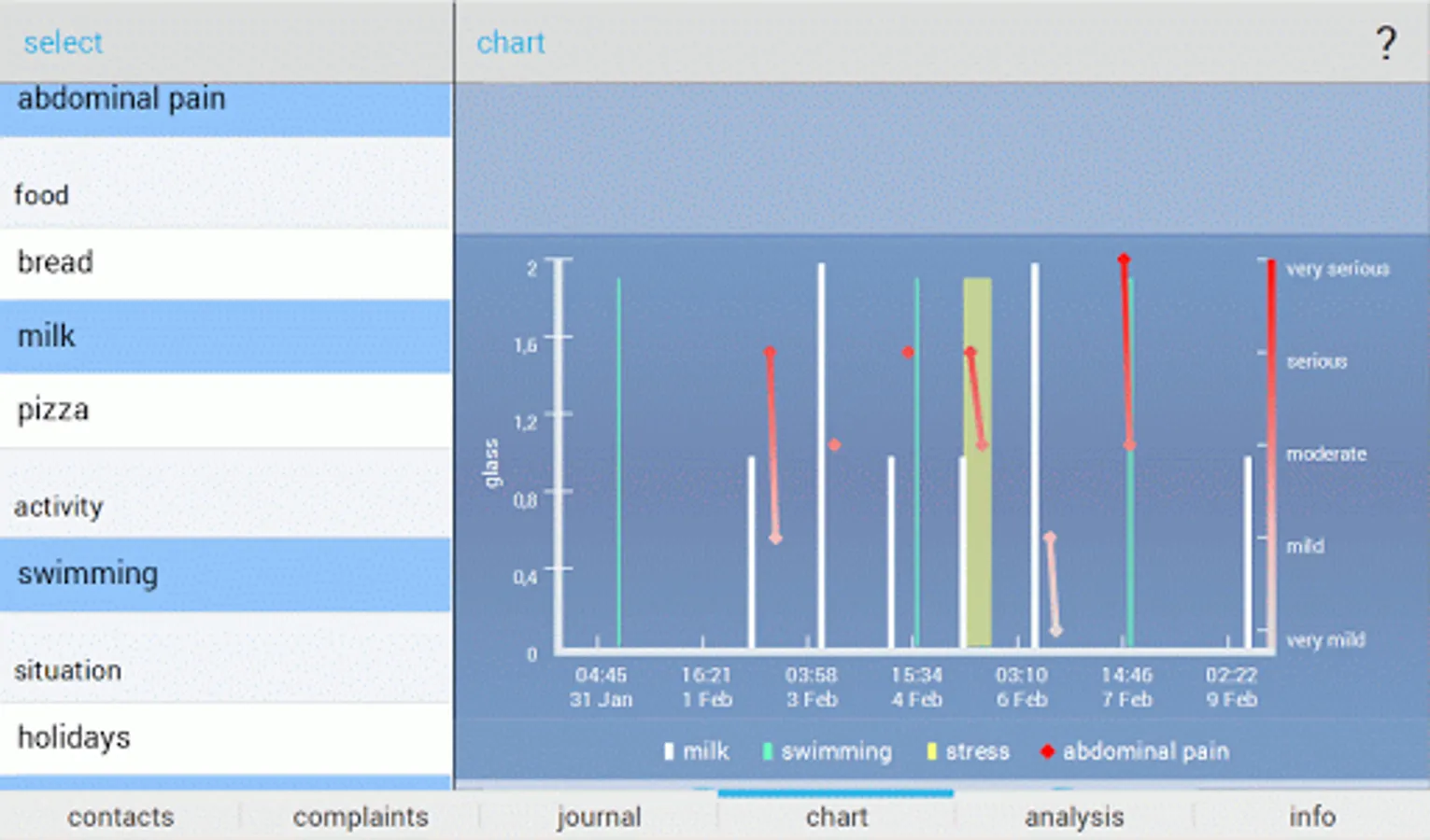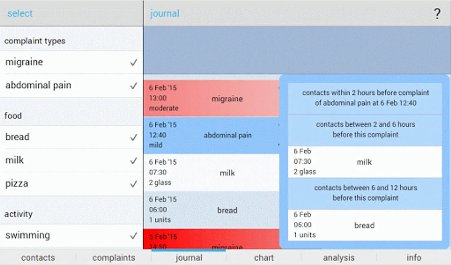 - In-depth analysis: in addition to time of complaints and contacts, you also enter the amount or intensity of contacts and the intensity or severity of complaints, and Allergy Analyzer shows the correlation between types of contacts and complaint types (if at least five combinations are found of contacts and complaints), giving you an understanding of how the severity of complaints correlate with the amount or extent of contacts.