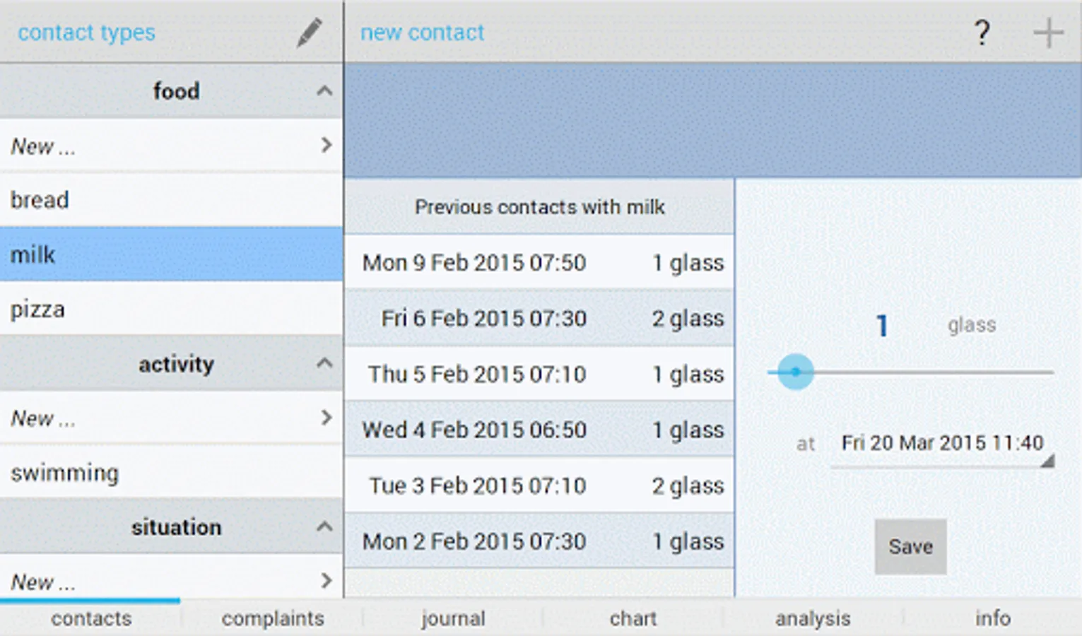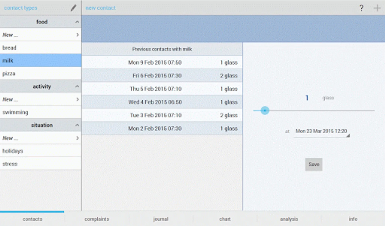 - Add your own types of food, activities or situations for which you want to register contacts in the app