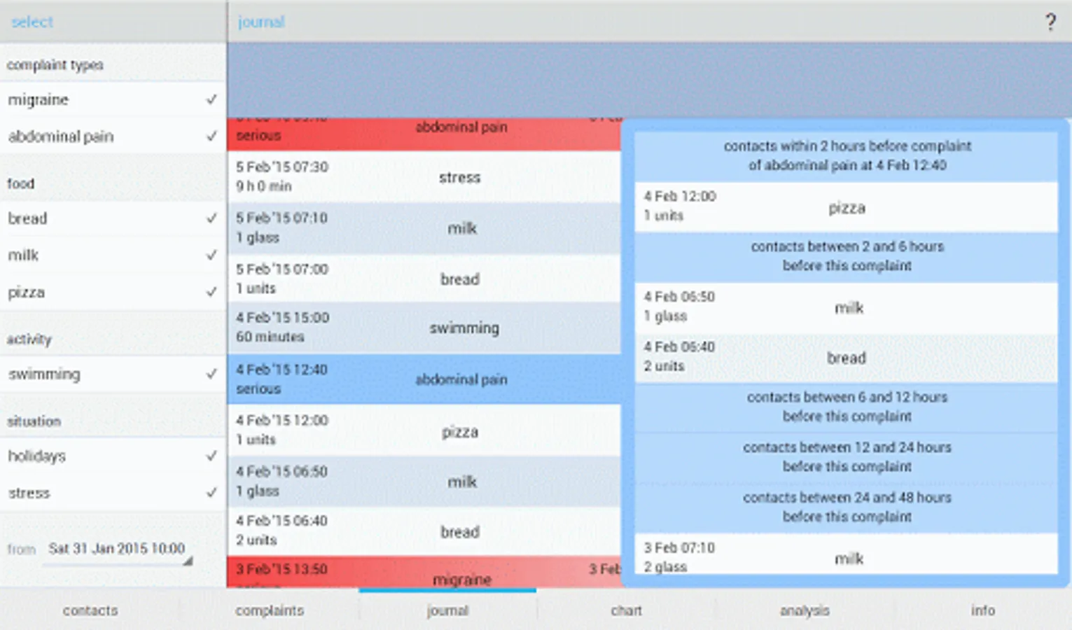 - Quick scan: you enter date and time of complaints and contacts, and Allergy Analyzer presents for a chosen type of complaint, the number of combinations of complaints and contact types that occurred within a (user-selected) period of time after a contact, giving you an insight into which combinations of contacts and complaints occur most frequently;