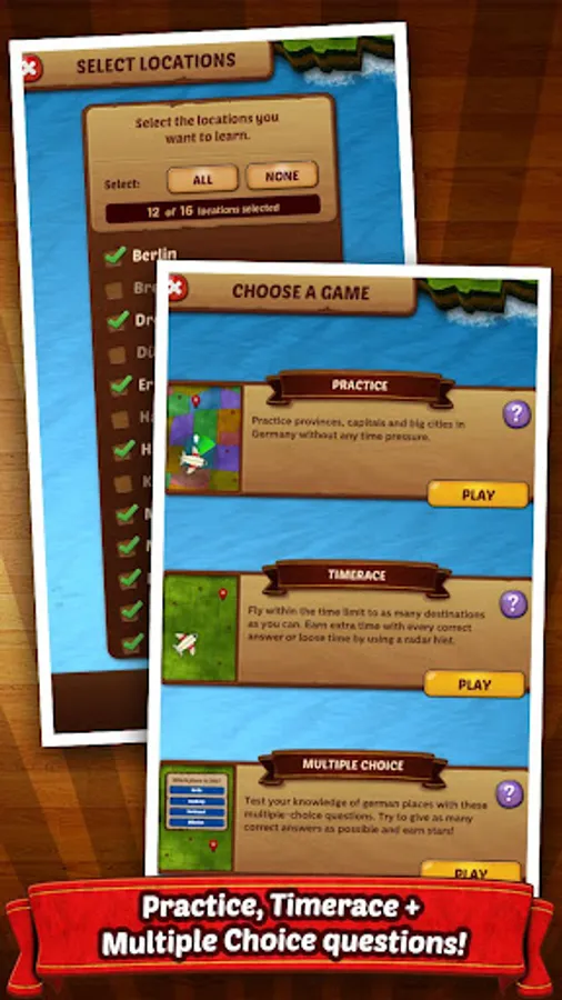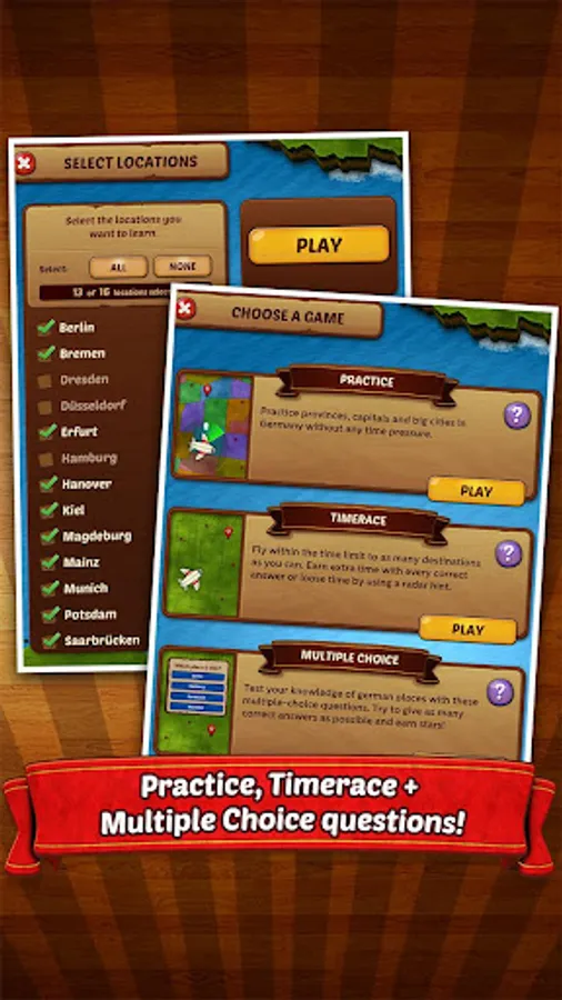 - Three exciting game modes to play: Practice, Timerace and Multiple Choice Questions!