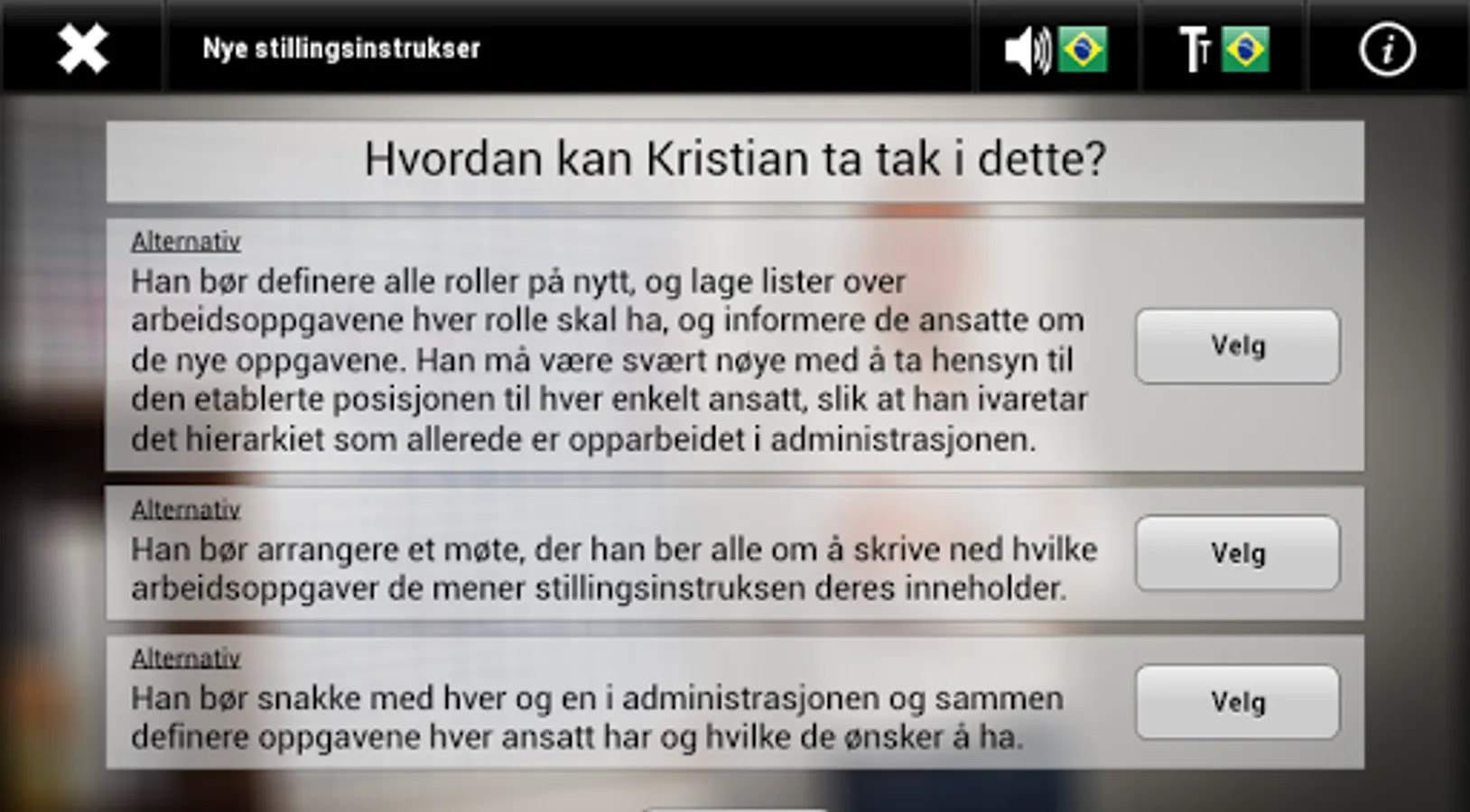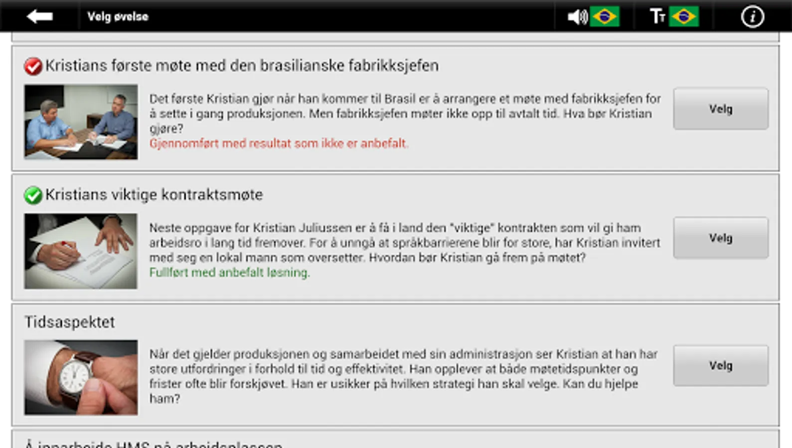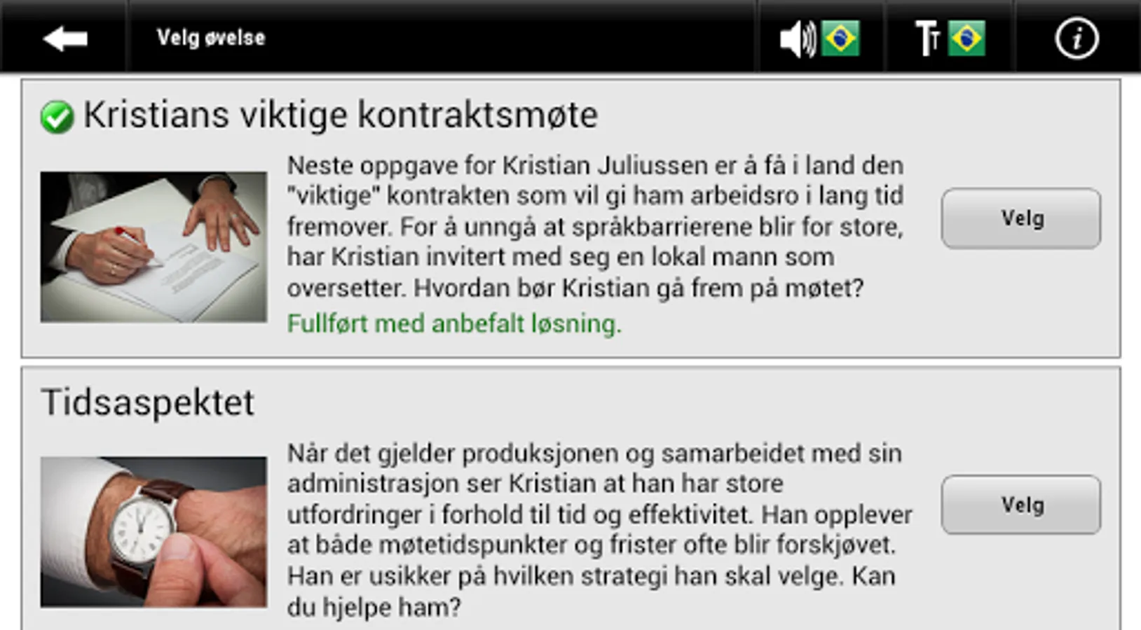 This application includes six different exercises, how to make right choices in Kristian Juliussen meeting with the Brazilian working culture. We recommend that you first work with the six reservoirs Ziriguidum!. Kristian Juliussen challenges related to the theme of the reservoirs, and the choices you make should be based on cultural knowledge you have acquired from these reservoirs.