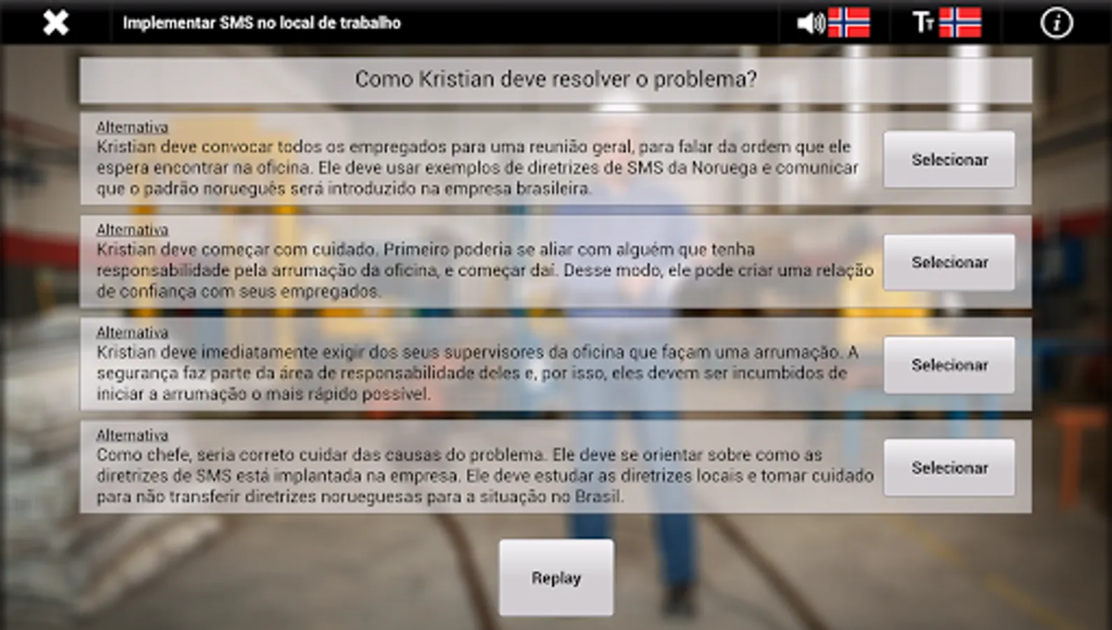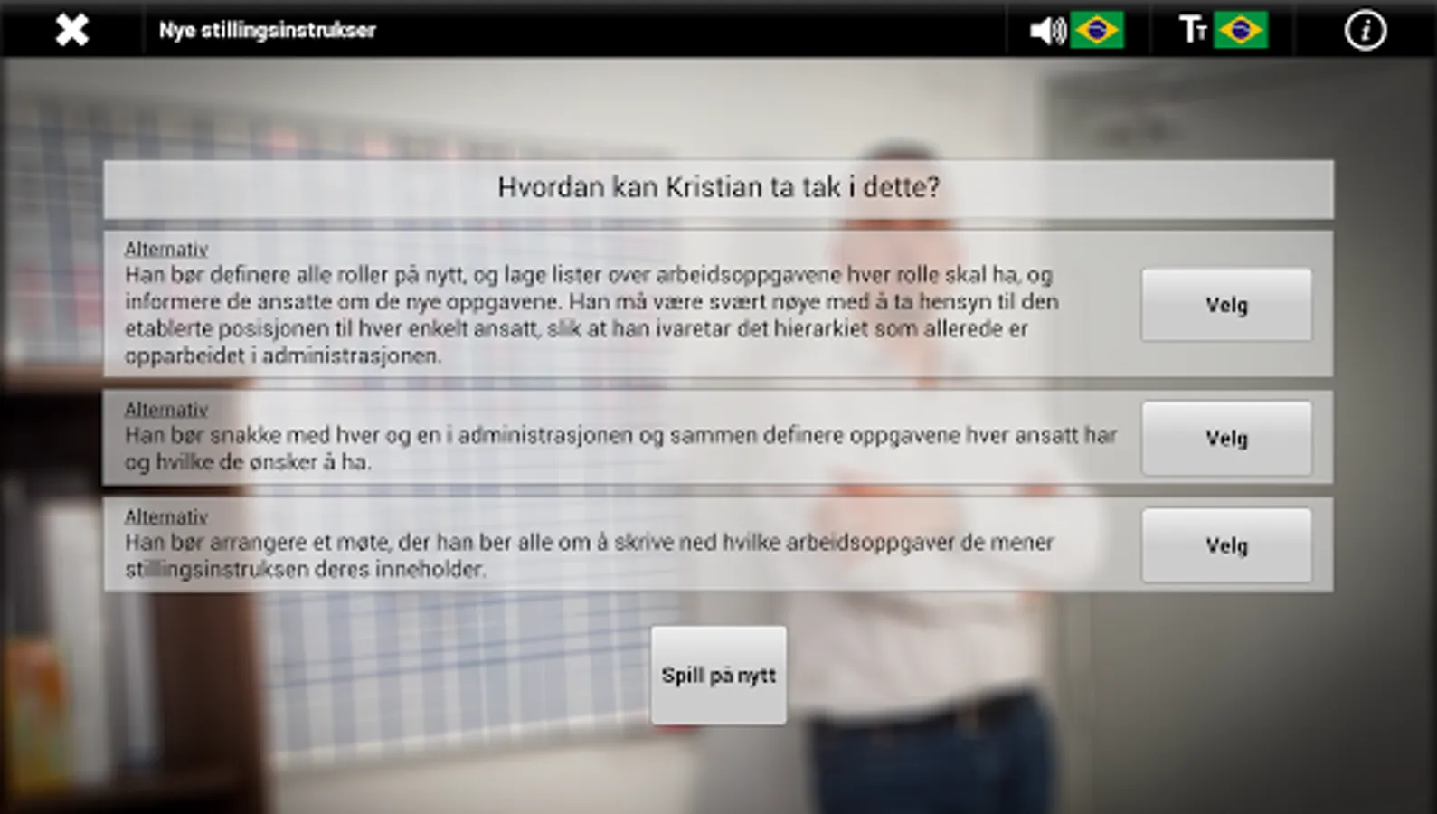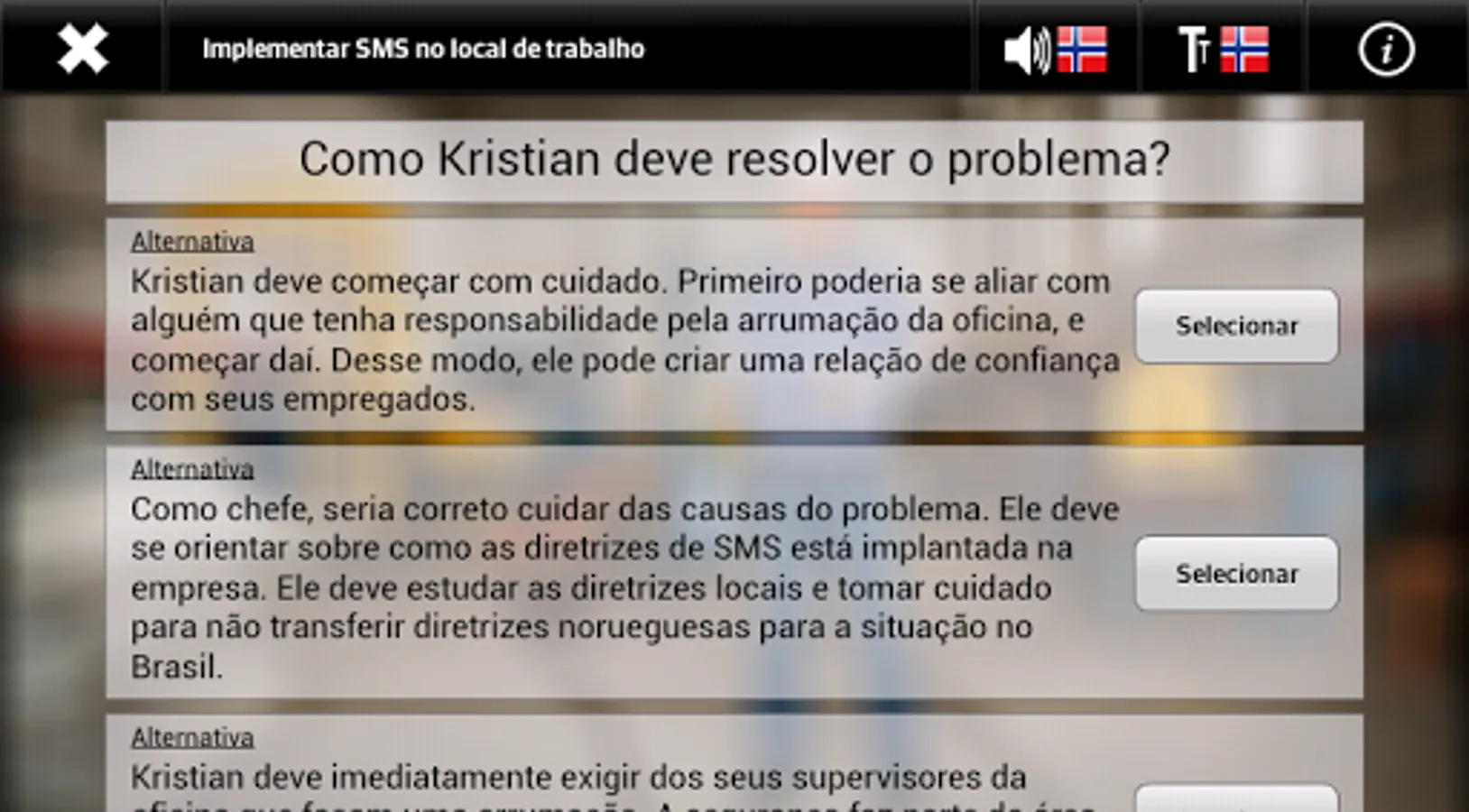 This application includes six different exercises, how to make right choices in Kristian Juliussen meeting with the Brazilian working culture. We recommend that you first work with the six reservoirs Ziriguidum!. Kristian Juliussen challenges related to the theme of the reservoirs, and the choices you make should be based on cultural knowledge you have acquired from these reservoirs.