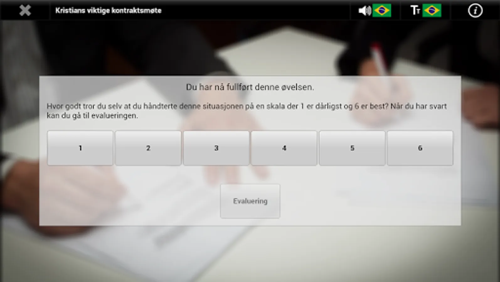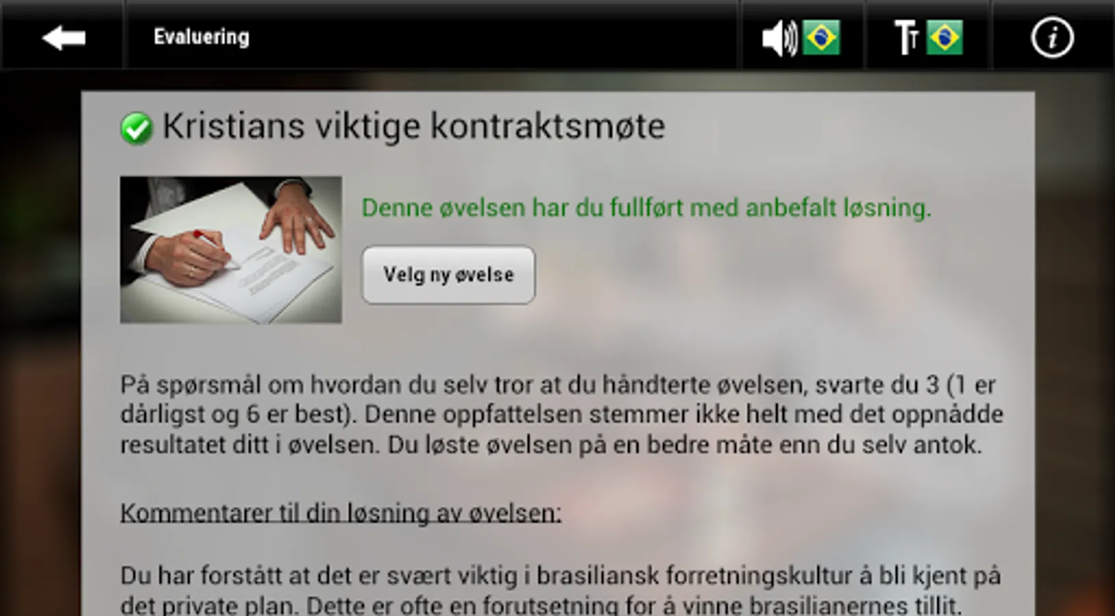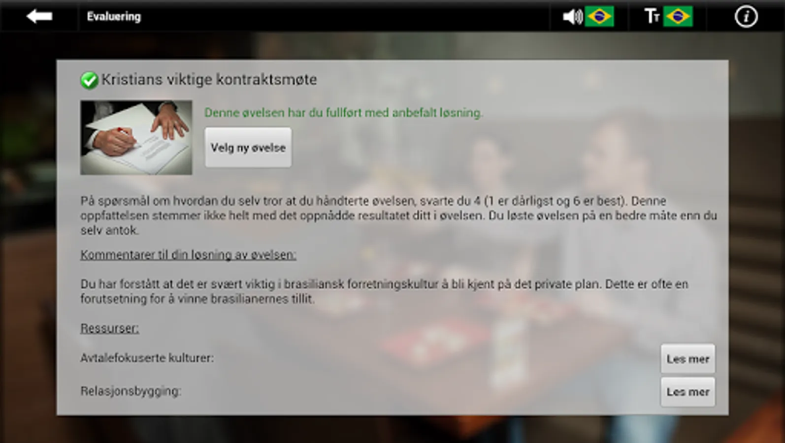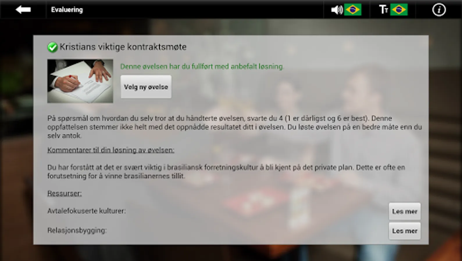 At the end of each exercise you will get an evaluation with feedback on the choices you made. The feedback is intended as a gateway to the cultural minefield of culture can be.