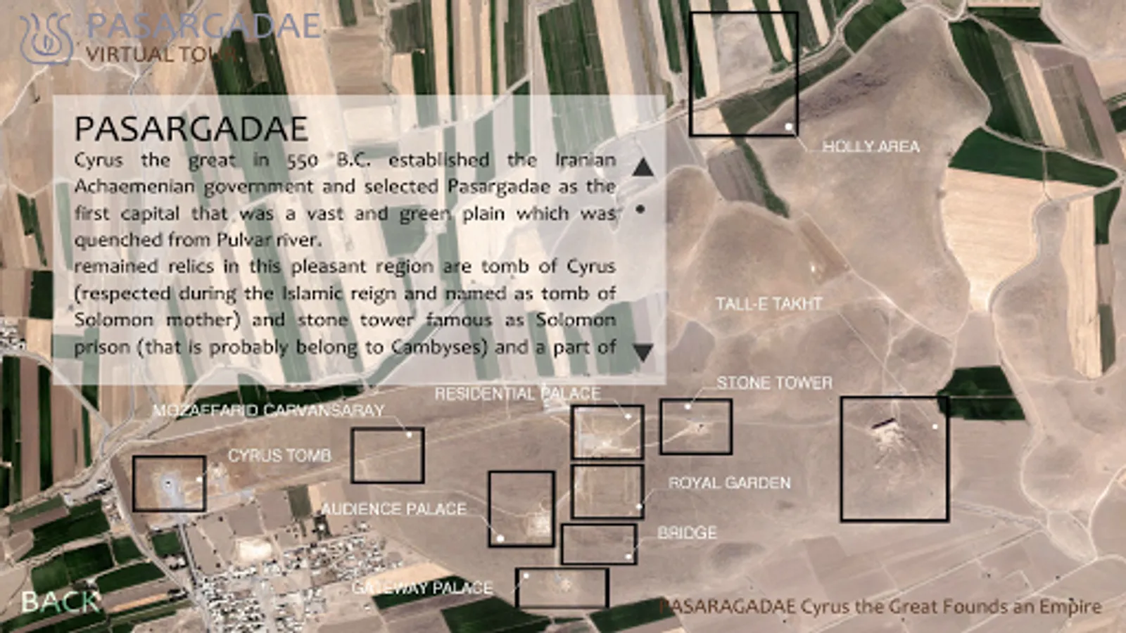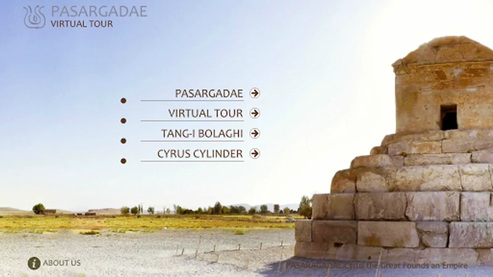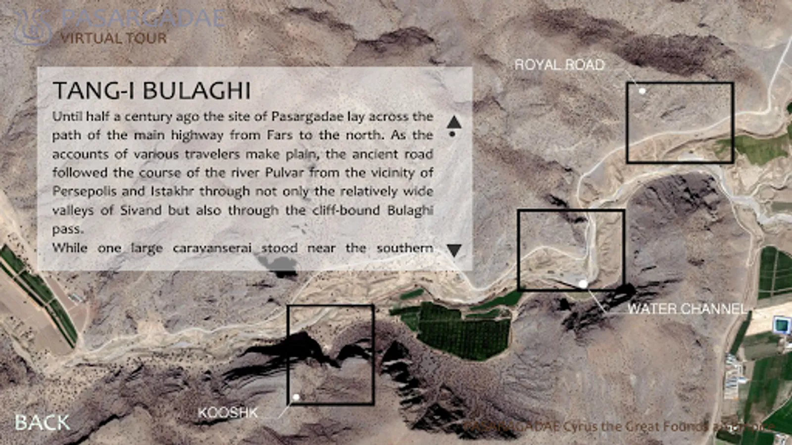 The Virtual Tour of the Pasargad monuments consists of high-resolution gigapixel images and panoramas of the most prominent monuments - the Tomb of Cyrus, the Palace P, the Palace S, the Pavilion A&B, the Bridge, the Entrance Gateway Palace, the Tall-e Takht, the Stone Tower, the Holly Area, the Royal Garden, the Tang-i Bulaghi - as well as detailed photographic displays of selected views from the outer surface of the ancient walls surrounding the hill. Each view is complemented with descriptive information about the monuments and selected areas of interest.