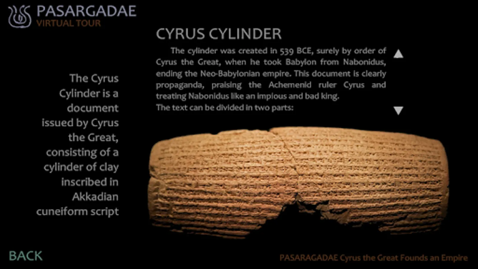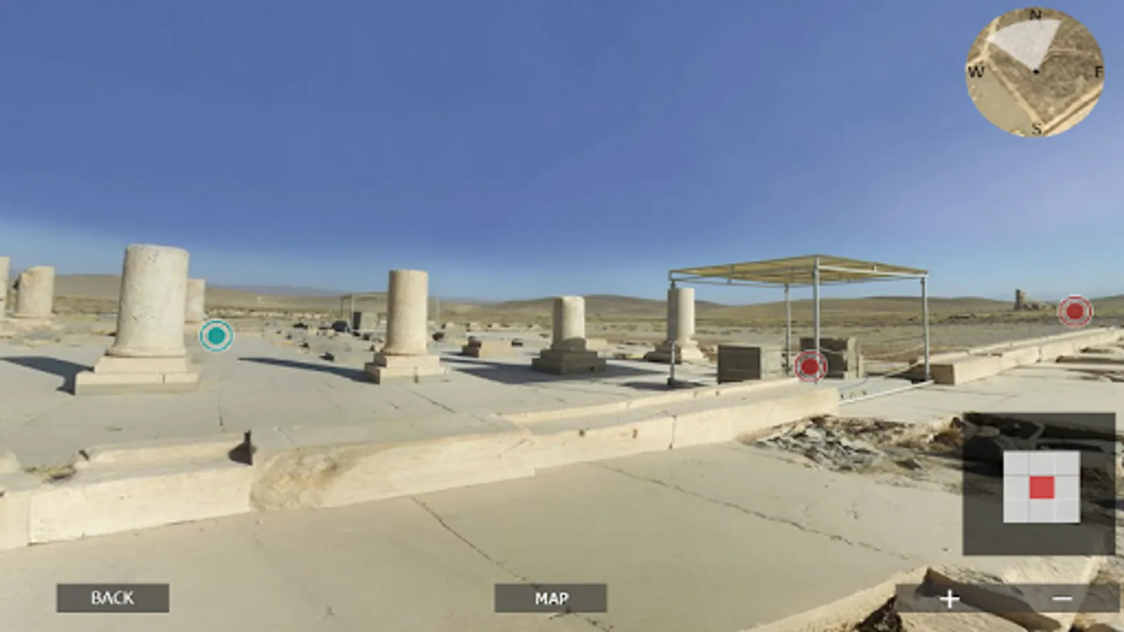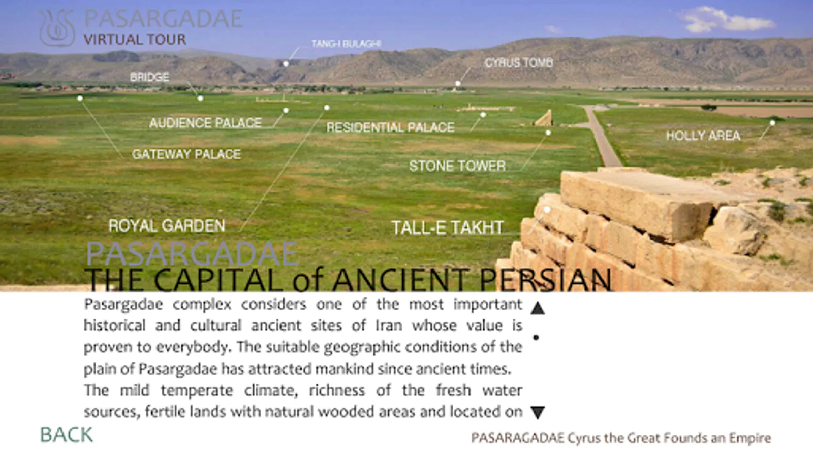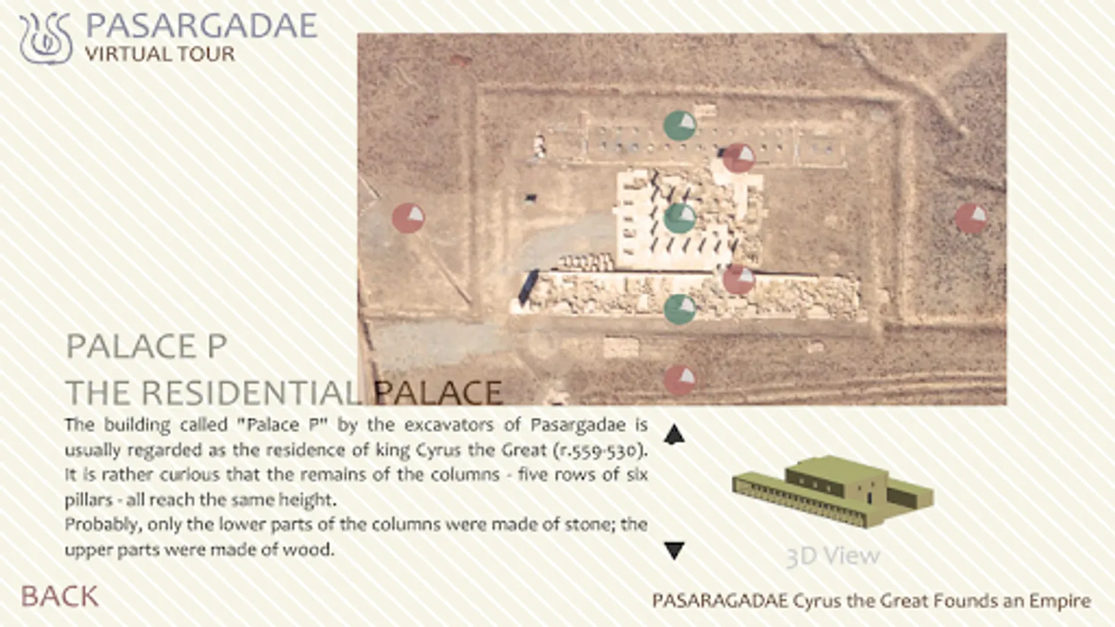 The Virtual Tour of the Pasargad monuments consists of high-resolution gigapixel images and panoramas of the most prominent monuments - the Tomb of Cyrus, the Palace P, the Palace S, the Pavilion A&B, the Bridge, the Entrance Gateway Palace, the Tall-e Takht, the Stone Tower, the Holly Area, the Royal Garden, the Tang-i Bulaghi - as well as detailed photographic displays of selected views from the outer surface of the ancient walls surrounding the hill. Each view is complemented with descriptive information about the monuments and selected areas of interest.