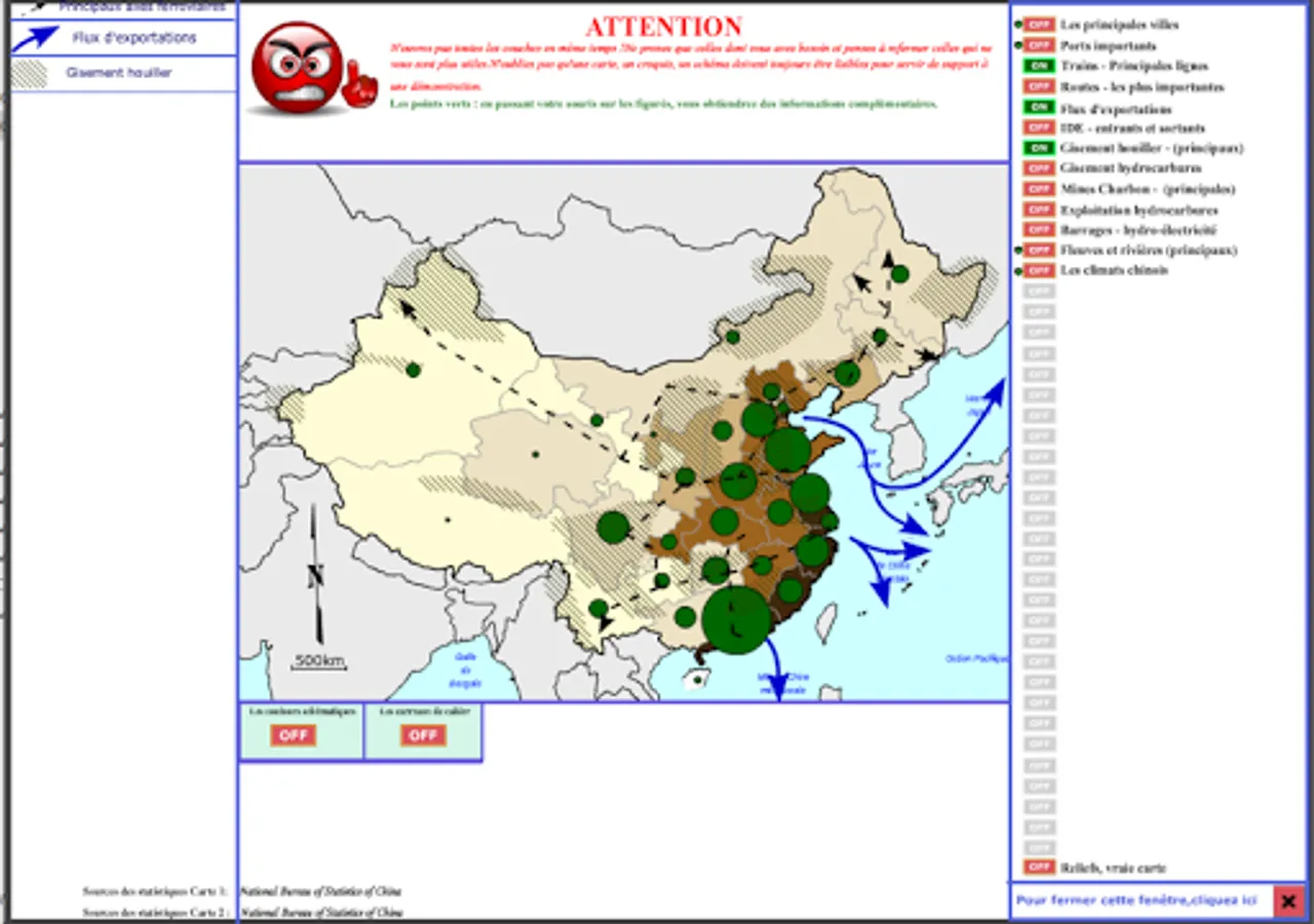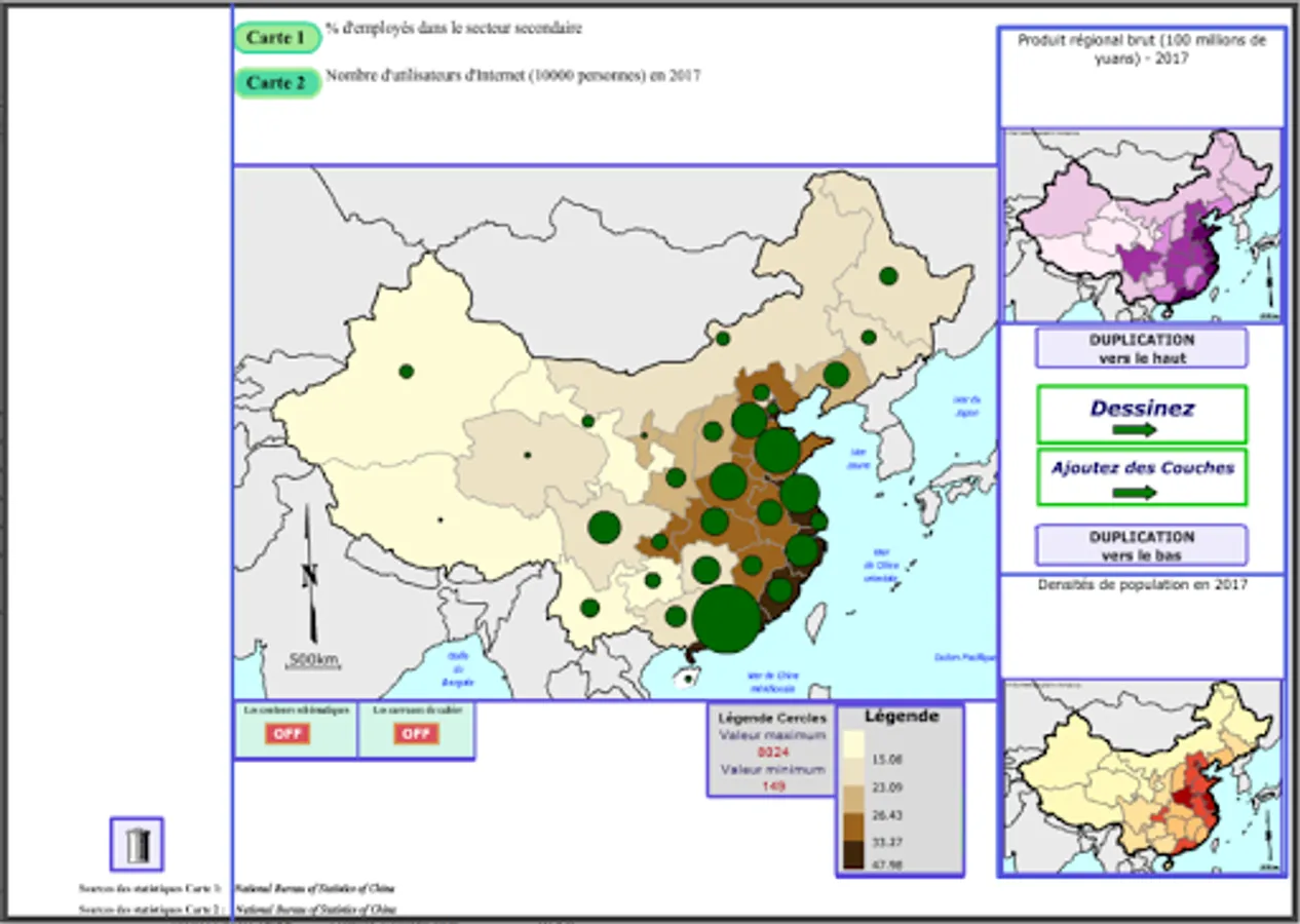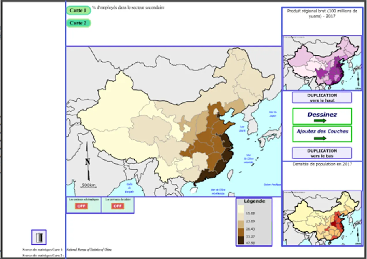 Automatic mapping software for China including the production of thematic maps with colored beaches (3 per screen for analysis); the production of thematic maps with proportional circles superimposed on colored beach maps; possibility to draw on these cards with all the palette of drawing tools of a professional software but also possibility of using an integrated normographer (the famous Munigraphe) to have the figurations on your card; possibility of creating geography diagrams from the maps produced; possibility to superimpose layers on your cards.