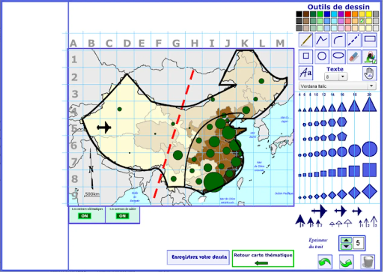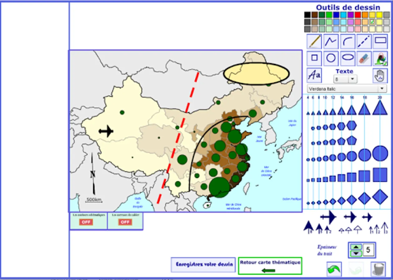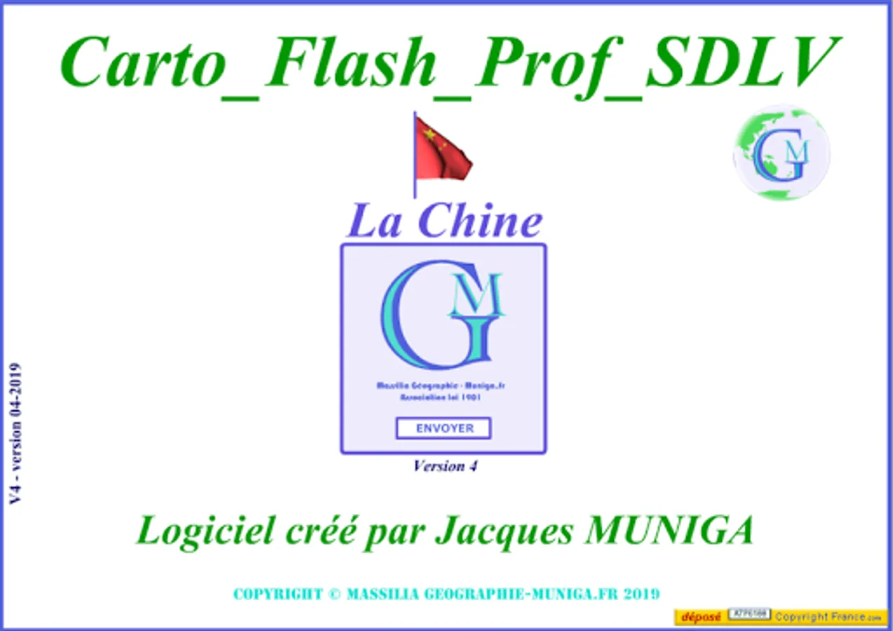 Automatic mapping software for China including the production of thematic maps with colored beaches (3 per screen for analysis); the production of thematic maps with proportional circles superimposed on colored beach maps; possibility to draw on these cards with all the palette of drawing tools of a professional software but also possibility of using an integrated normographer (the famous Munigraphe) to have the figurations on your card; possibility of creating geography diagrams from the maps produced; possibility to superimpose layers on your cards.