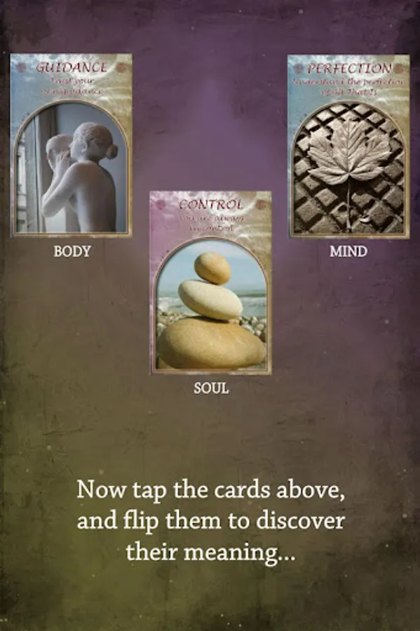 - Explore 3 types of readings: 1 card, 2 cards (relationship) or 3 cards (mind / body / soul)