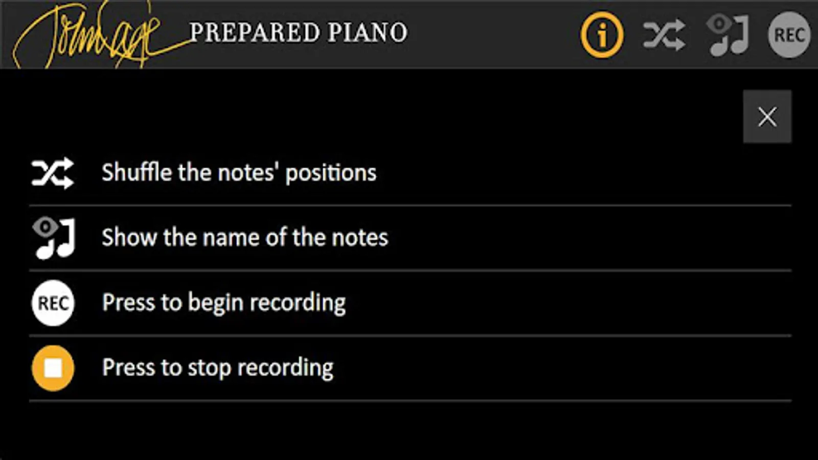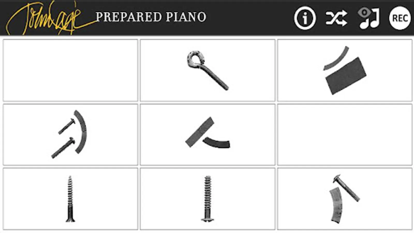 The sounds of John Cage's prepared piano are now available for you to play on your Android device with this innovative app. Play meticulously sampled sounds of a piano prepared with the actual materials used by John Cage in the preparations for his Sonatas and Interludes (1946-48) as sampled under the supervision of the John Cage Trust.