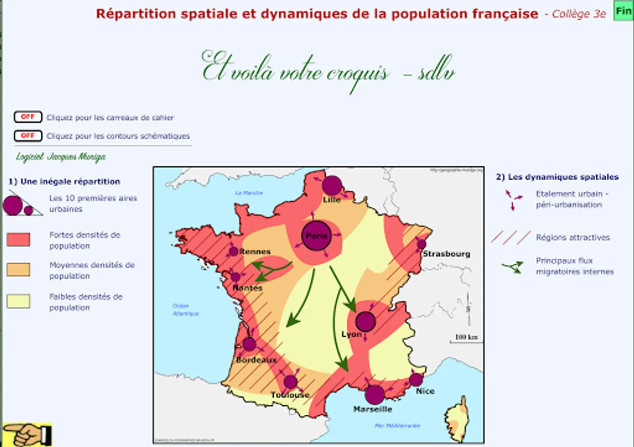 This sketch meets the requirements of the directives of the Inspector General as for theme 1 - Territorial dynamics of contemporary France - in the geography program for grades 3, it says: "Sub-theme 1: areas maps urban national and regional scales are needed to show particular the importance of cities in organizing the territory [...] these cards are complemented by the distribution of the population [...] the perspective is the opportunity to build a sketch of the spatial distribution of population and its dynamics in the territory. ".