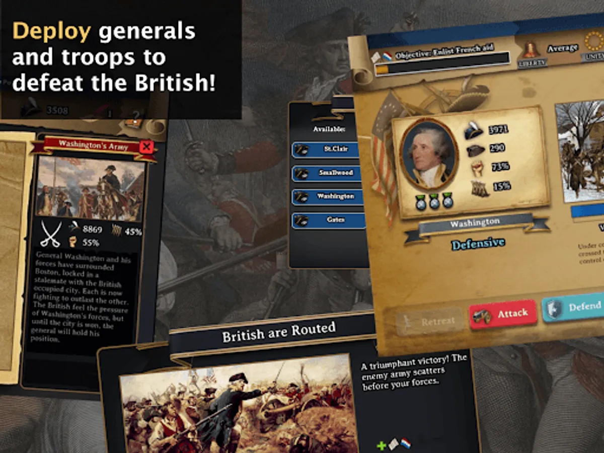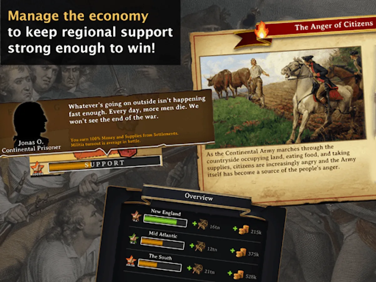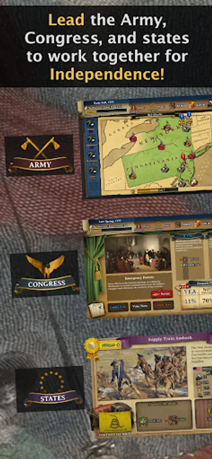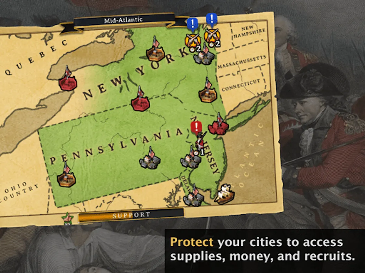 Victory is ultimately attained by defeating the British, but you must also establish and protect the high ideals of universal liberty and natural rights while nurturing the fragile union of the states. There are soldiers to recruit, armies to supply, and money to raise to fight the war for independence.