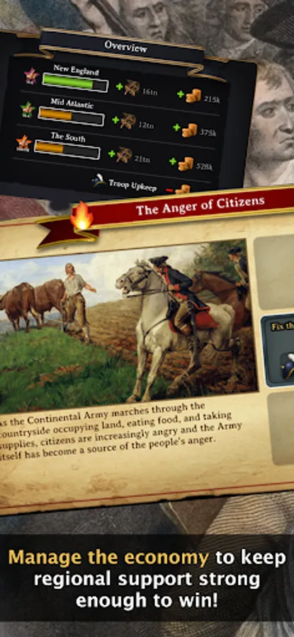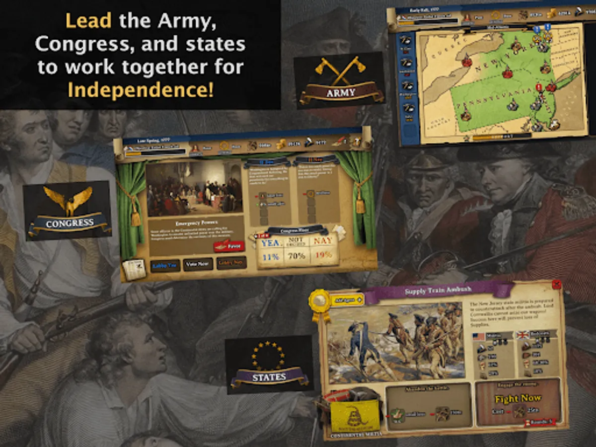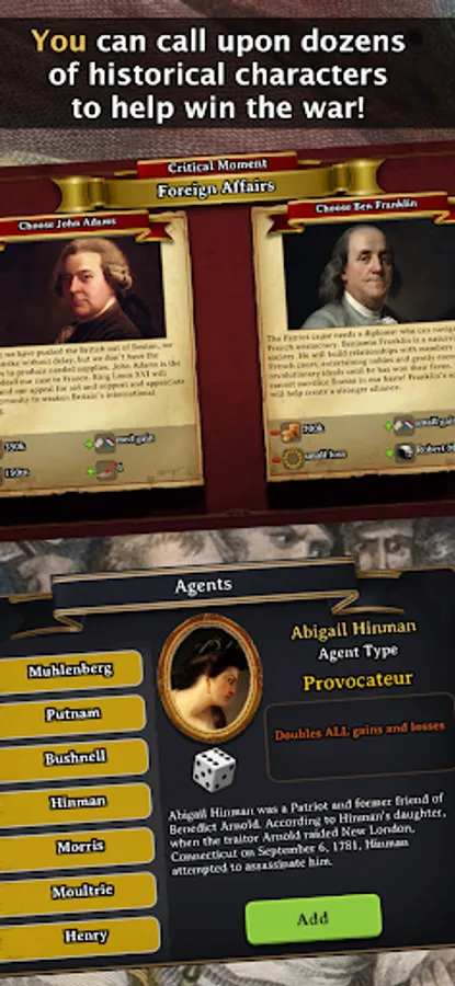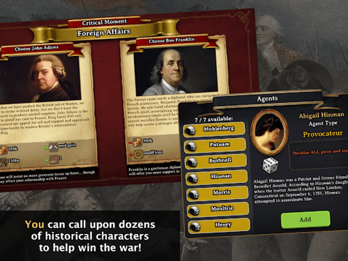 * Meet famous revolutionaries including Continental Army officer Alexander Hamilton, Native American leader Daniel Nimham, and African American poet Phillis Wheatley, who you can deploy at unique moments to give you gameplay advantages when it's needed most.