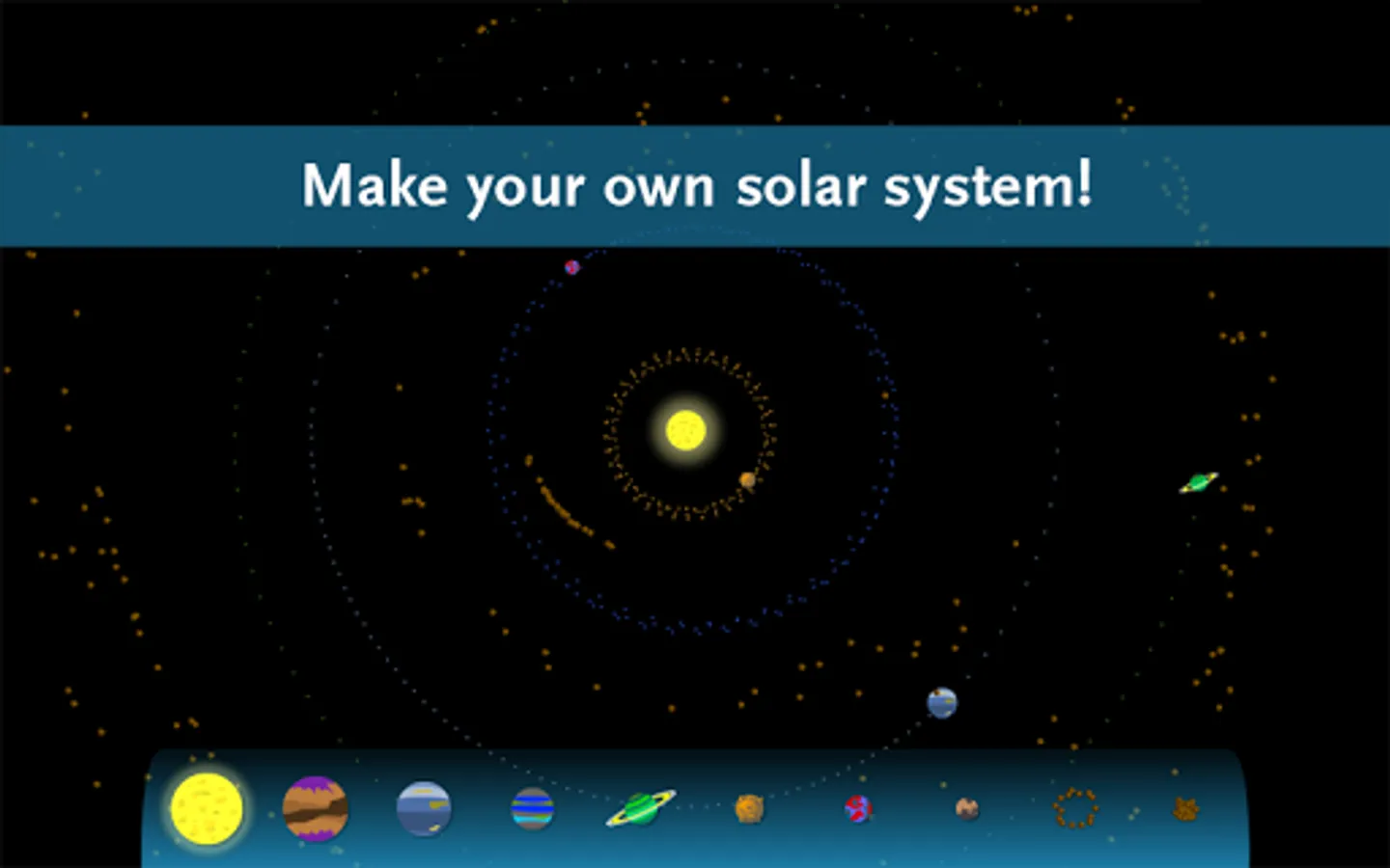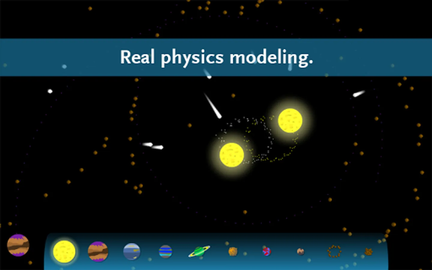 Drag and drop planets and stars to make your own solar system. The physics engine will calculate how gravity between all of the asteroids, planets, and stars affect one another while they move through space.