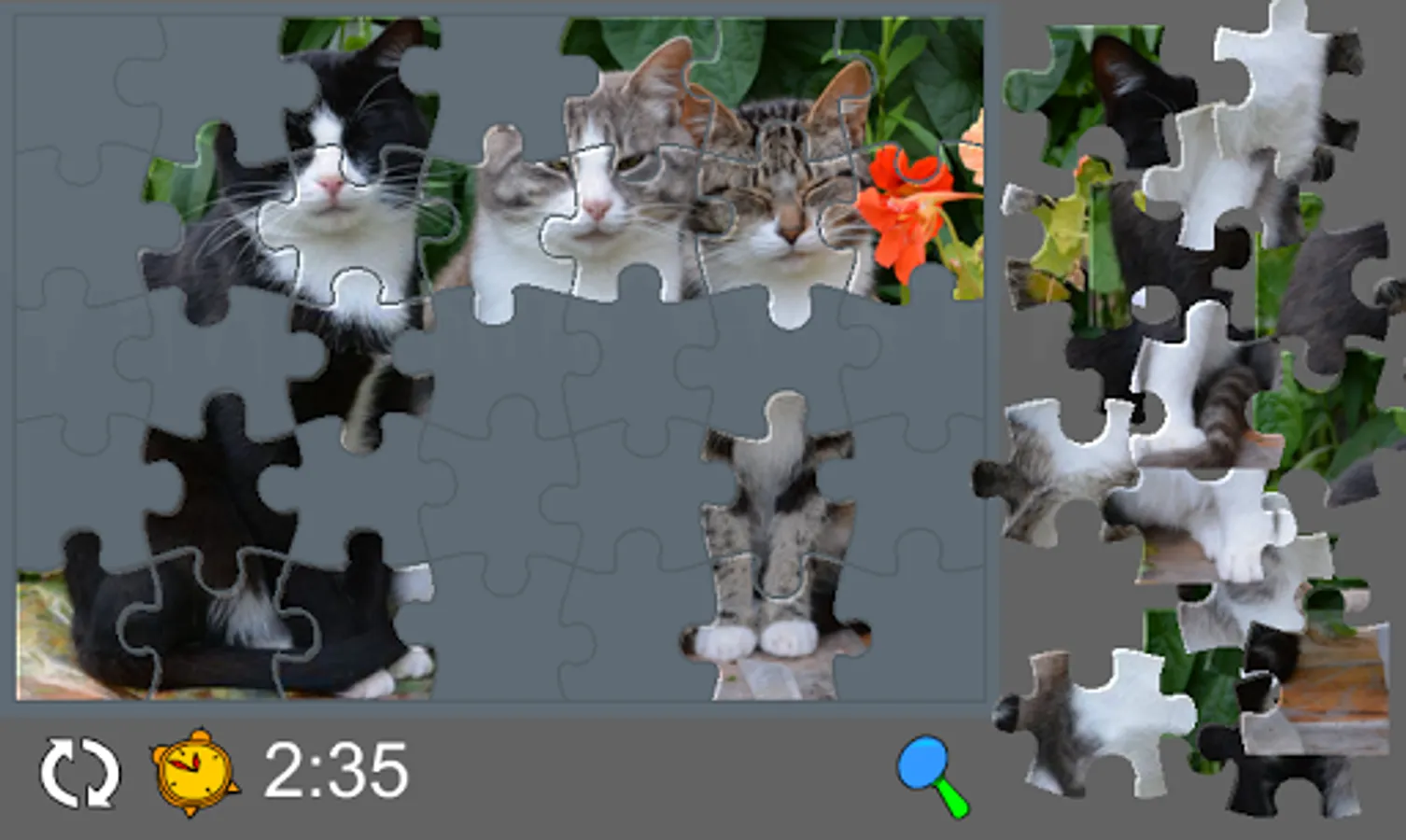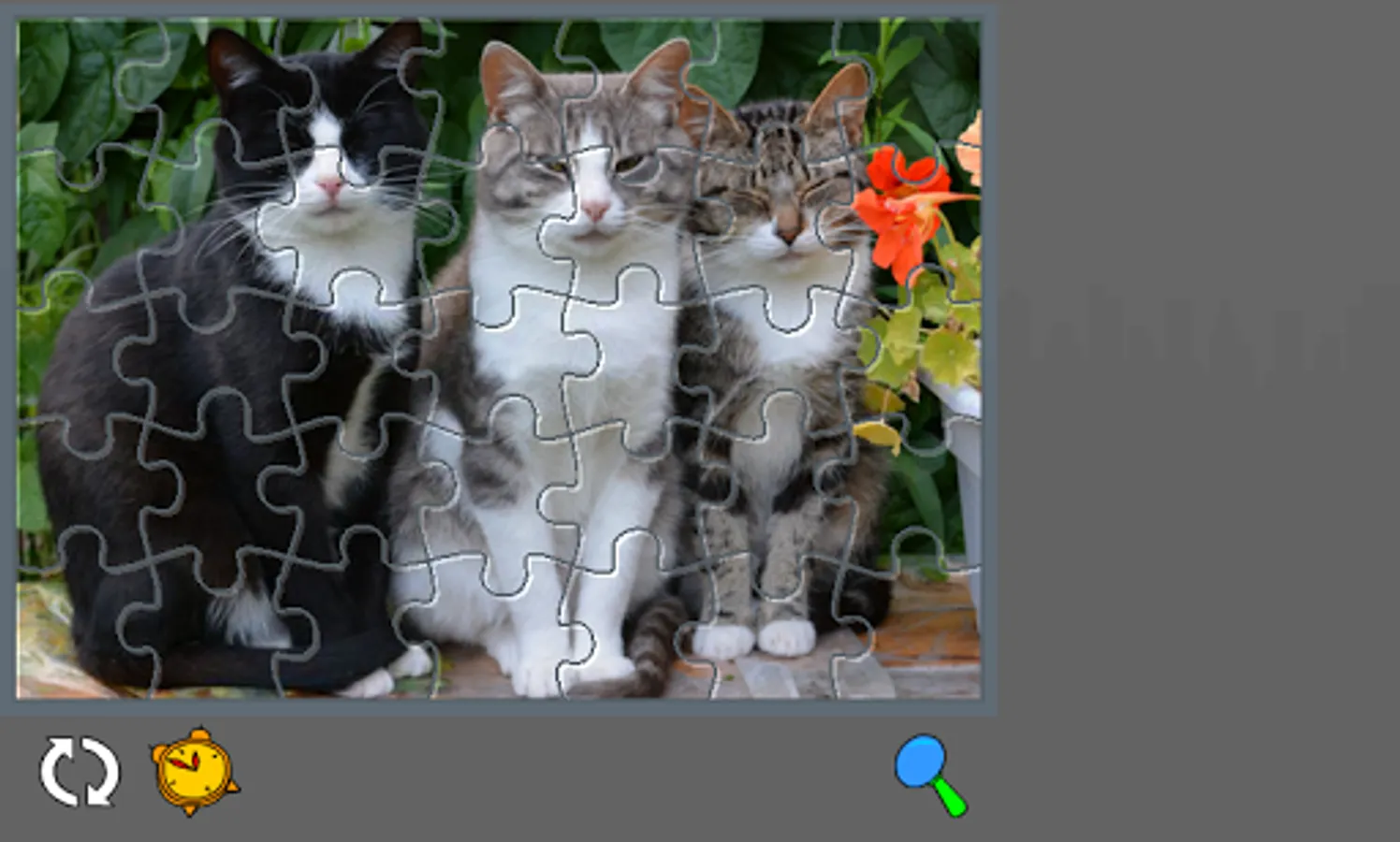 Three pictures with three cute cats to solve jigsaw puzzle. Game will save your best time and you can try to beat your own time record. All 35 pieces in this puzzle have unique shapes.