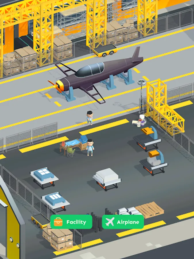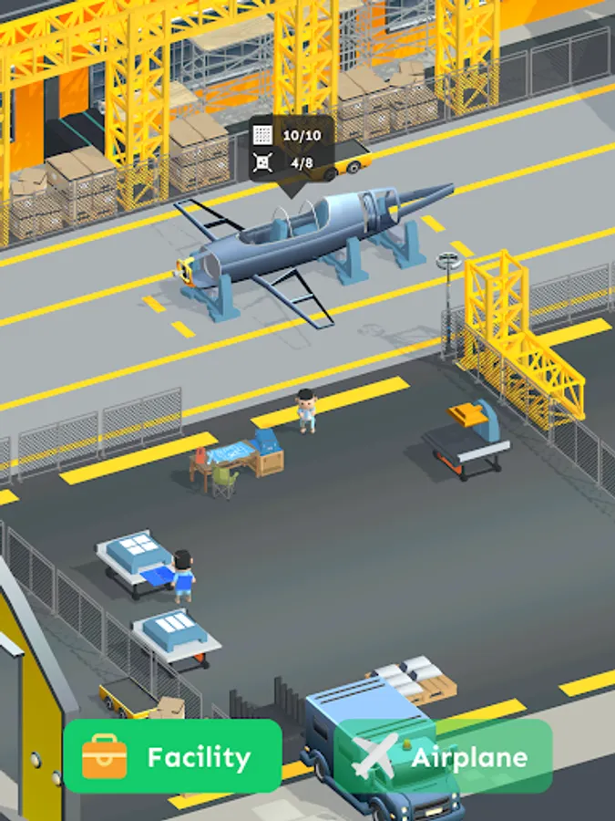 Starting from the first part, making each part of the transportation, eventually build your plane. You can hire workers to help you carry, upgrade the equipment to strengthen work efficiency, and finally get a plane.