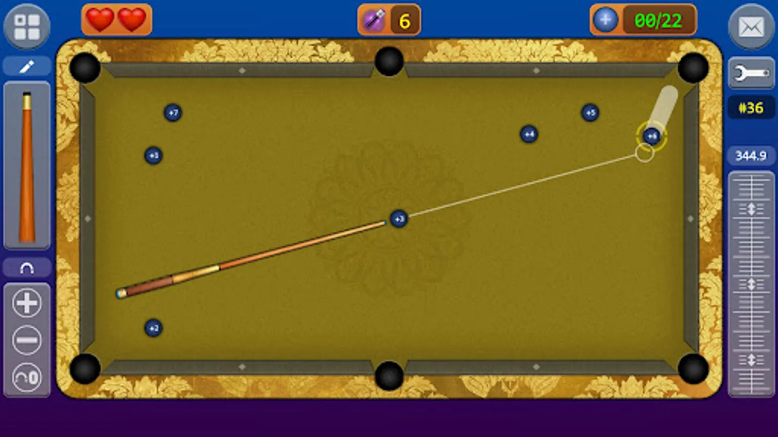 Snooker is a cue sport which originated among British Army officers in Etawah, India in the later half of the 19th century. It is played on a rectangular table covered with a green cloth, or baize, with pockets at each of the four corners and in the middle of each long side. Using a cue and 22 coloured balls, players must strike the white ball (or "billard") to pot the remaining balls in the correct sequence, accumulating points for each pot. An individual game, or frame, is won by the player who scores the most points. A match is won when a player wins a predetermined number of frames.