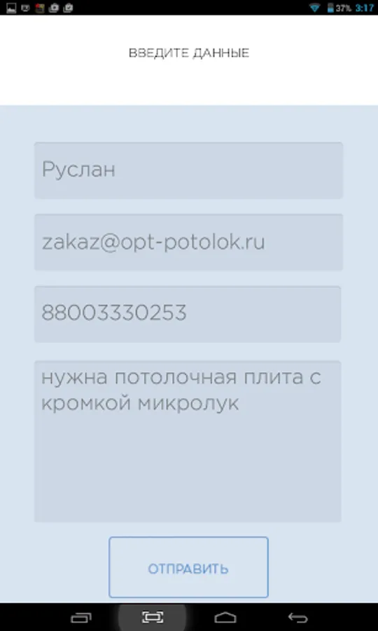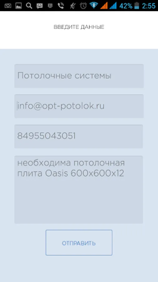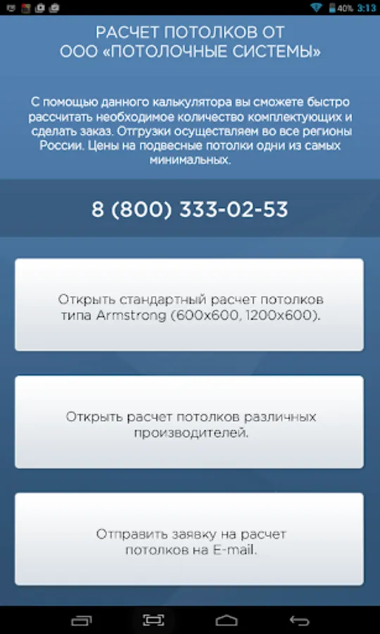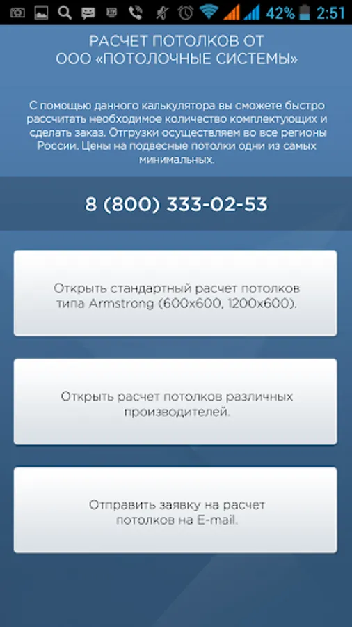 After the calculation, you can send us a request for the supply of suspended ceilings, for this you will be prompted to enter the name, e-mail address and phone number. Your application will go to our corporate e-mail and in the near future it will process manager and will contact you for further details.
