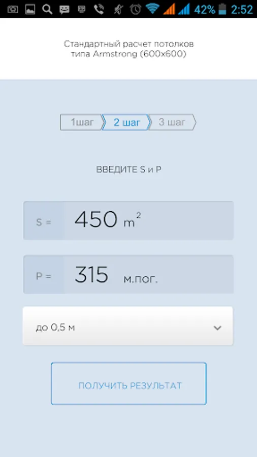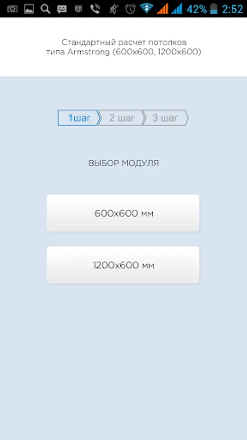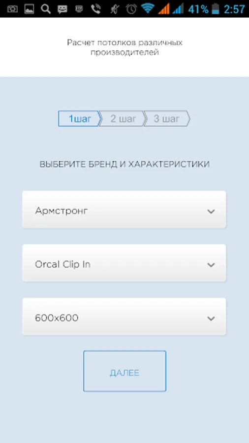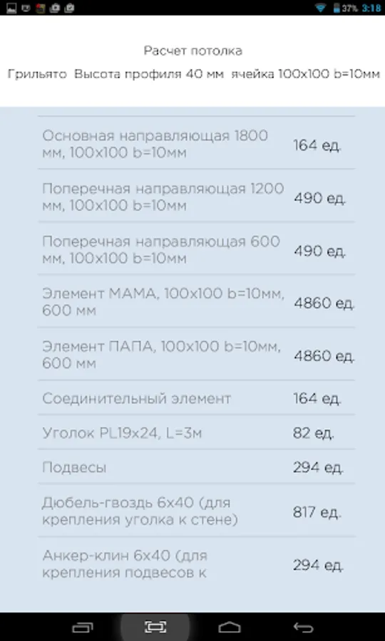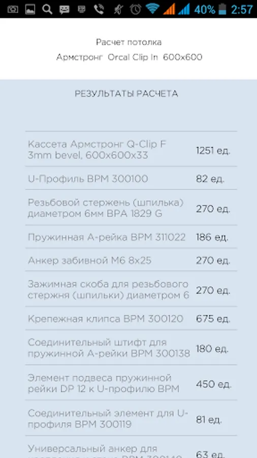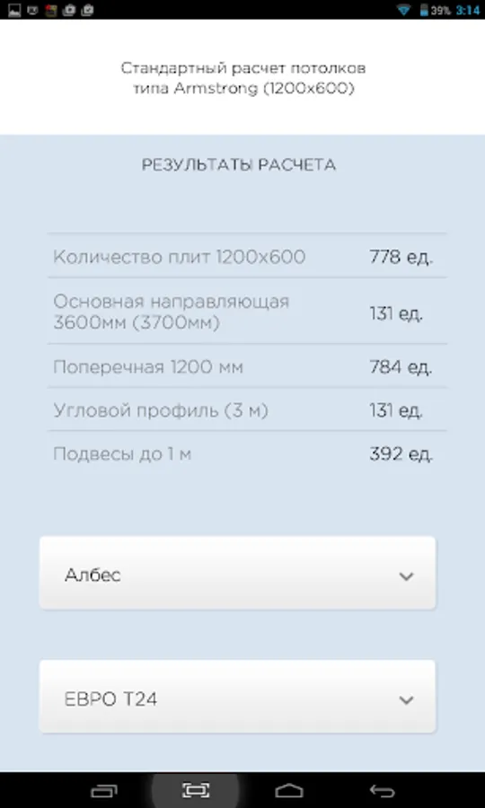 This calculator - allows you to perform the calculation of the required number of components during installation of different ceilings. With it, you can calculate not only the standard raster ceilings 600x600 and 1200x600, but also various other types of ceilings, for example, acoustic ceilings Ecophon Focus Ds, metal ceilings Armstrong Orcal Clip In and Orcal Hook On, as well as suspended ceilings and Albes Grilyato.