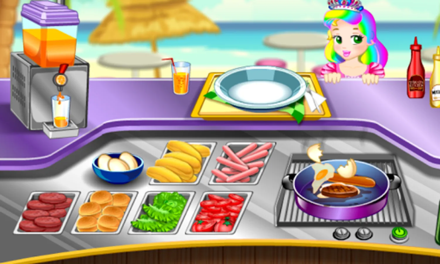 The first level like in most of the food games , allows you to cook burgers , hot-dogs , fried eggs and serve juice ! Of course you can upgrade your plate , juice maker , pan and other cooking tools from the beginning.