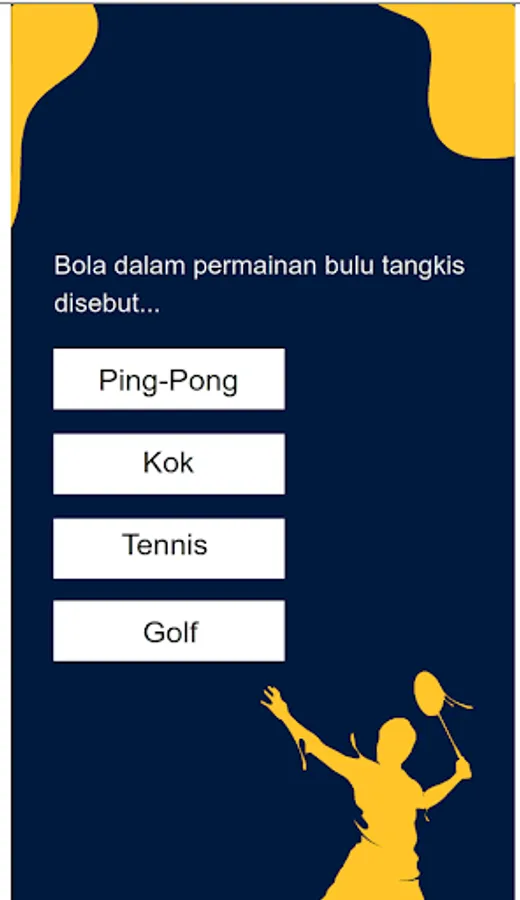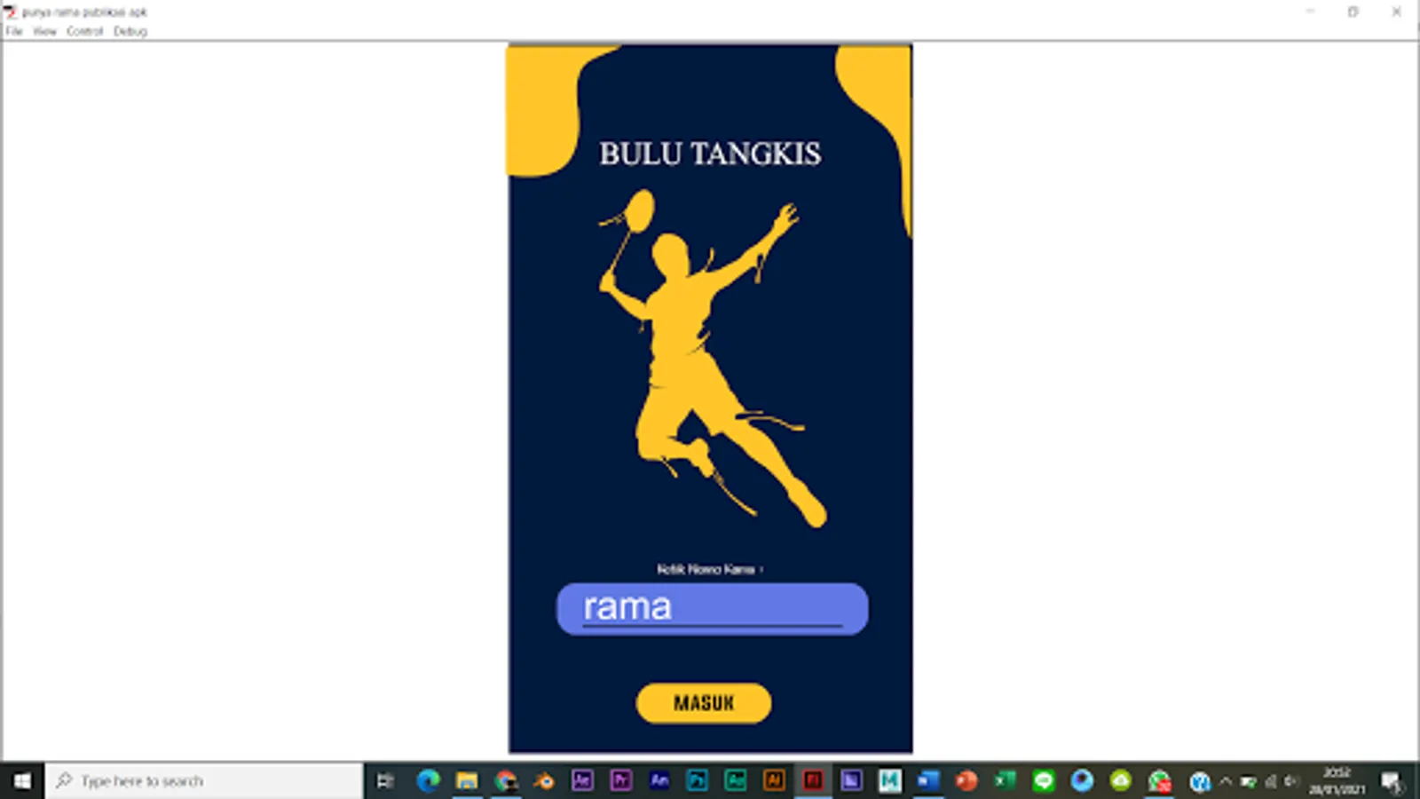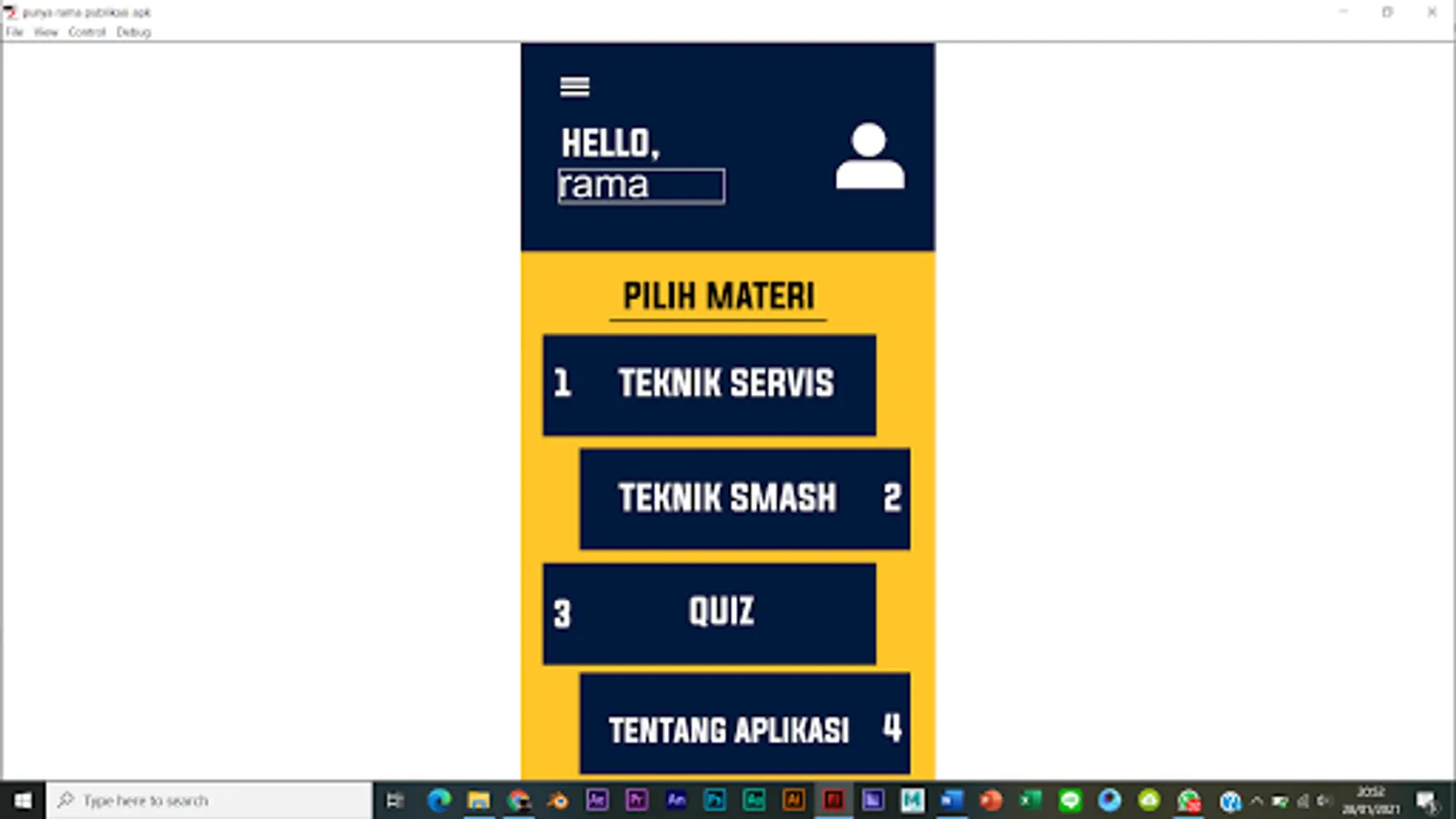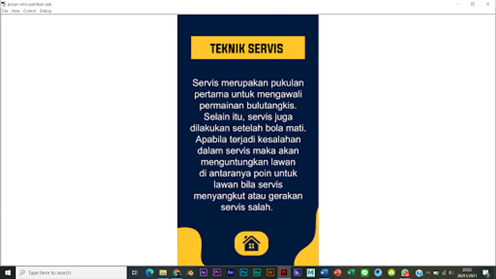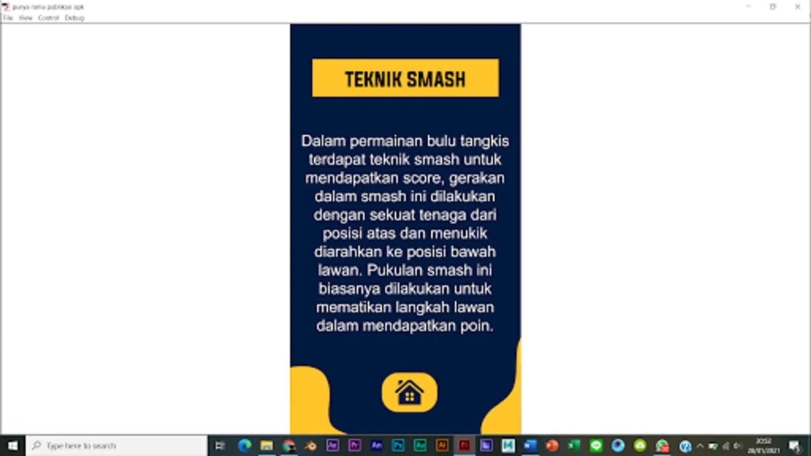 Nama aplikasi ini adalah Pembelajaran Olahraga Bulu Tangkis, aplikasi ini berisi tentang Teknik-teknik dalam bulu tangkis seperti pengertian Teknik servis dan Teknik smash. Di aplikasi ini juga terdapat soal quiz yang dapat dikerjakan dan pada halaman terakhir terdapat tentang aplikasi tersebut.