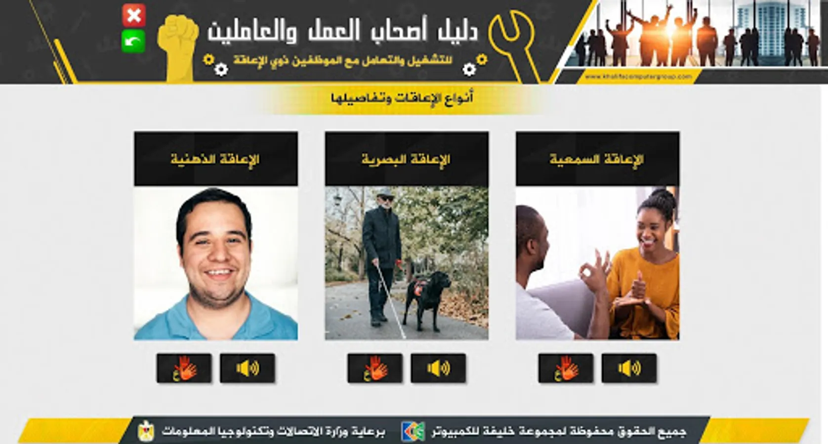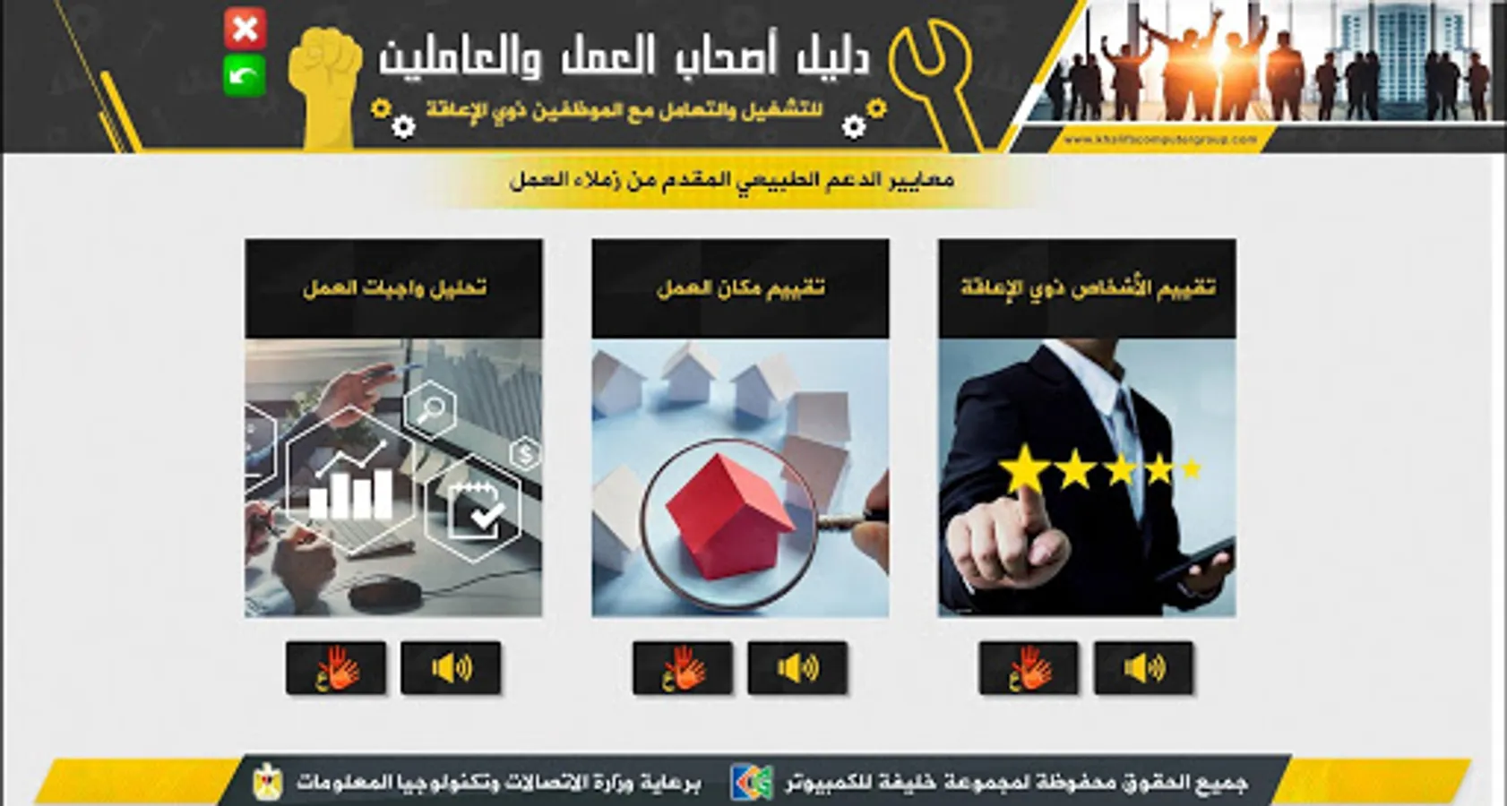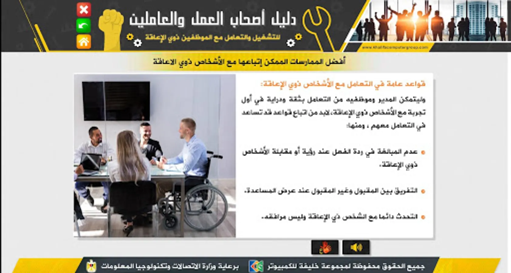 It is an educational application that serves as a guide for employers, whether in the private or public sector, as well as employees and workers concerned with helping them to identify the best ways and practices in dealing with persons with disabilities in terms of employment and dealing with them during work.