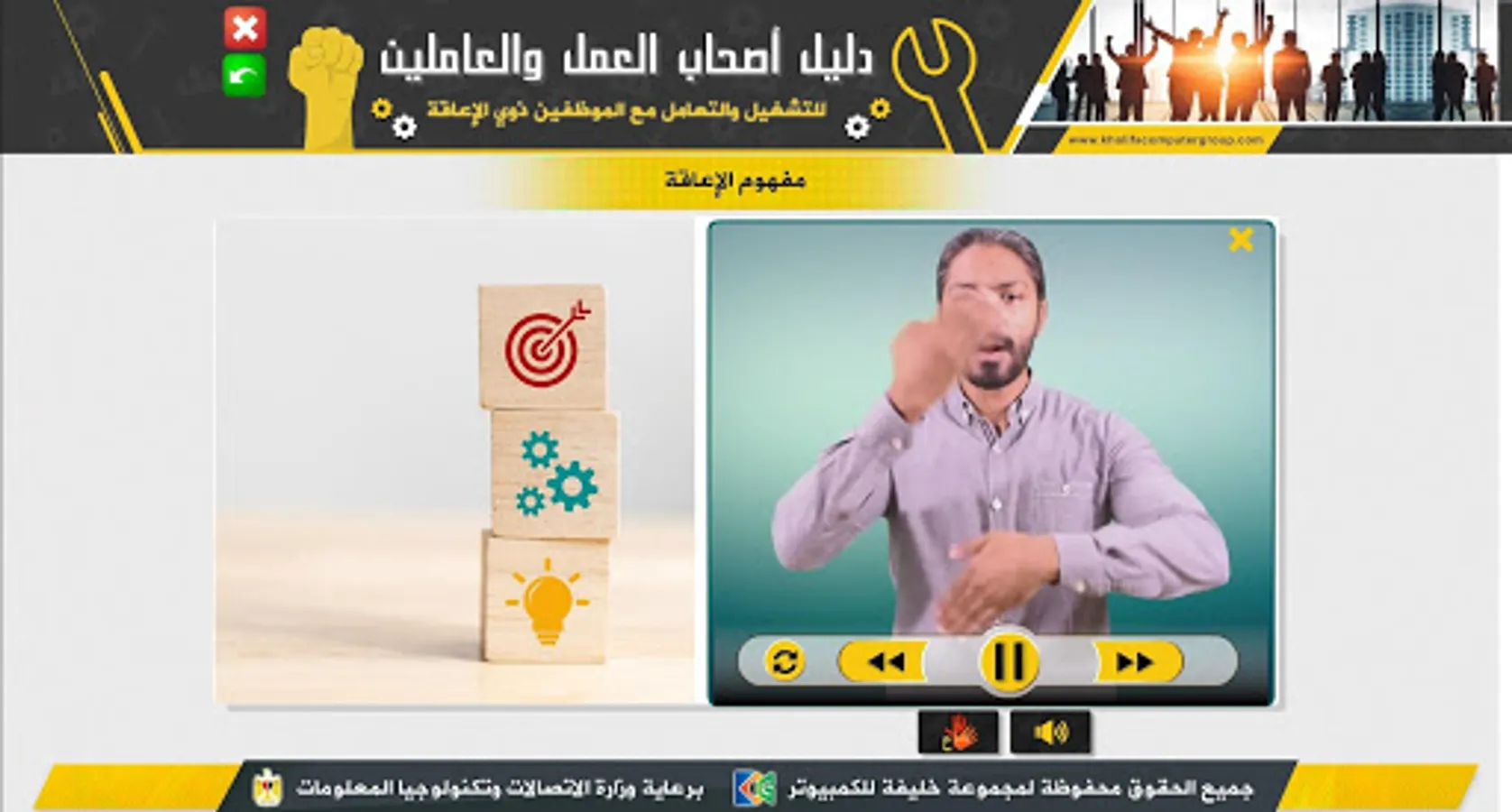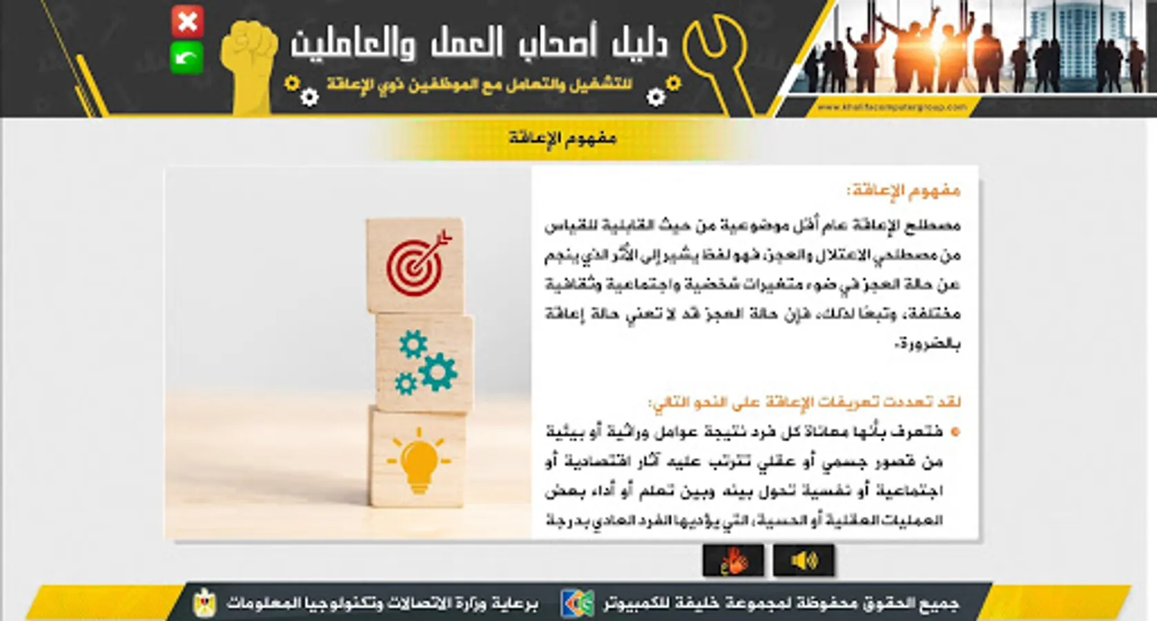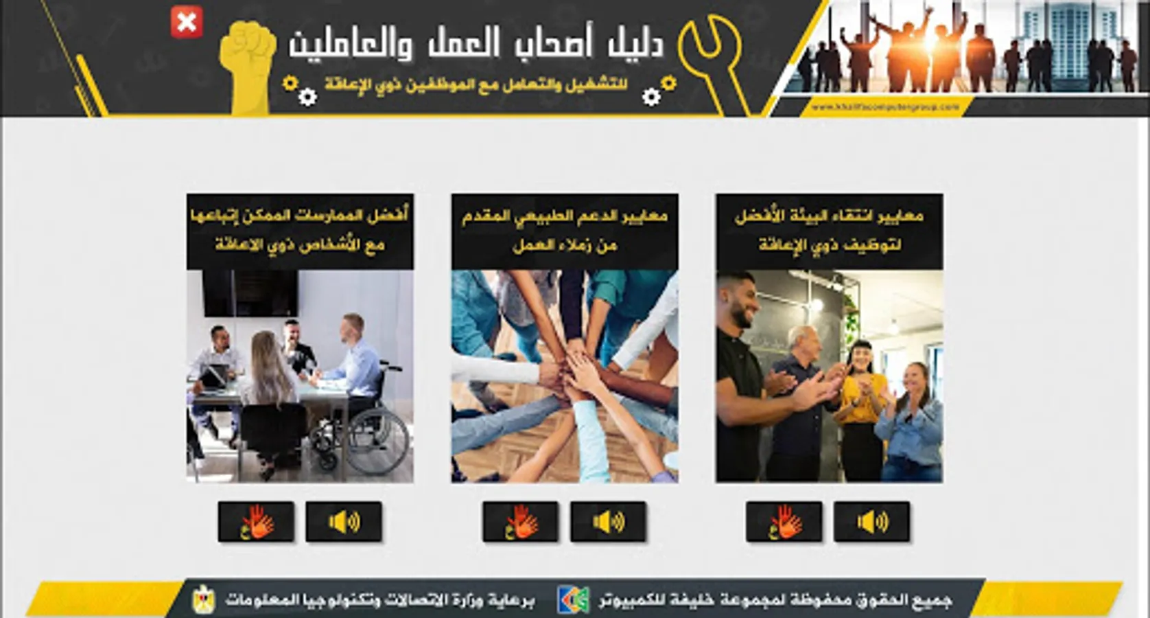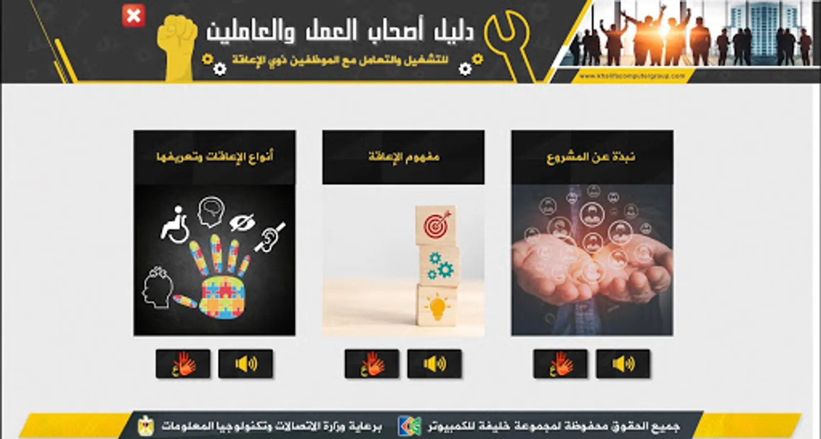 It is an educational application that serves as a guide for employers, whether in the private or public sector, as well as employees and workers concerned with helping them to identify the best ways and practices in dealing with persons with disabilities in terms of employment and dealing with them during work.