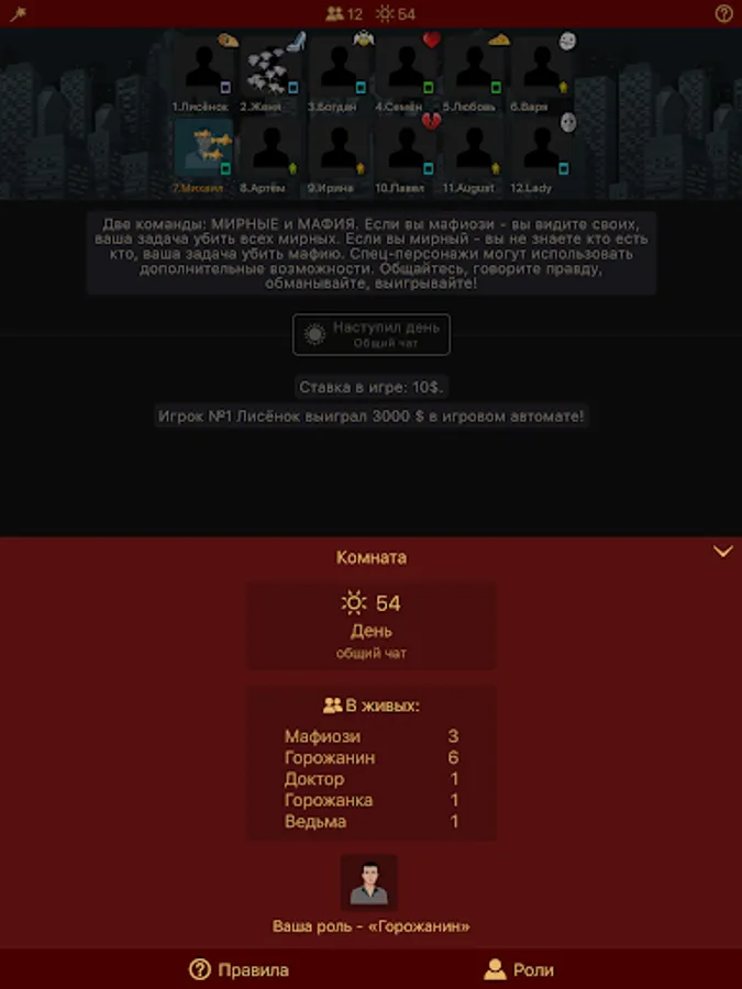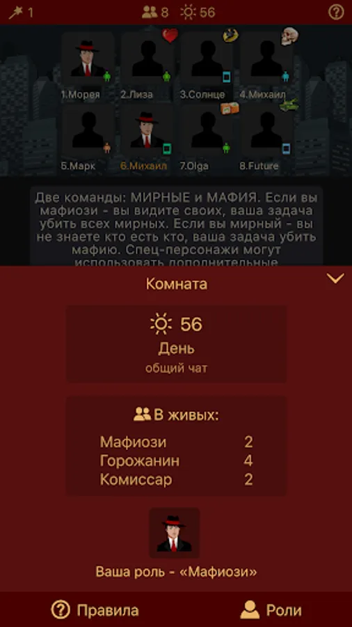 - Seven roles: mafia, city dweller, city dweller, doctor, commissioner, killer, don