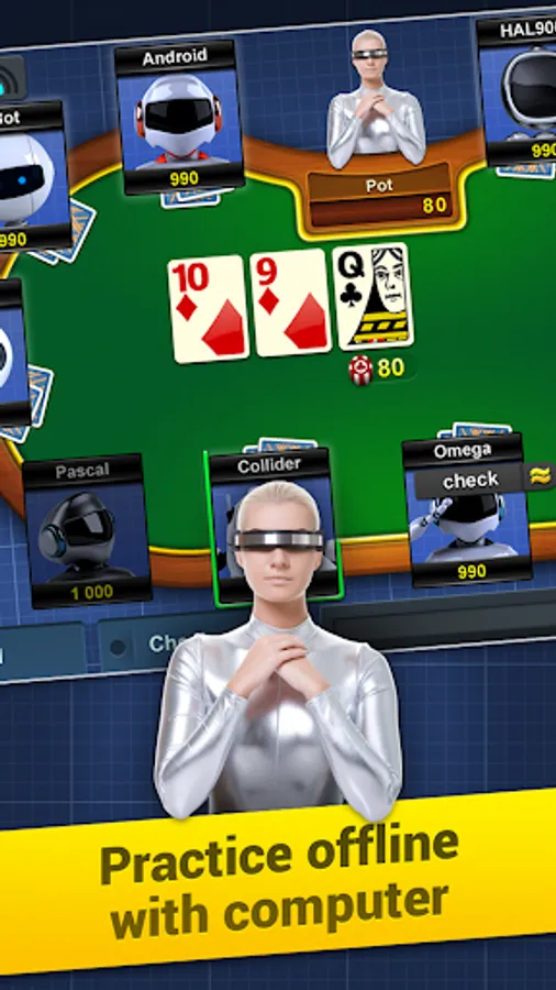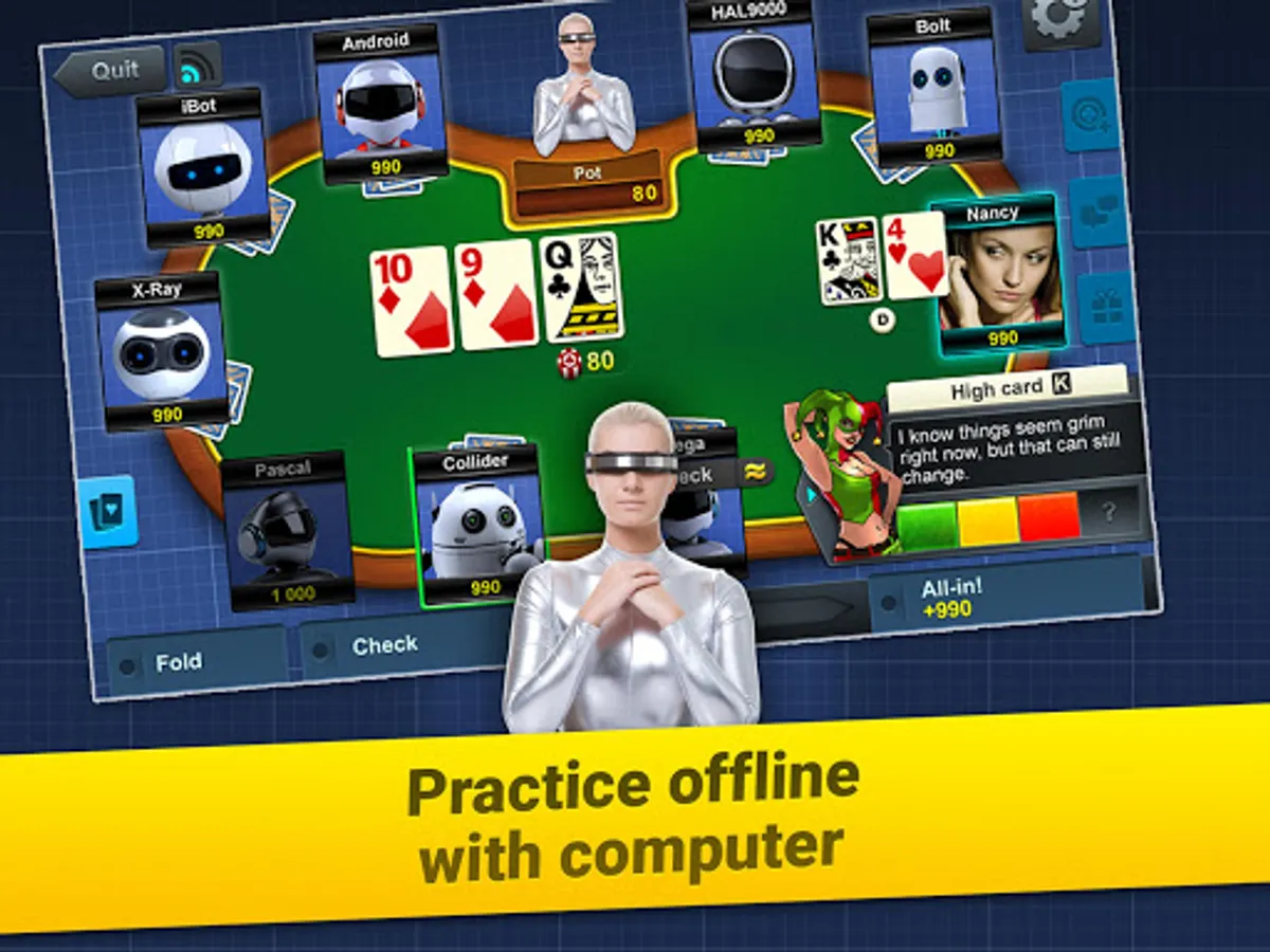 Finally, you can play Poker Arena offline: hone your poker skills in the dramatic single player poker campaign called “Trixie’s Story” or via Training mode, competing against virtual poker opponents!