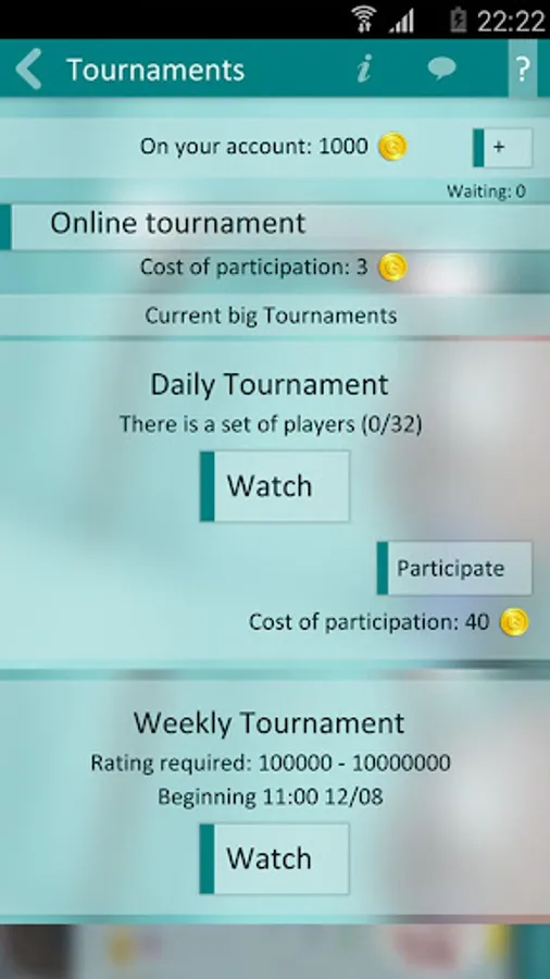 • Tournament. Compete by going from a daily tournament to a weekly and monthly (64 and 128 players).