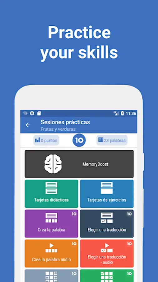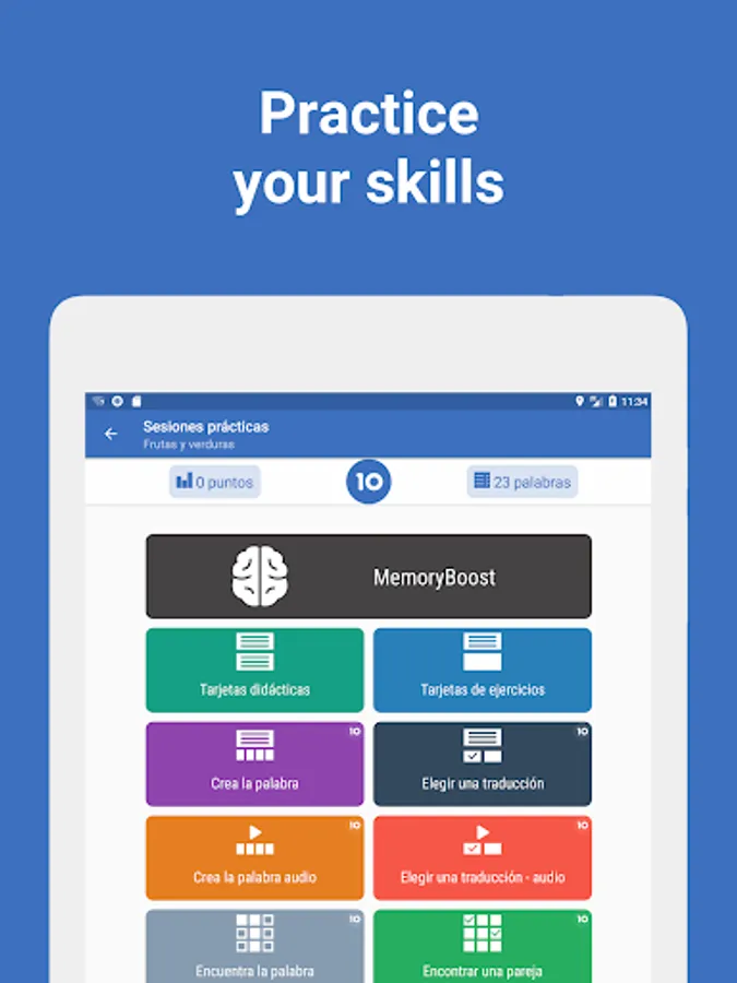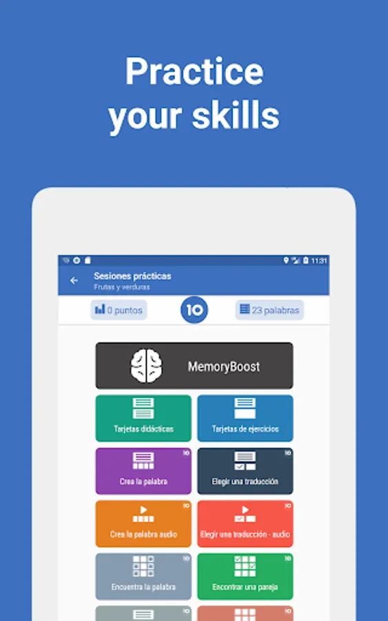 - 10 unique exercises, each teaches the specific skill of the language being studied.