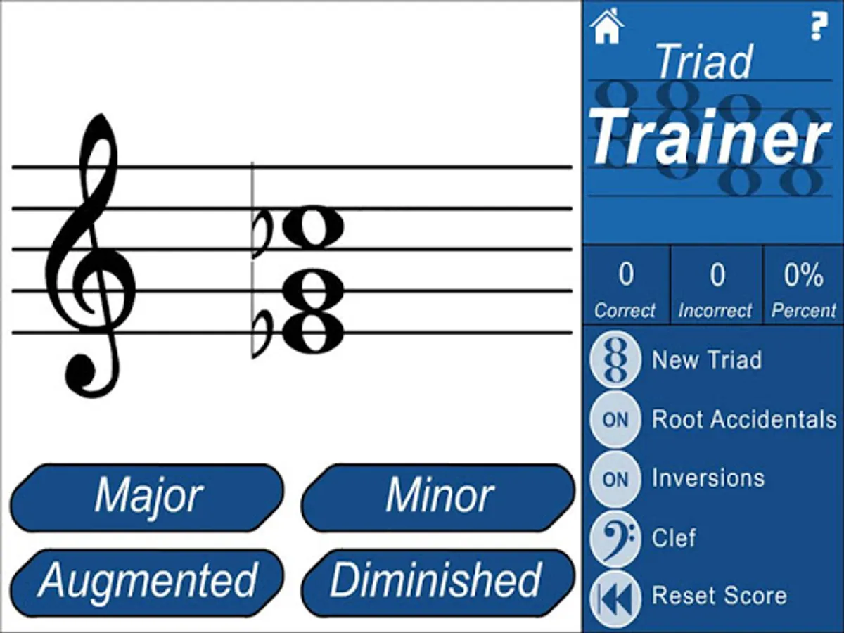 Triad Trainer is designed to help you get a better understanding of recognizing Major, Minor, Augmented and Diminished chords on the Treble and Bass Clef.