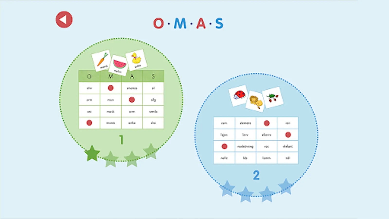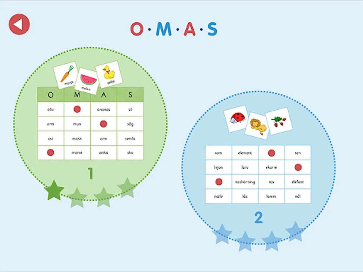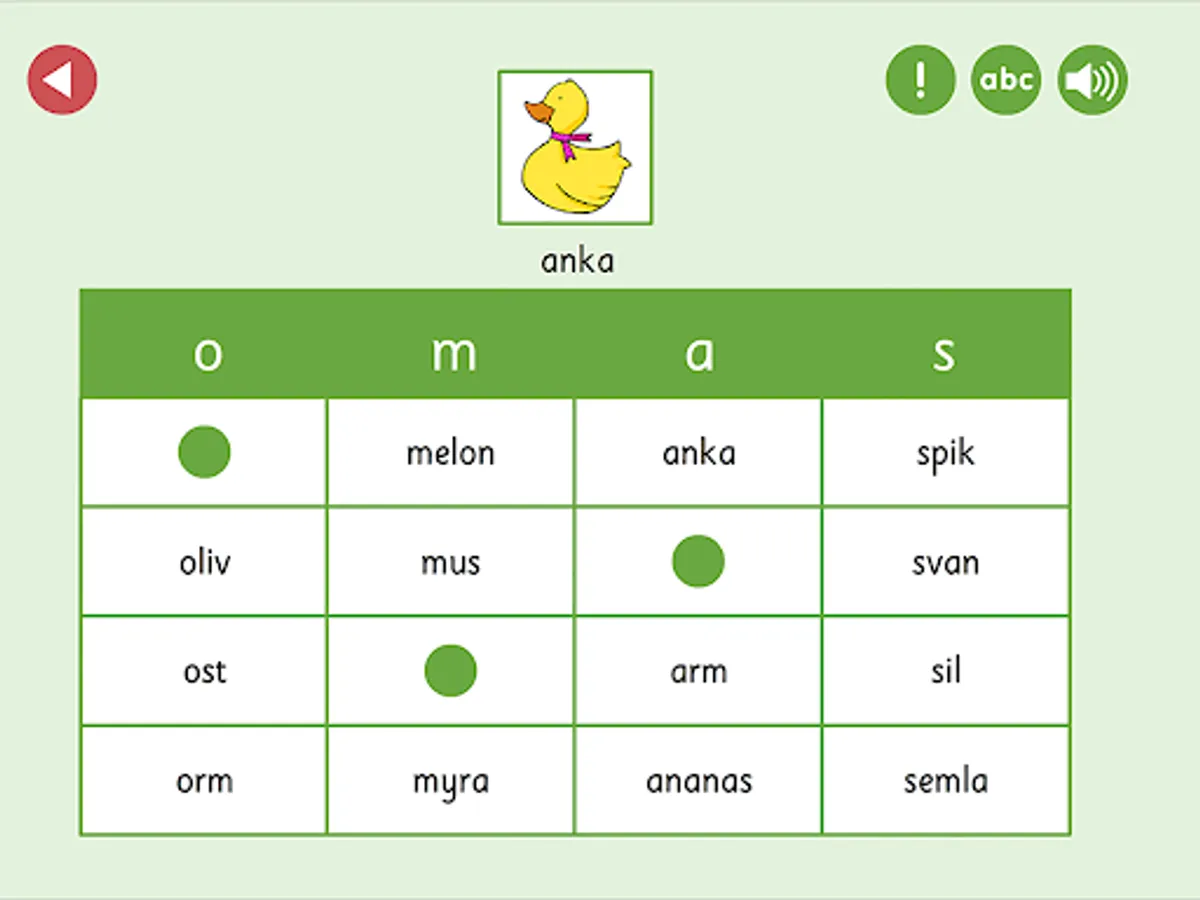 ABC bingo specifically trains the ability to identify the first sound in words and read short words. Tap the picture and listen. Which sound is heard first? What letter does the word start with? Look for the word in the correct column, or on the game board if you chose level 2. When the entire bingo tile is filled, the game round is over and the player gets a star as a reward.