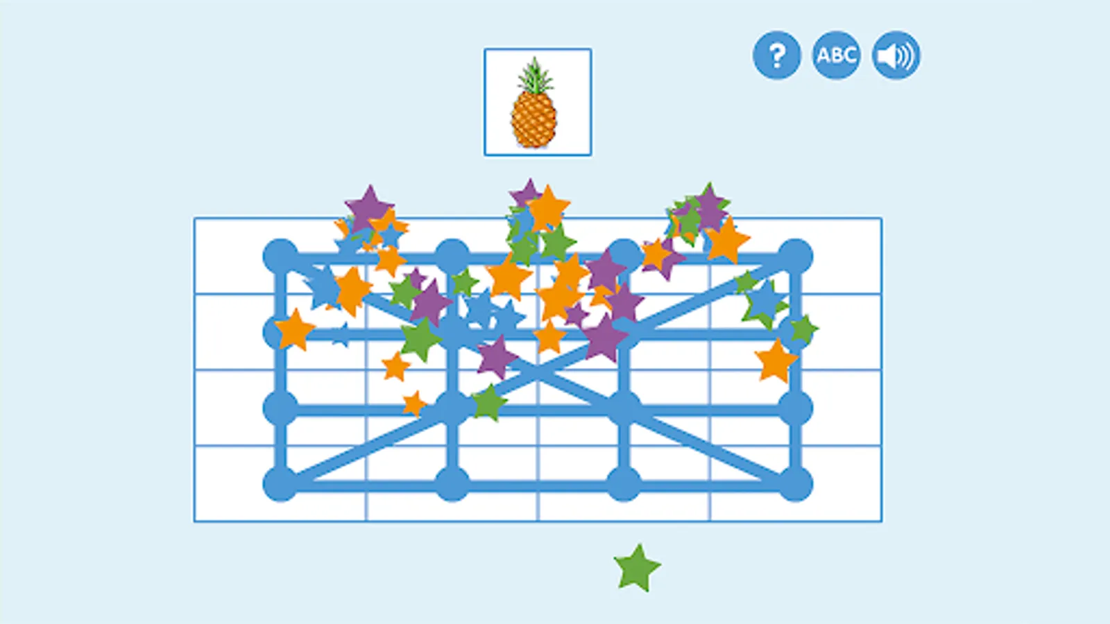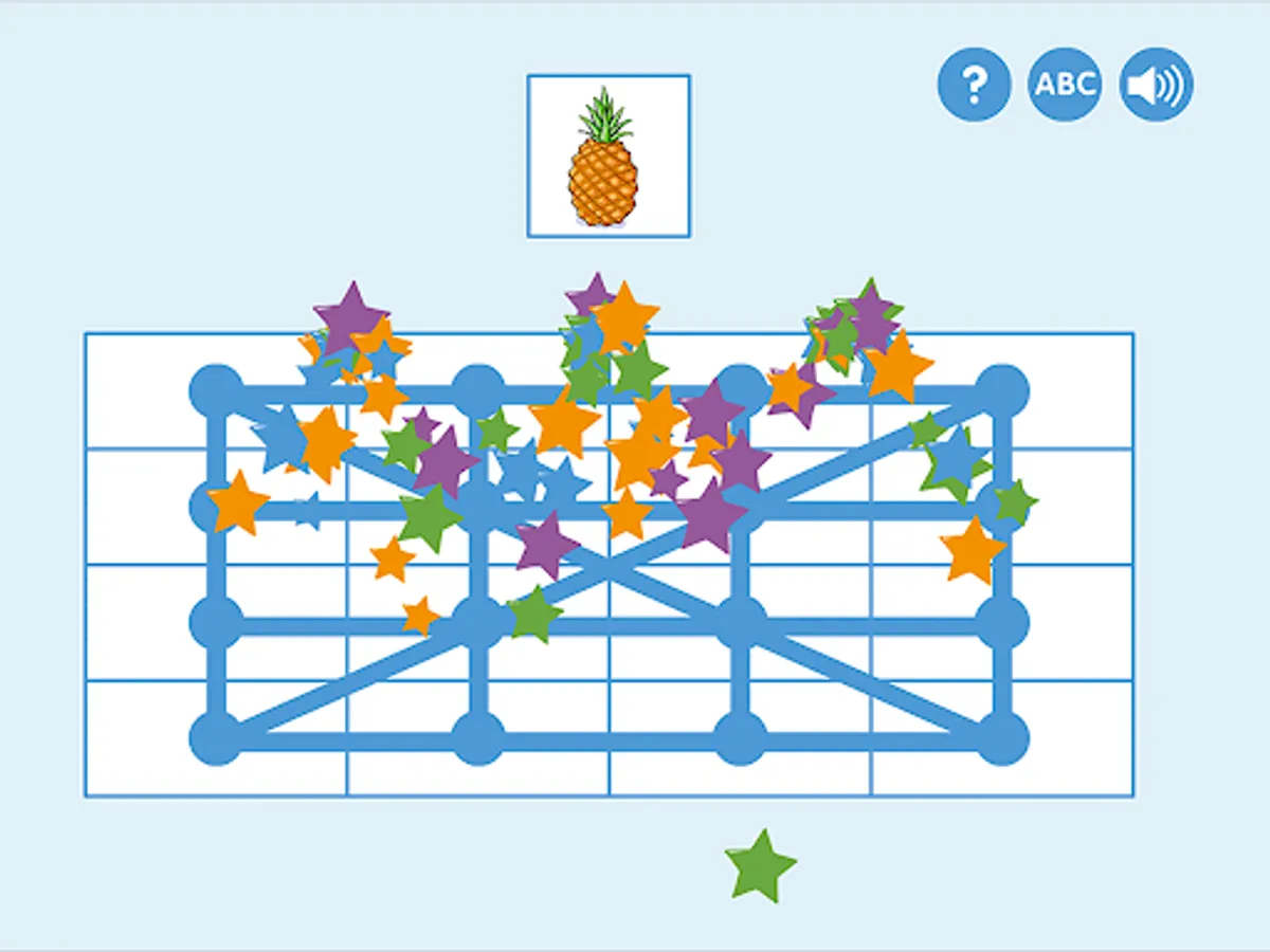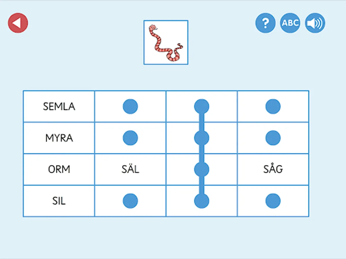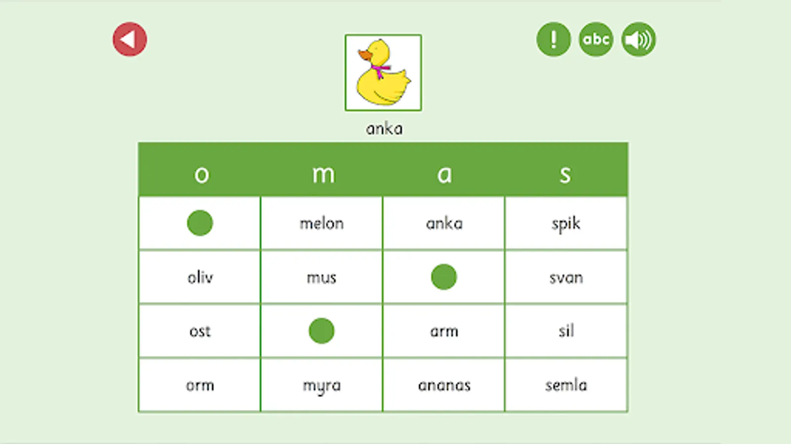ABC bingo specifically trains the ability to identify the first sound in words and read short words. Tap the picture and listen. Which sound is heard first? What letter does the word start with? Look for the word in the correct column, or on the game board if you chose level 2. When the entire bingo tile is filled, the game round is over and the player gets a star as a reward.