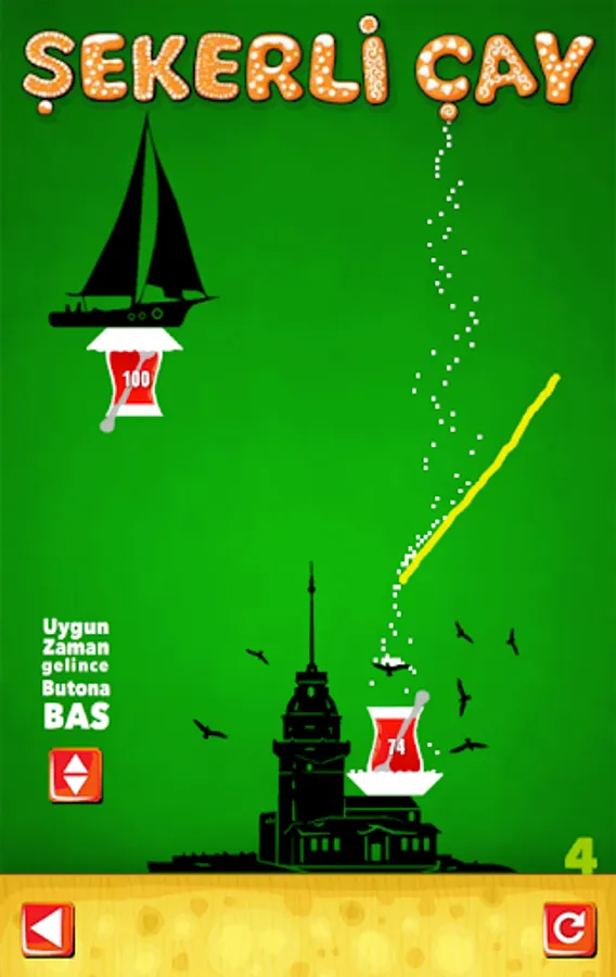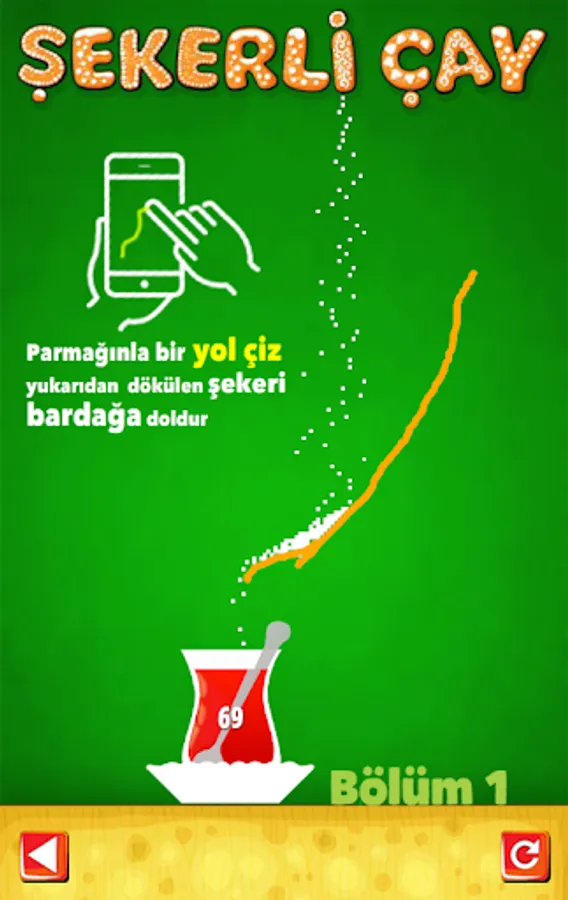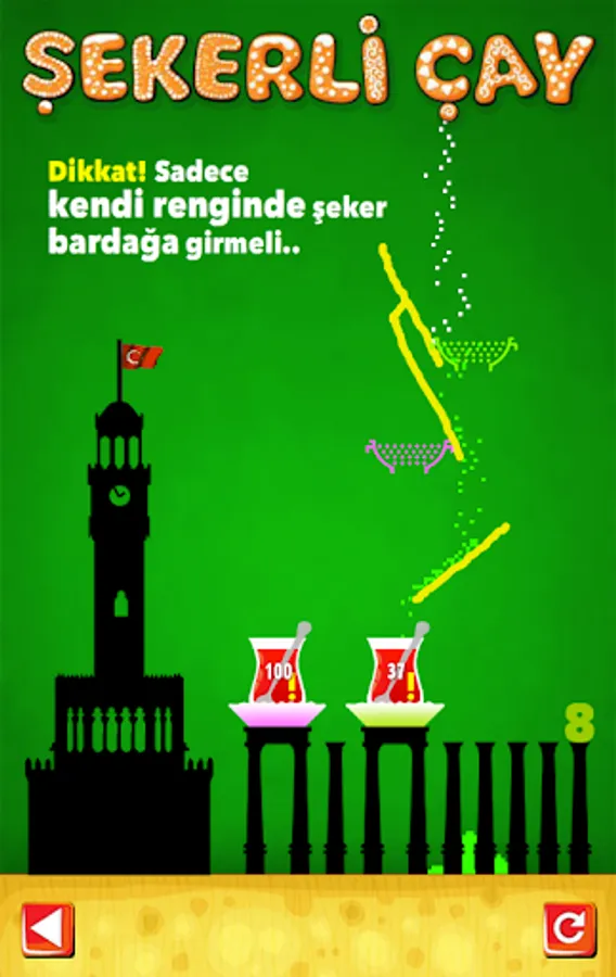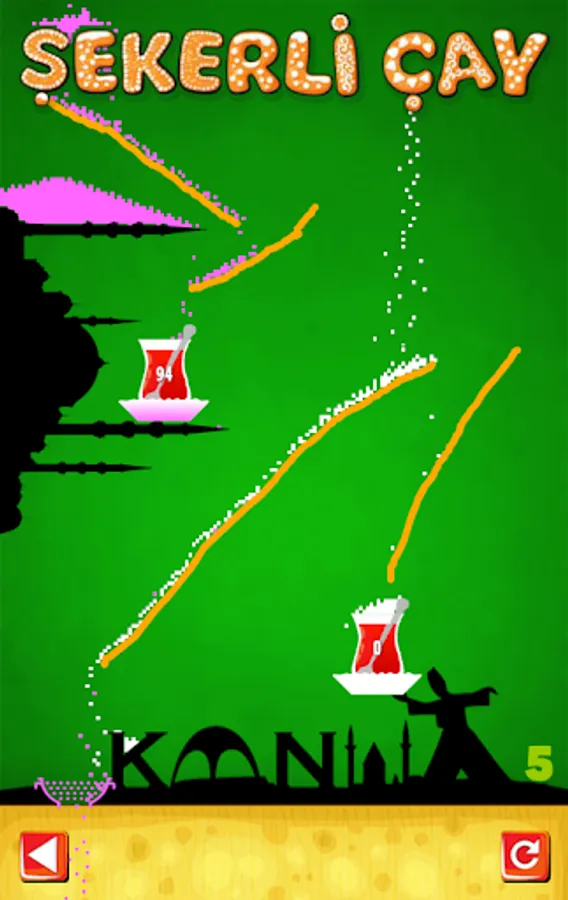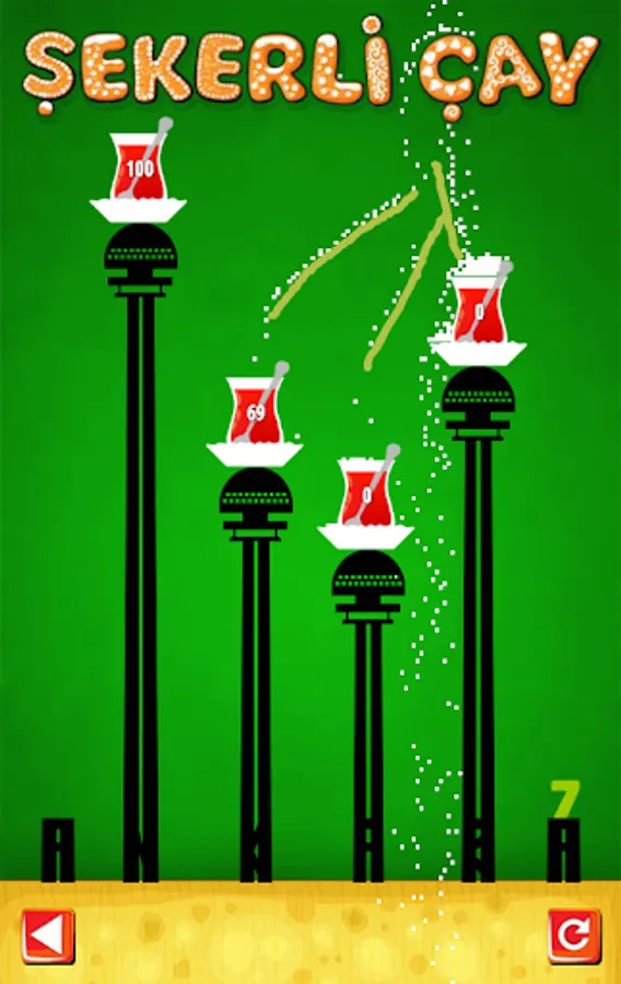 Draw the falling sugar particles in suitable ways with your finger to reach the tea cups. Obtain colored candy by using coloring filters in some sections. Reach the unreachable glasses by reversing gravity.