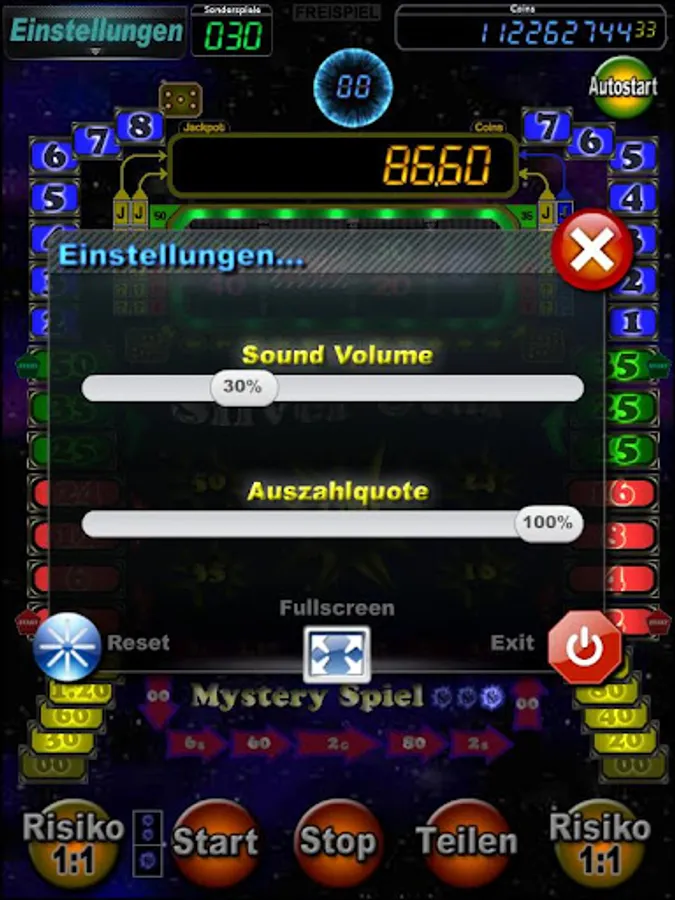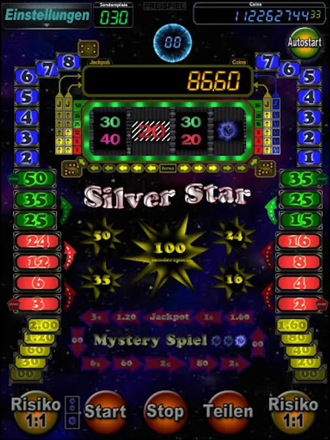 The Silver Star is inspired by a German game system, this machine is fictitious from us. The Mystery game and the fourth roller with blue games promise a lot of variety within the meaning of fun. In addition, there are red and green special games with 6 bonus arrows that accompany the risk. The musical supports are adjusted by using the Game Mp3 samples. The jackpot includes a complete song sung. The Coins are free and are automatically refilled.