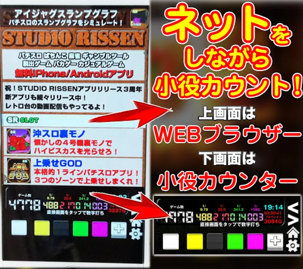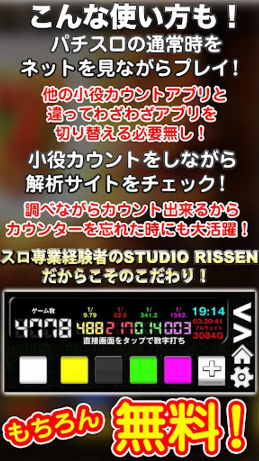 目押し不要仕様の台が増えてる中、をしながら打つ人が多くなってますが、このアプリなら万事解決!スマホをカウンター代わりにして、スマホがいじれない。。なんてこともこれでオサラバです!