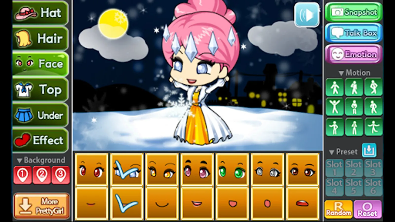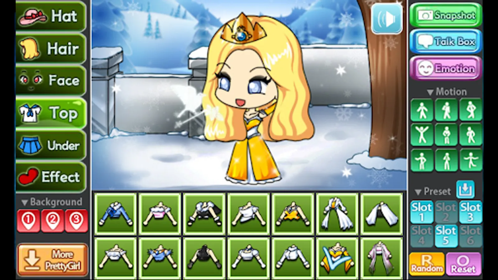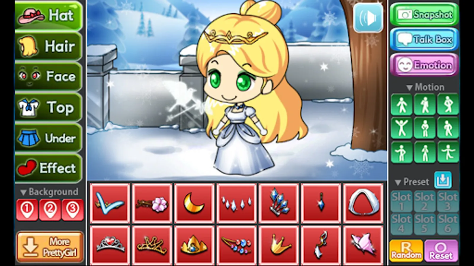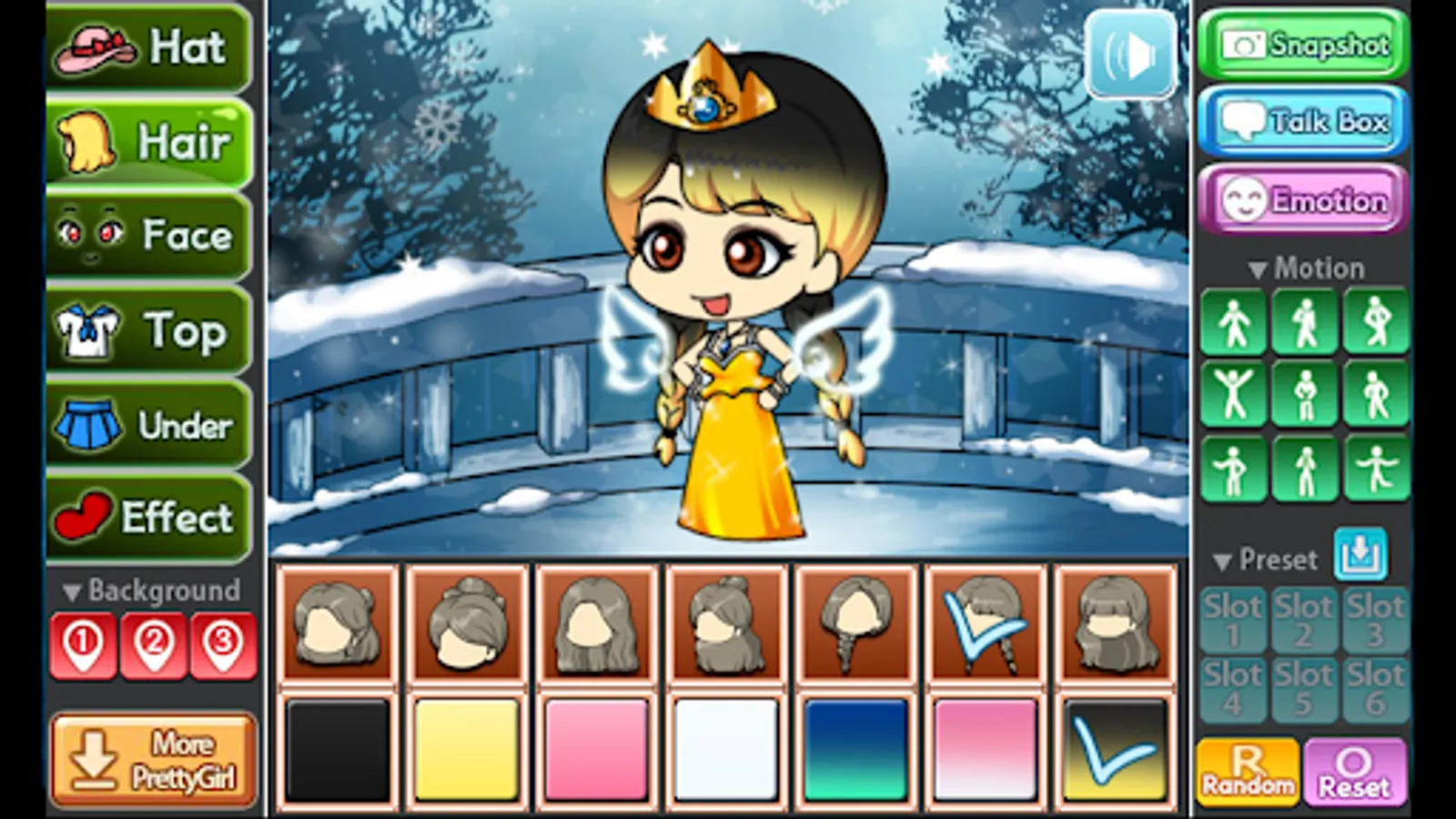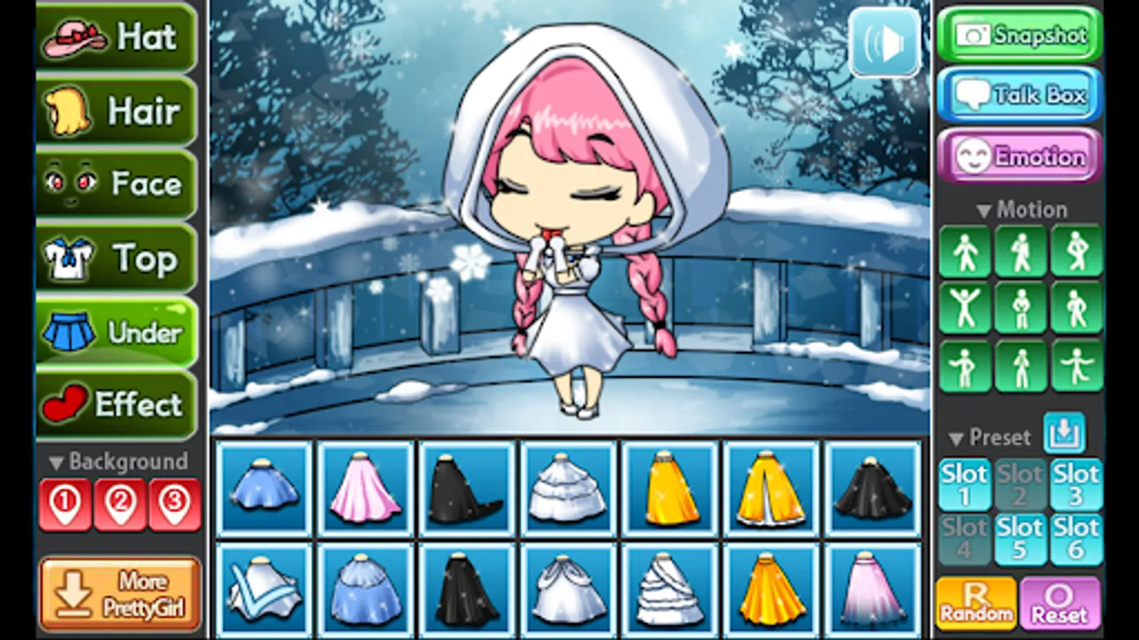 You can change the background, 9 poses and motions, you can also store your Pretty Girl in 6 slots.