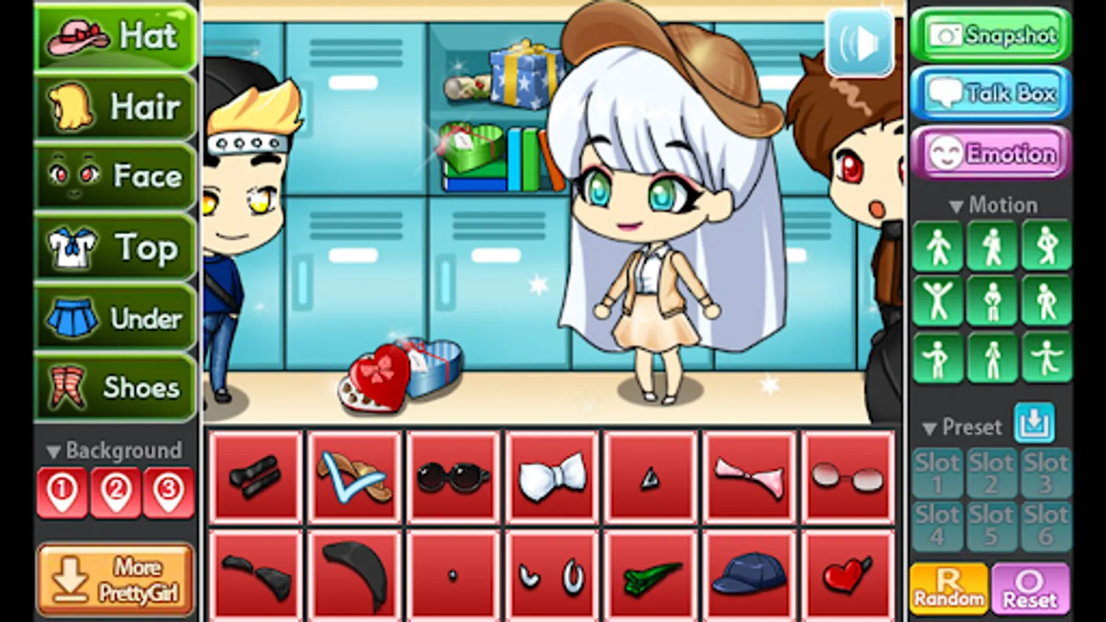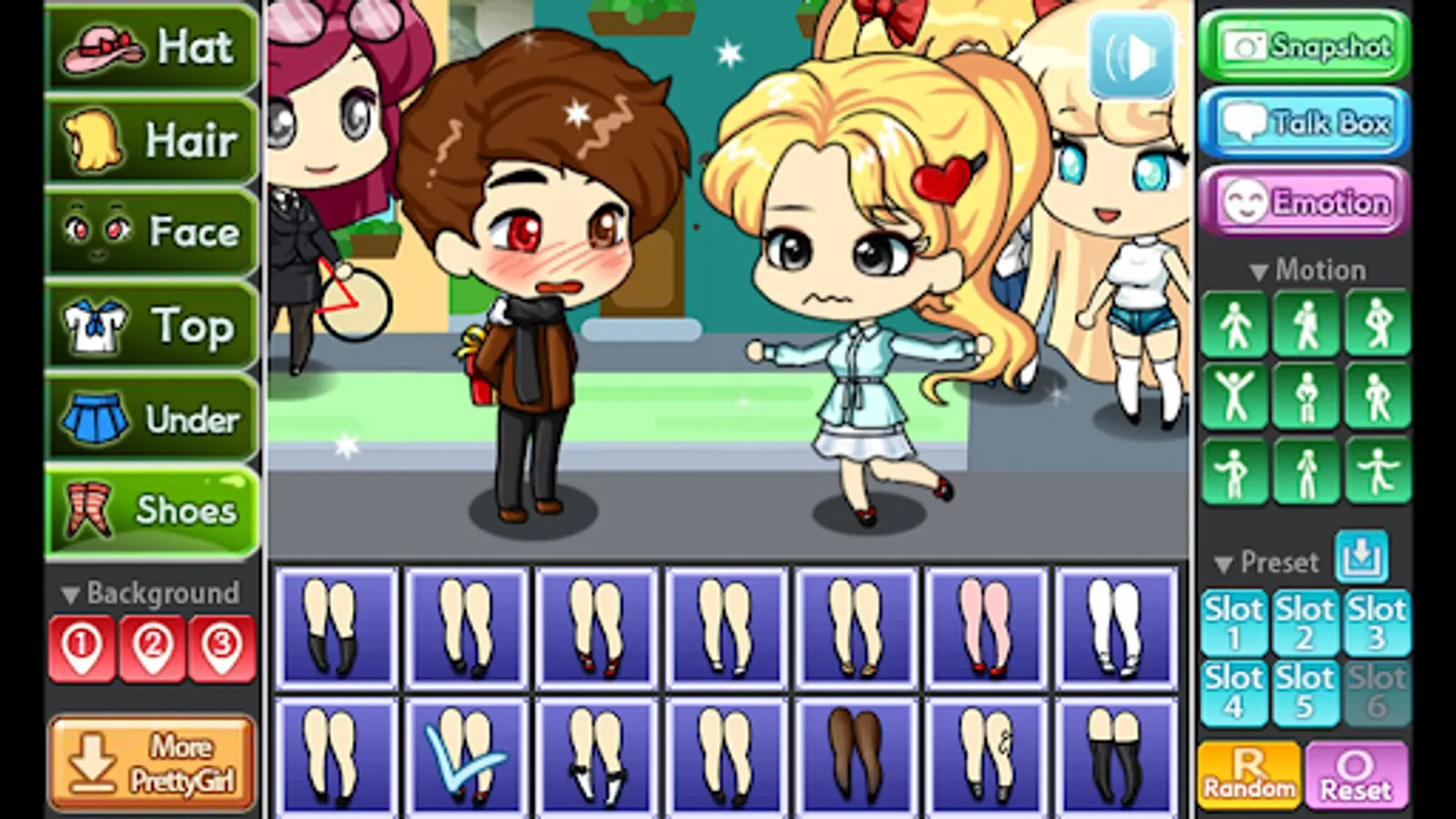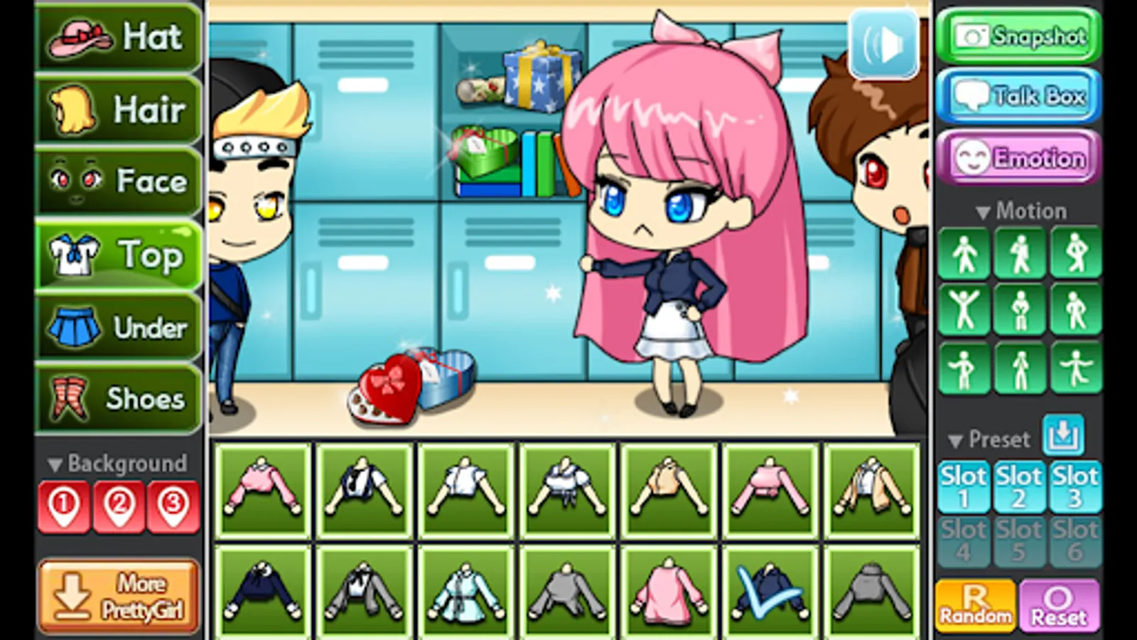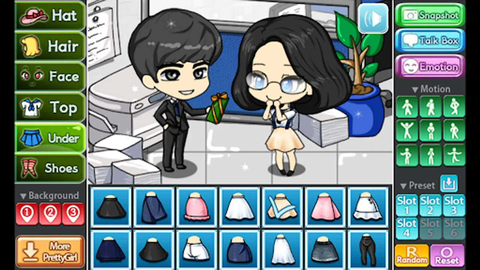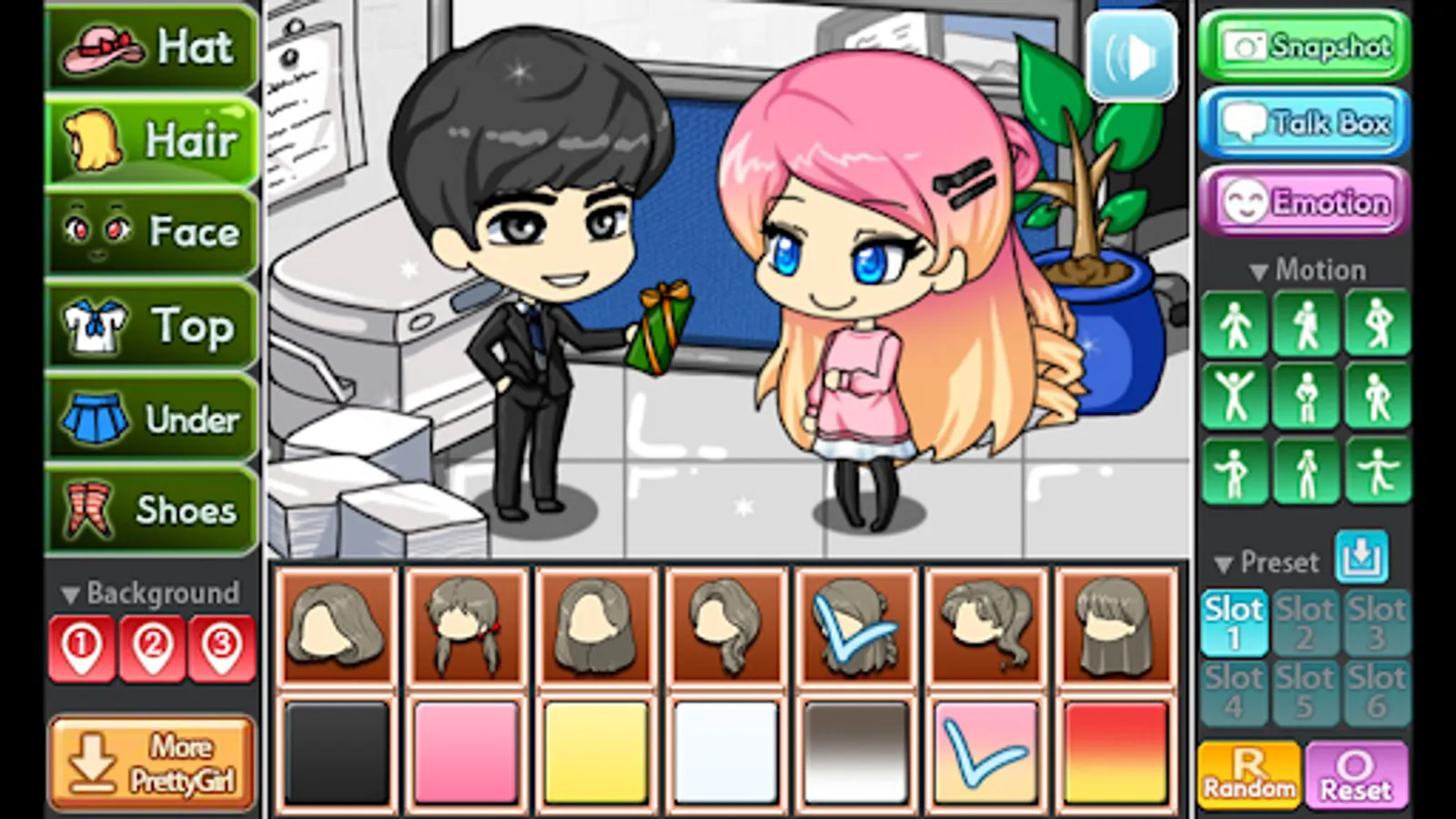 You can change the background, 9 poses and motions, you can also store your Pretty Girl in 6 slots.